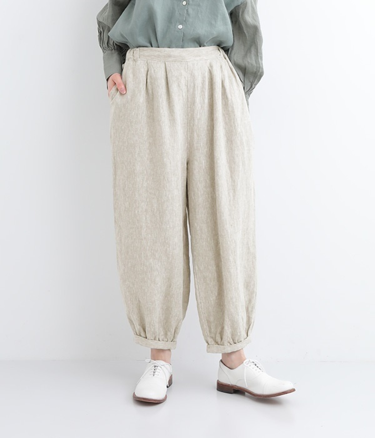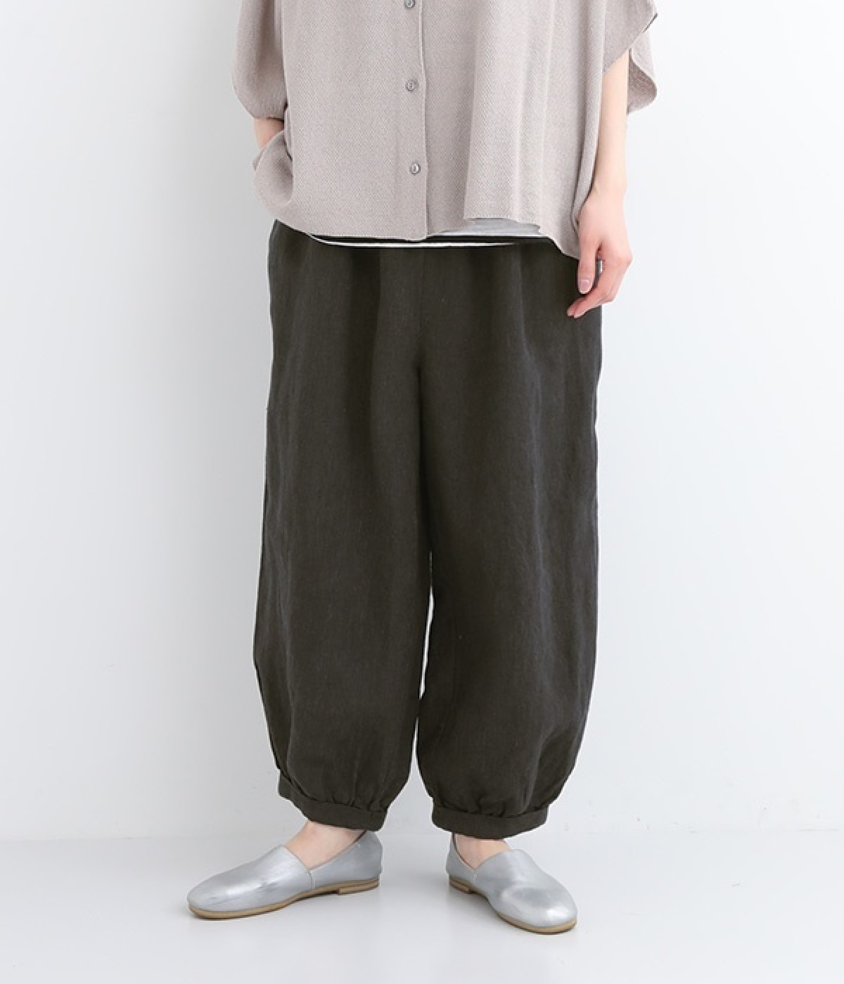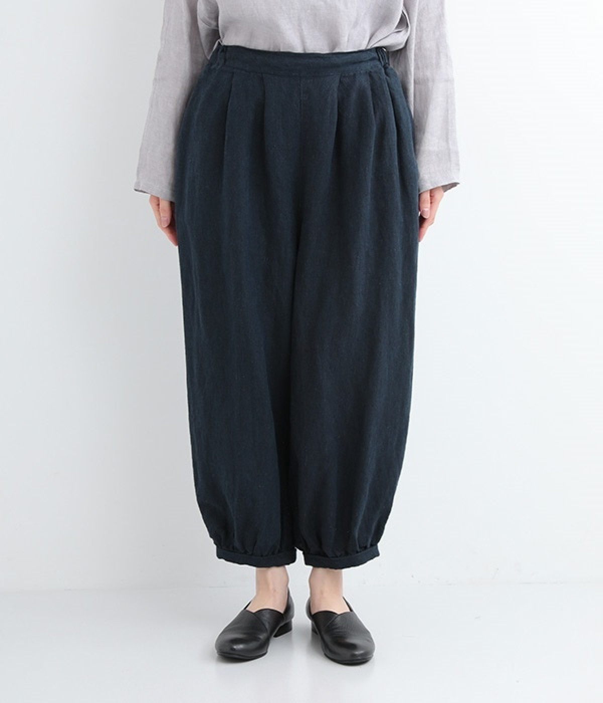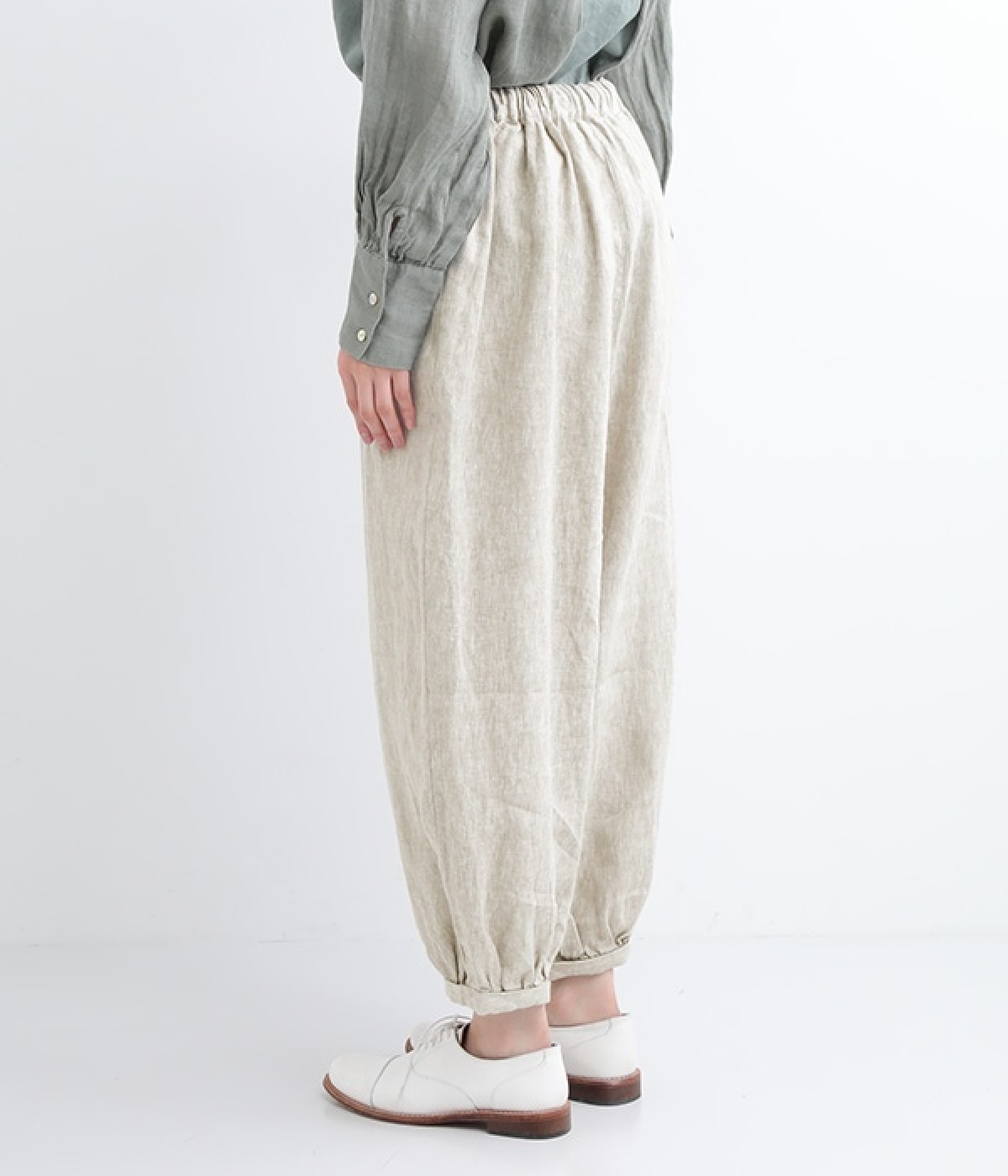 ウエストにタックを入れてたっぷりとボリュームをもたせ、裾ギャザー&カフスで自然な立体感をつけました。ナチュラル素材でデイリーに取り入れやすく、それでいてスタイリングを新鮮に魅せてくれます。後ろウエストゴムに内紐入り。