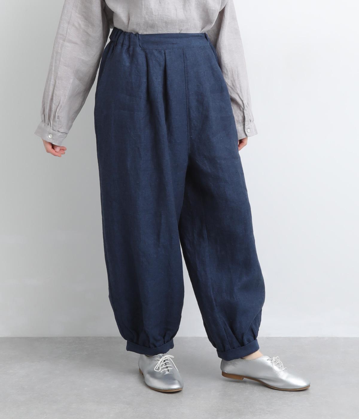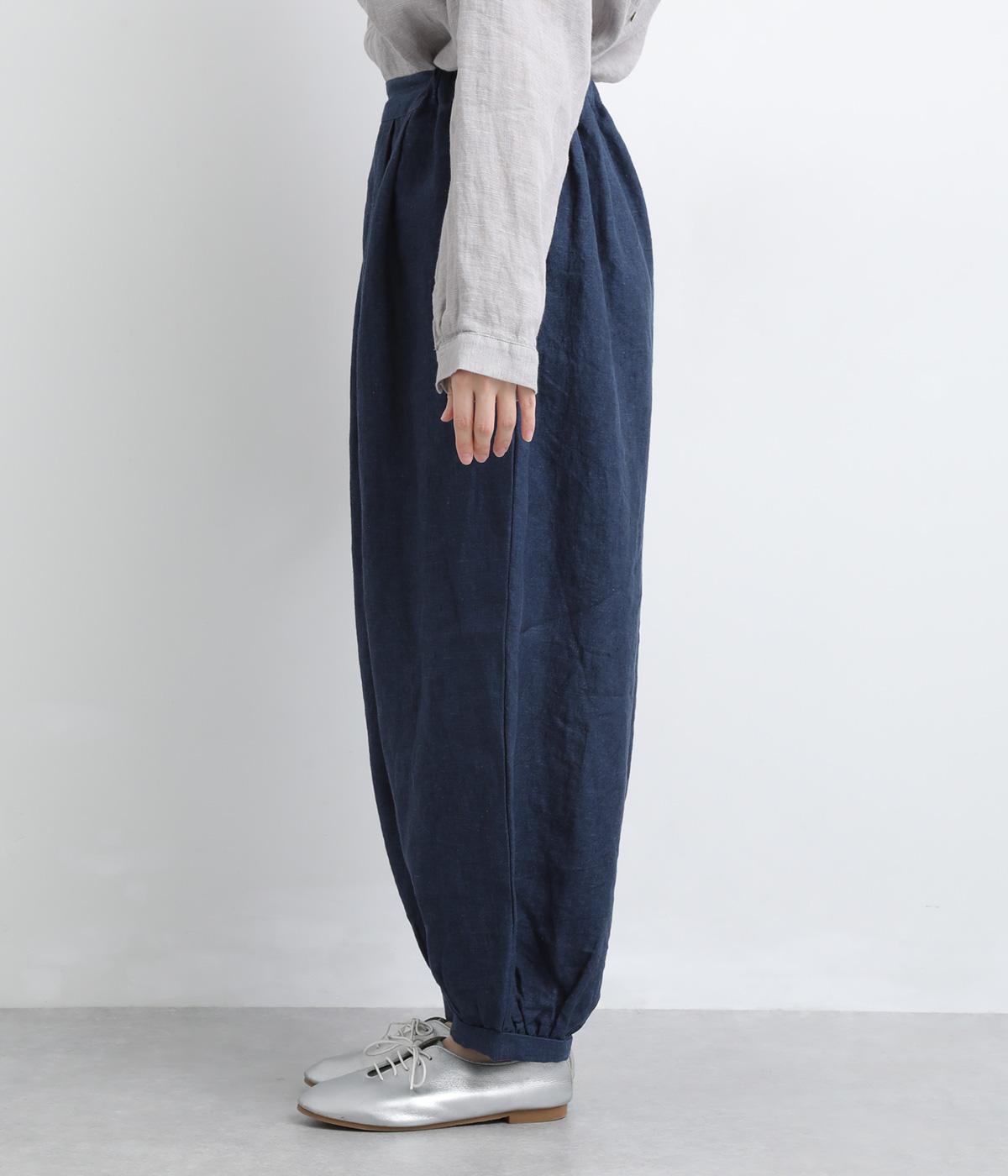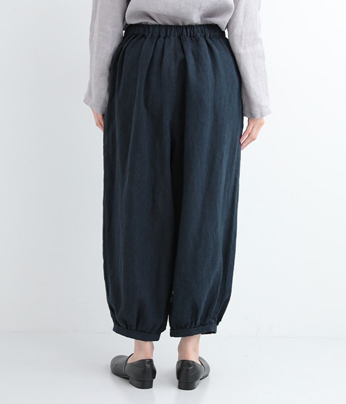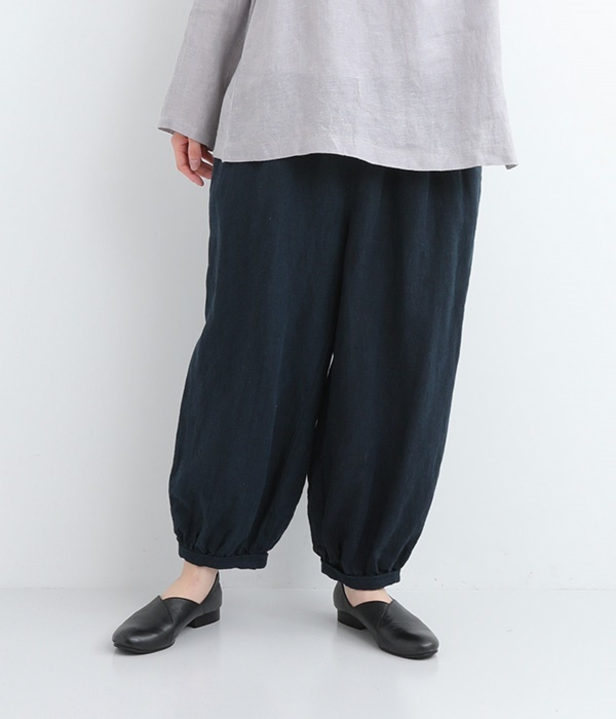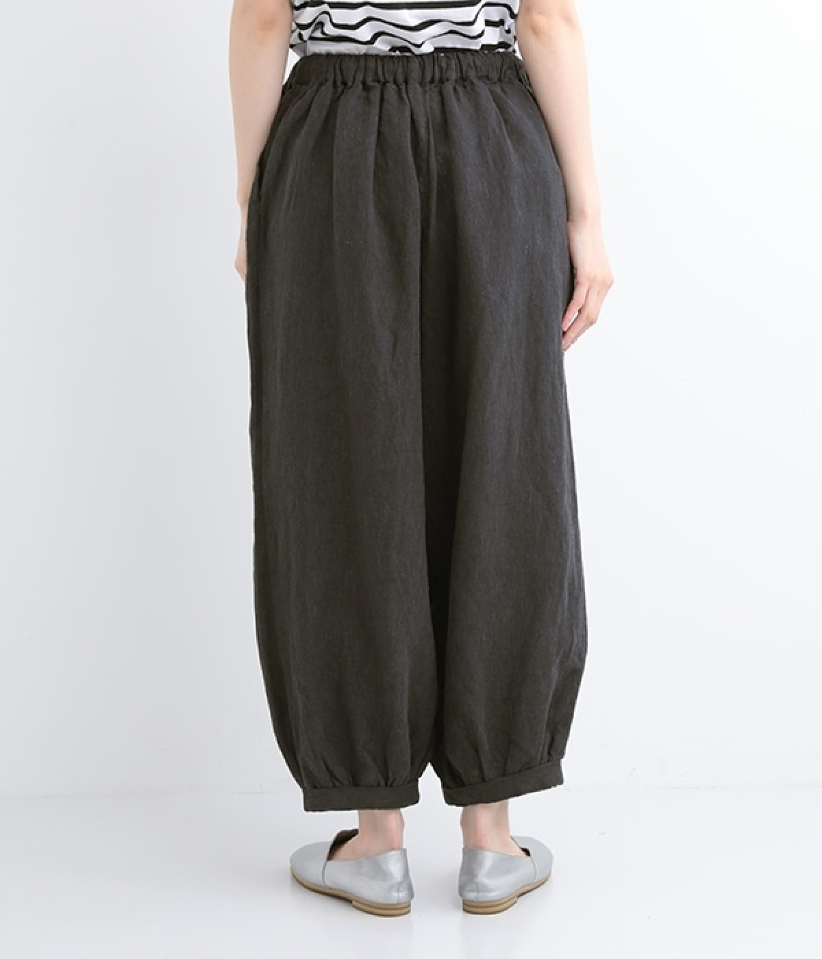 ウエストにタックを入れてたっぷりとボリュームをもたせ、裾ギャザー&カフスで自然な立体感をつけました。ナチュラル素材でデイリーに取り入れやすく、それでいてスタイリングを新鮮に魅せてくれます。後ろウエストゴムに内紐入り。