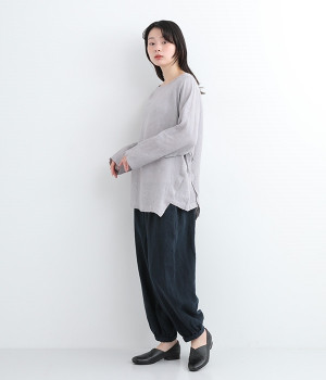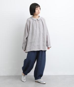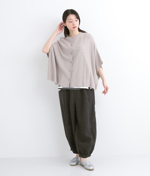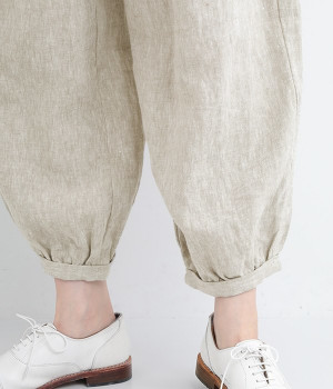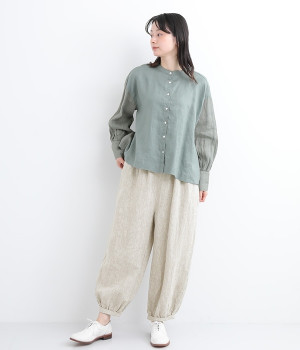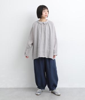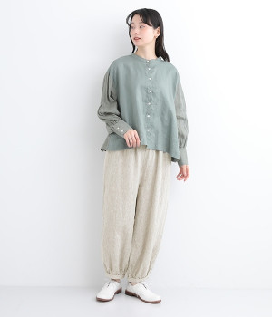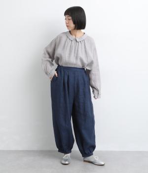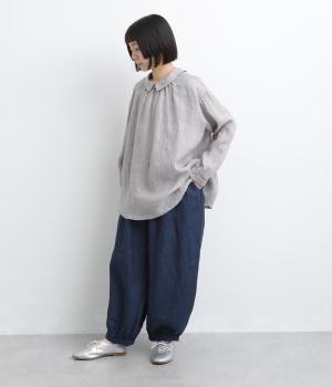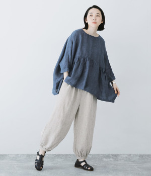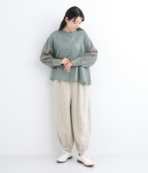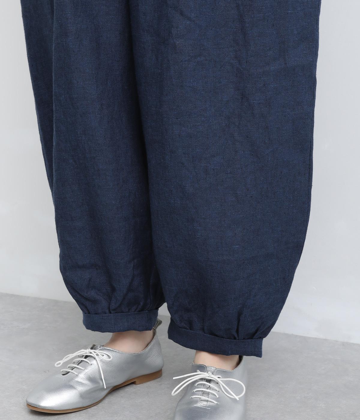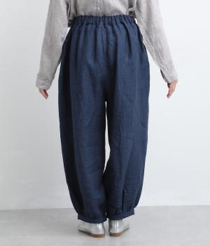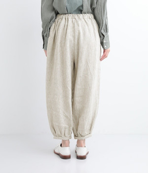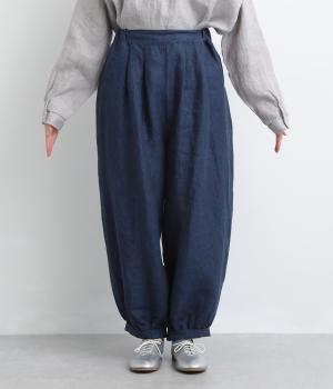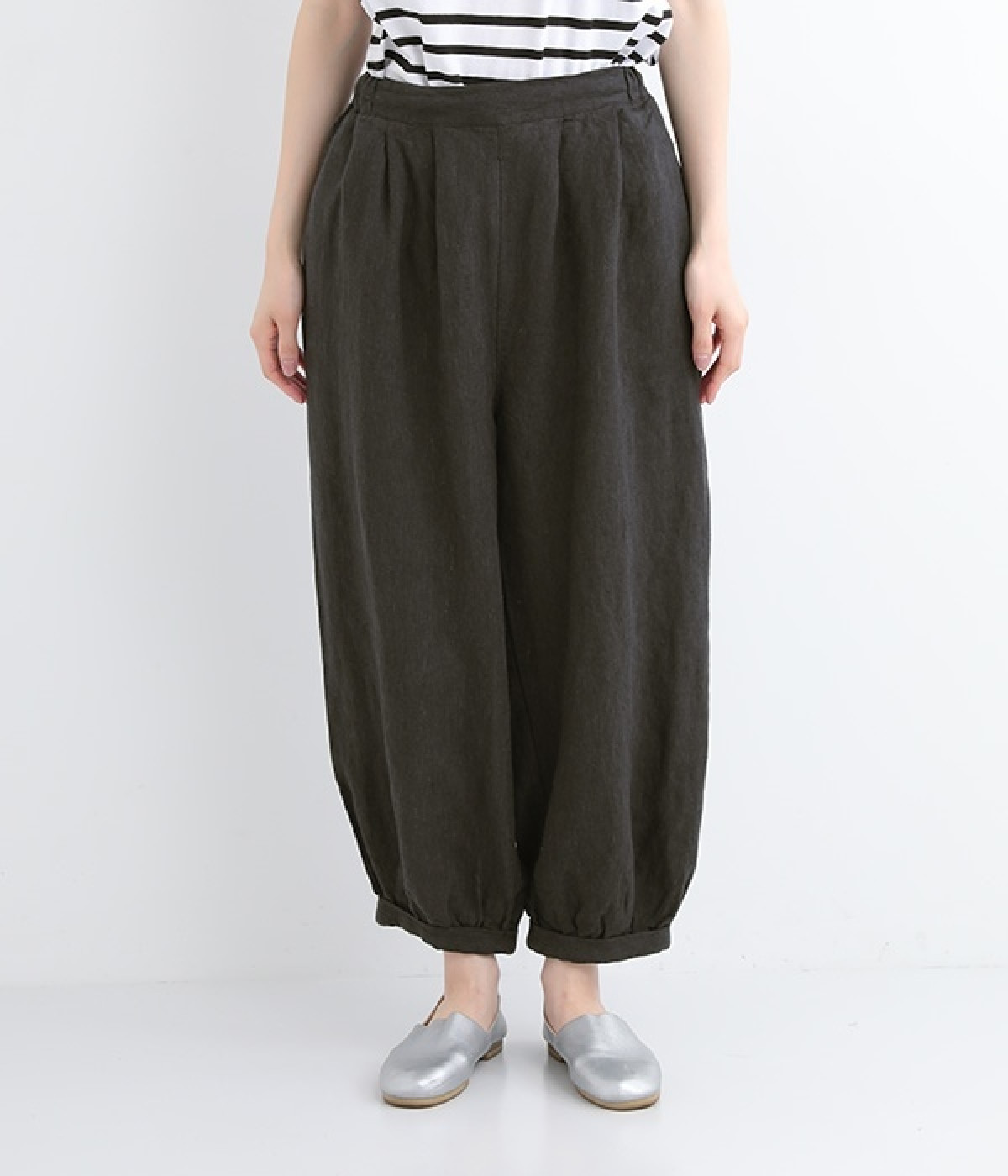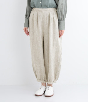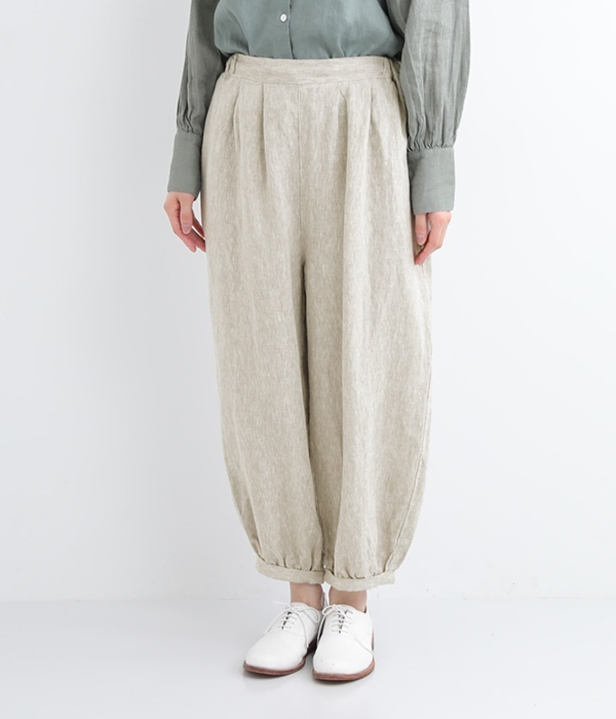 ウエストにタックを入れてたっぷりとボリュームをもたせ、裾ギャザー&カフスで自然な立体感をつけました。ナチュラル素材でデイリーに取り入れやすく、それでいてスタイリングを新鮮に魅せてくれます。後ろウエストゴムに内紐入り。