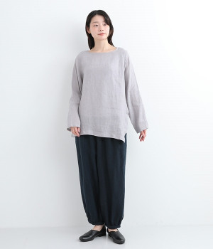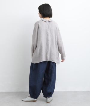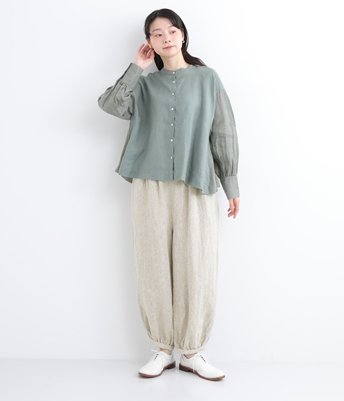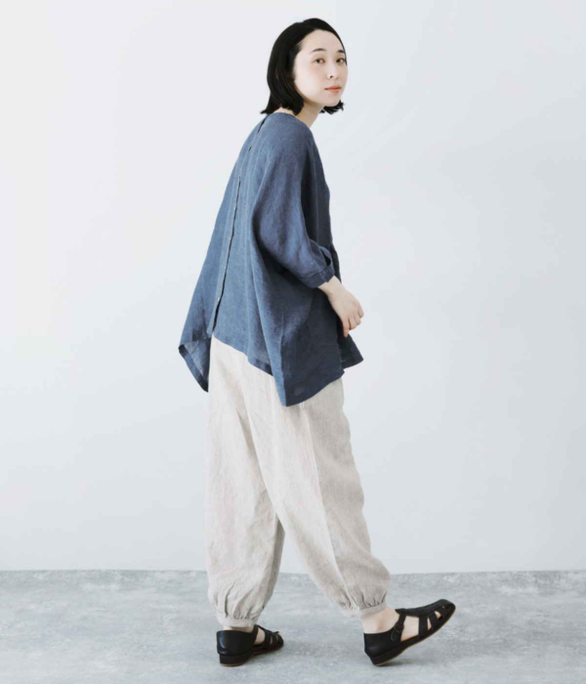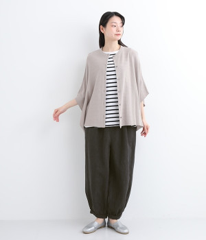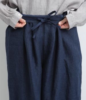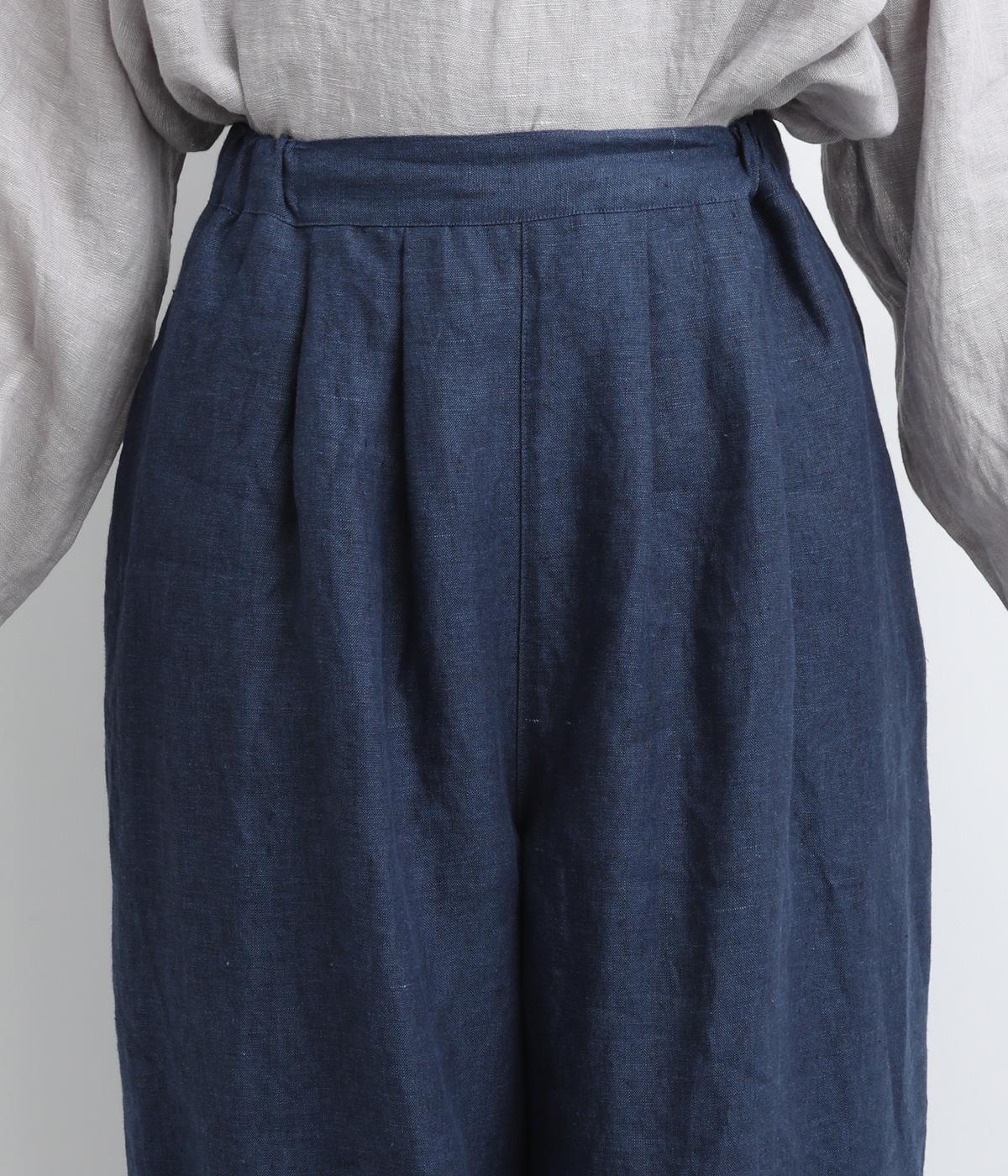 ドライタッチが心地よい、ざっくりとしたナチュラルな質感が魅力のリネン仕立て。ほどよくコシがあり、はくほどに肌になじむ経年変化も楽しみ。シワも表情のひとつになるアイロン要らずな素材。