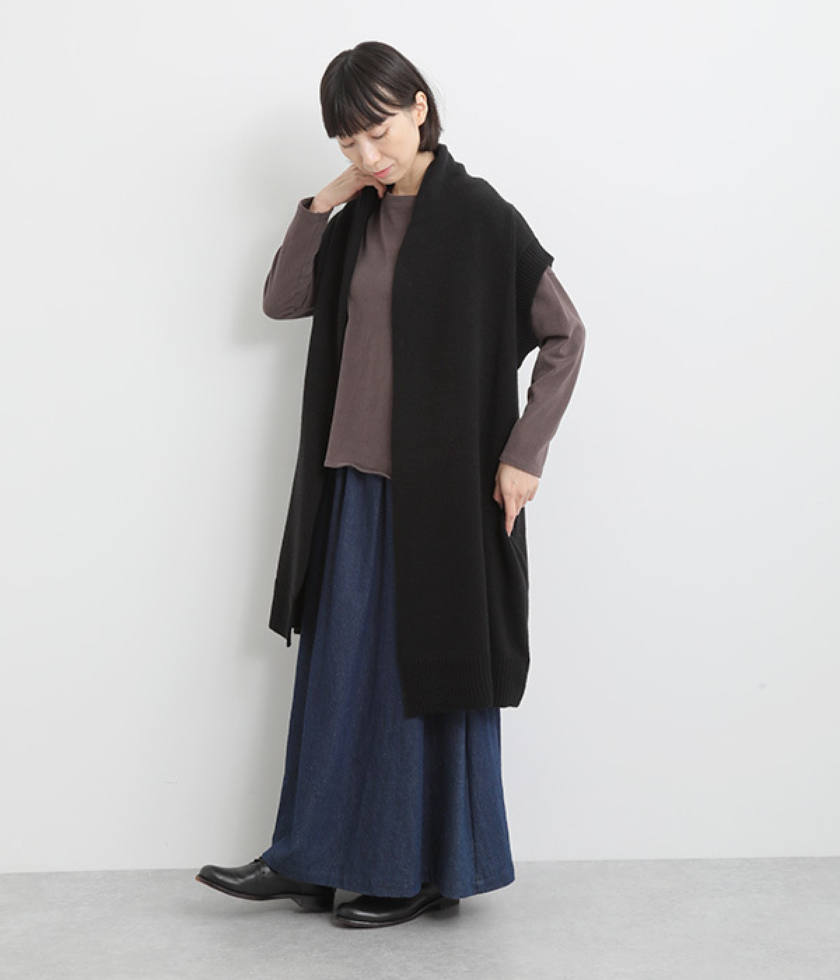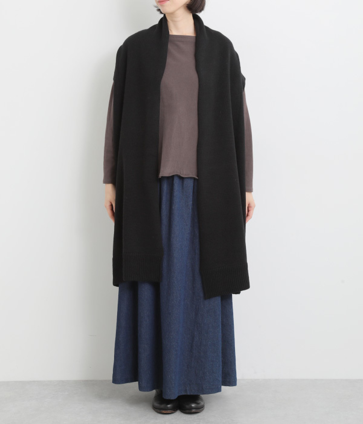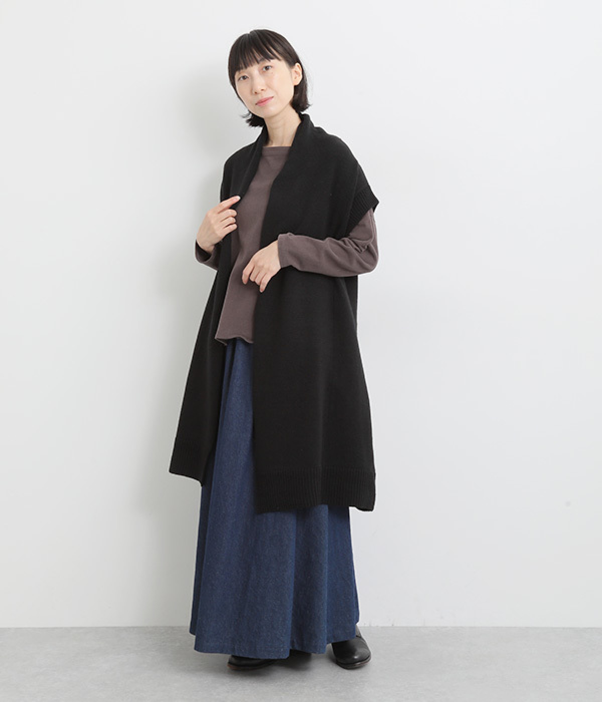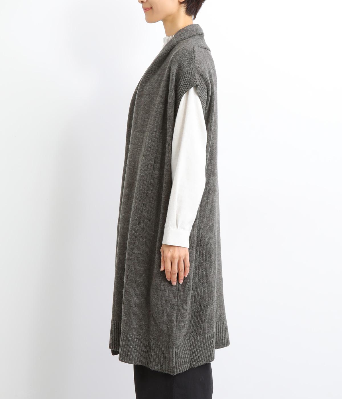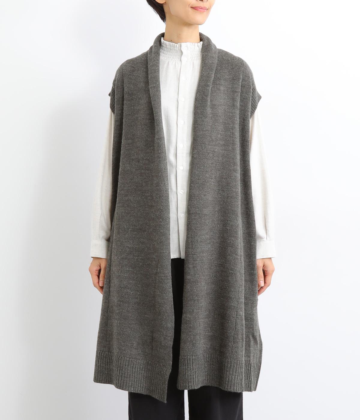 さっと羽織るだけでこなれ感が漂うボタンレスのロングベスト。ネック後ろに高さを持たせたデザインが首元の冷えを解消してくれます。ひざまで届く着丈が気になる体のラインをカバー。縦ラインが強調され、すっきりとした着こなしを叶えるうれしいアイテムです。