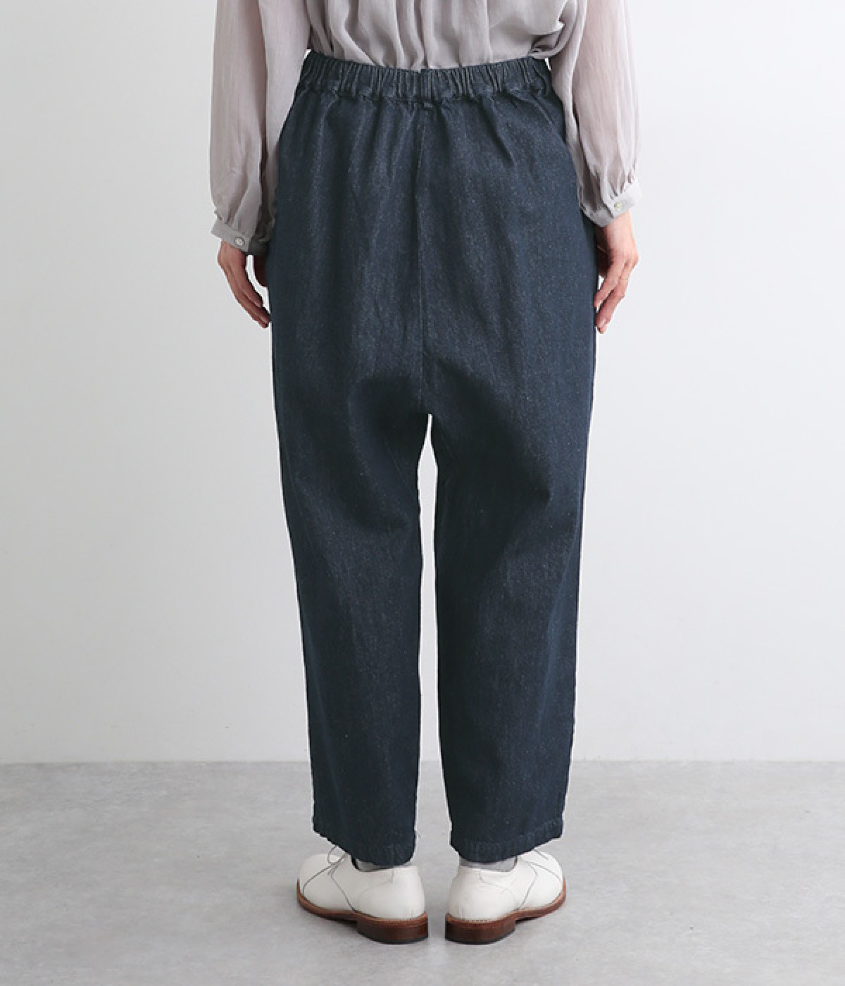 ヒップや腰まわりをゆったりとカバーする安心感のある股上と、ほどよくワイドなシルエットが大人のリラックススタイルにマッチする一枚。後ろウエストをゴム仕様にすることで、お腹まわりにもやさしいデザインに仕上げました。