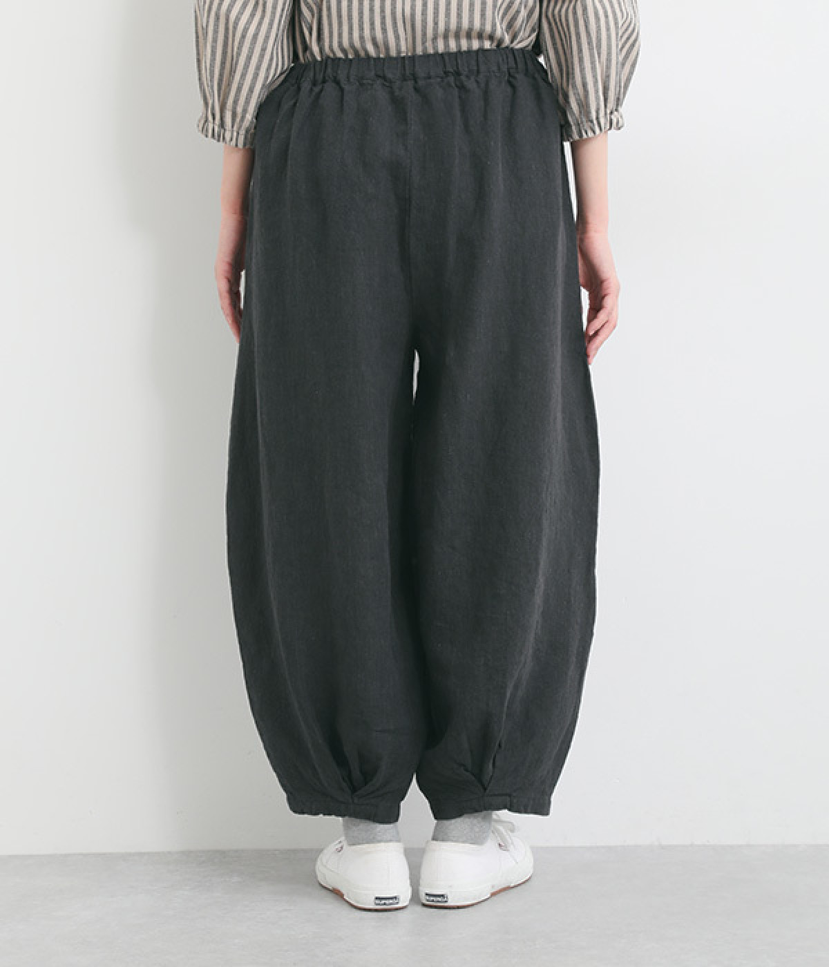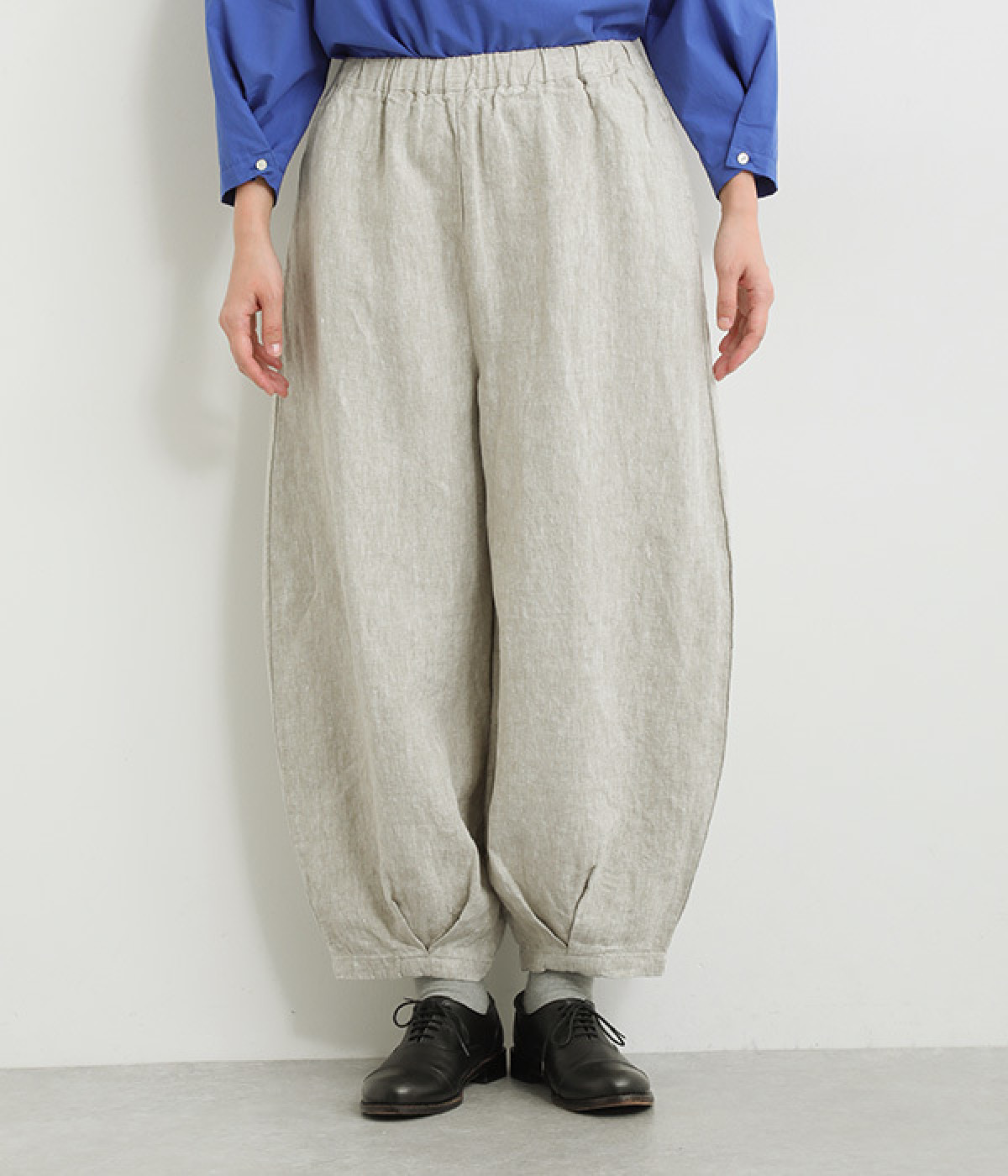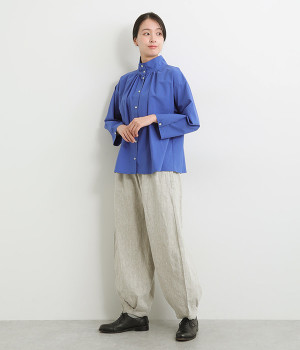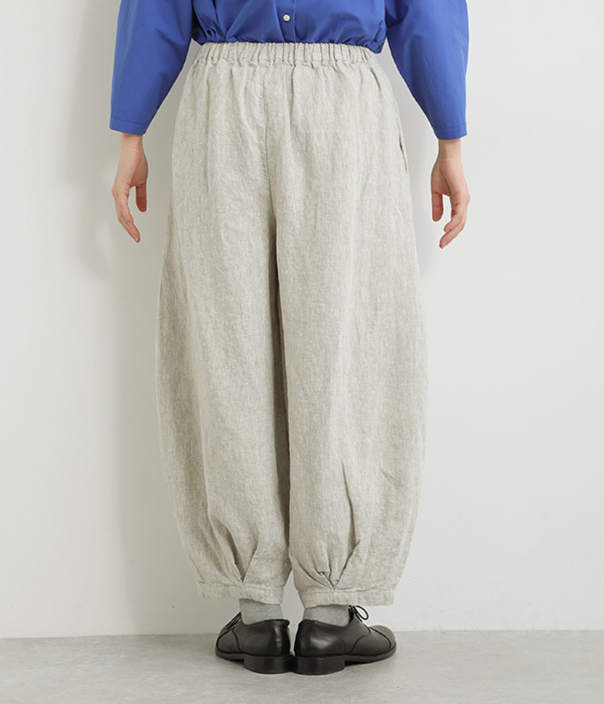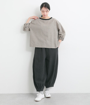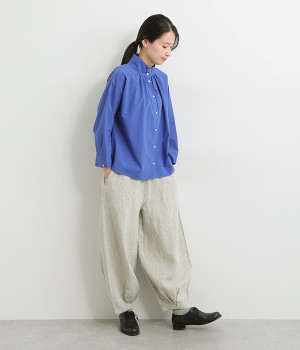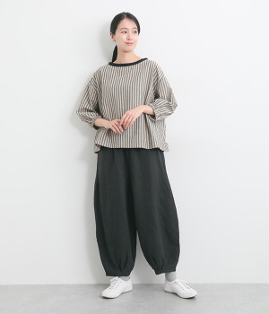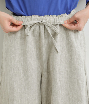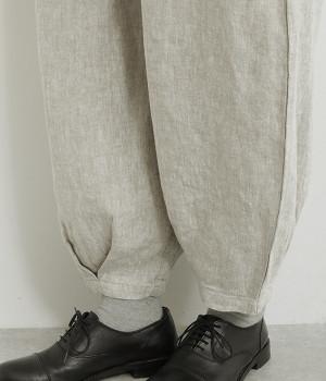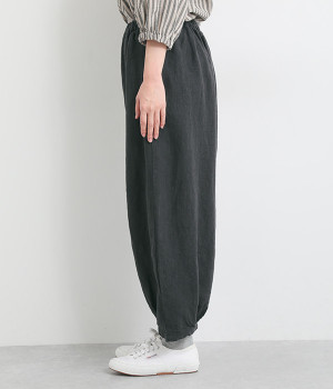 ナチュラルな生地感を活かしたシンプルな仕立てで、裾タックのバルーンシルエットでメリハリをつけています。着用感の良さだけでなく脱ぎはきもしやすいウエスト総ゴム仕立て。フィット感や腰位置を調整できる内紐入りです。