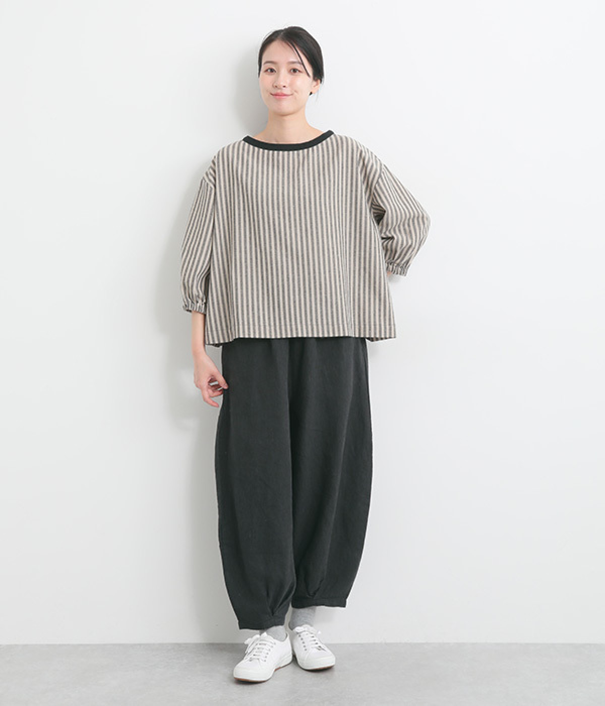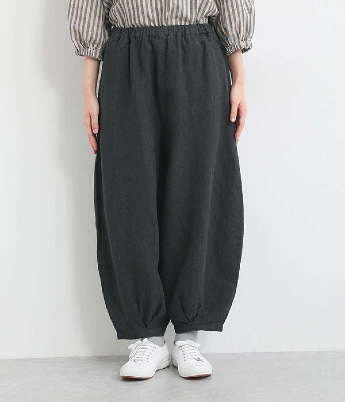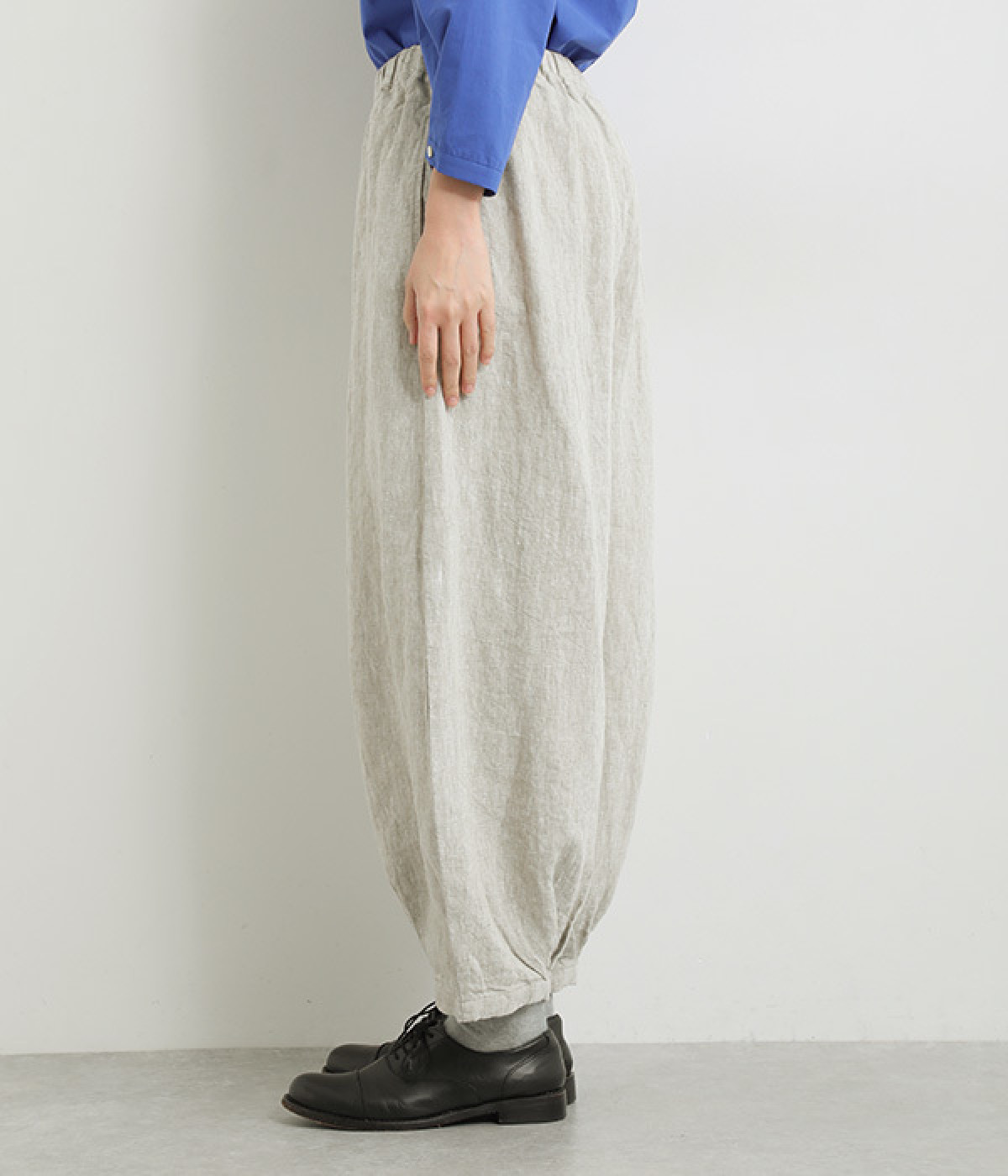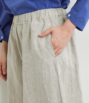 ナチュラルな生地感を活かしたシンプルな仕立てで、裾タックのバルーンシルエットでメリハリをつけています。着用感の良さだけでなく脱ぎはきもしやすいウエスト総ゴム仕立て。フィット感や腰位置を調整できる内紐入りです。