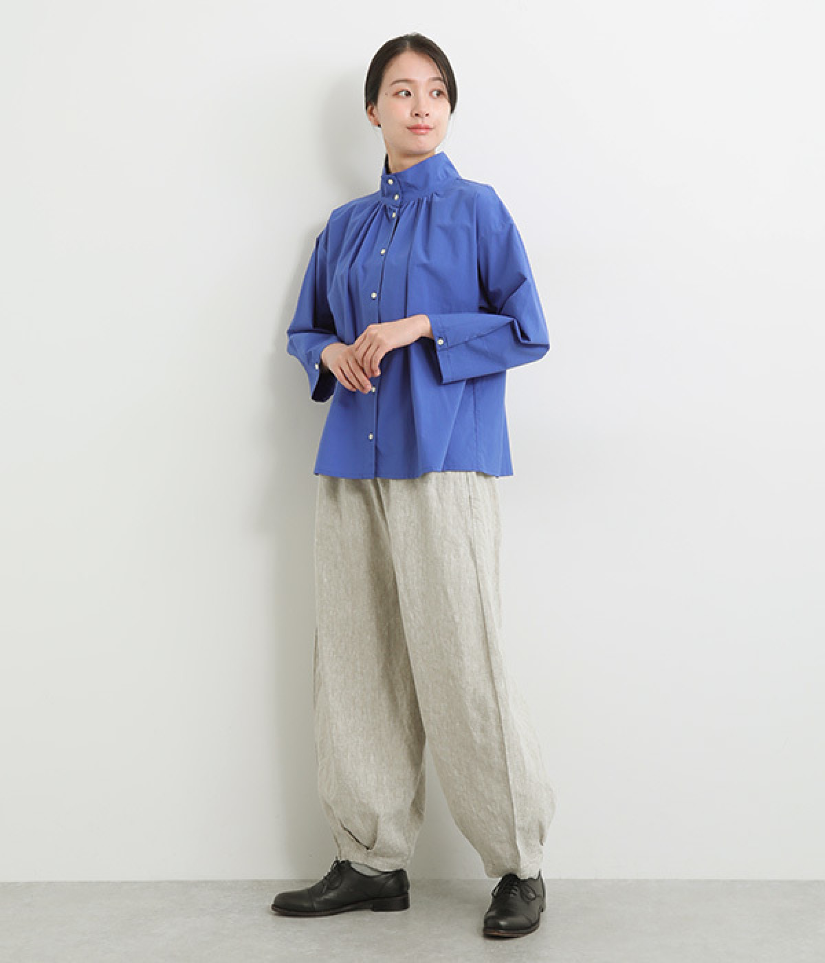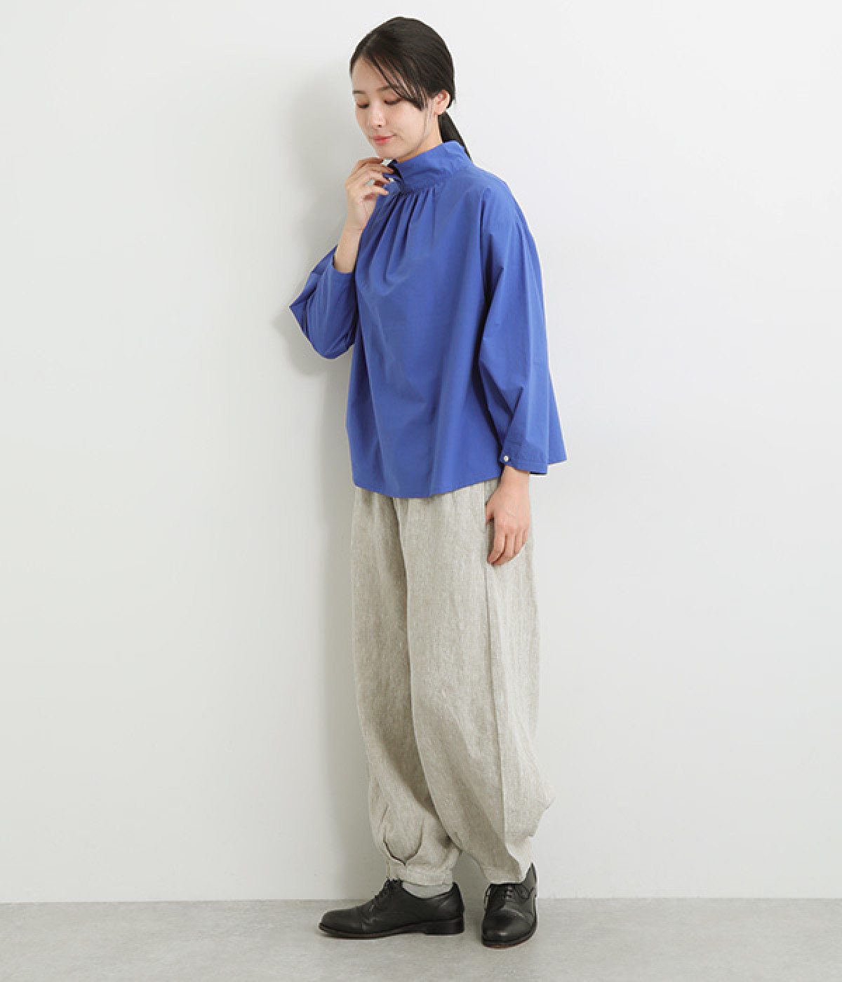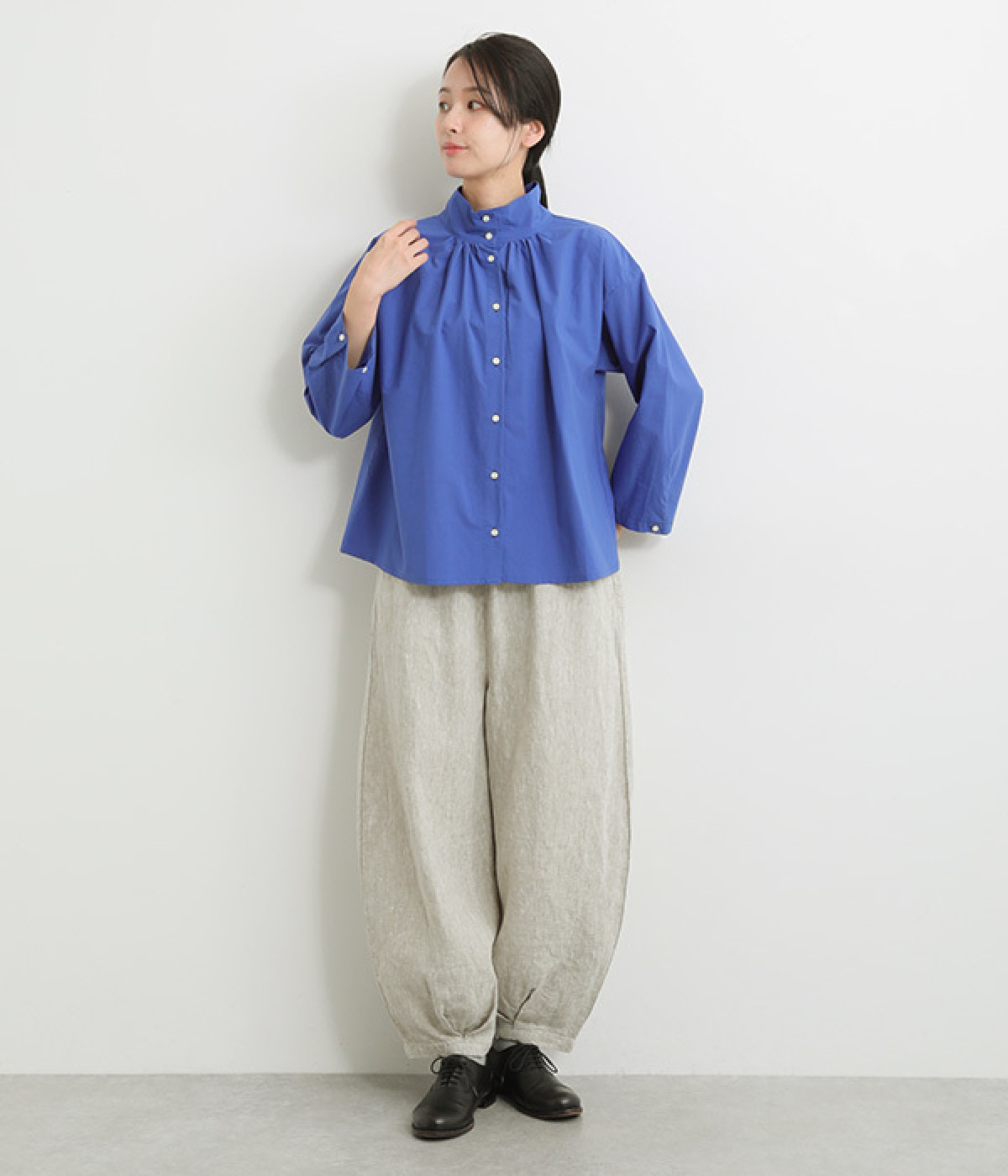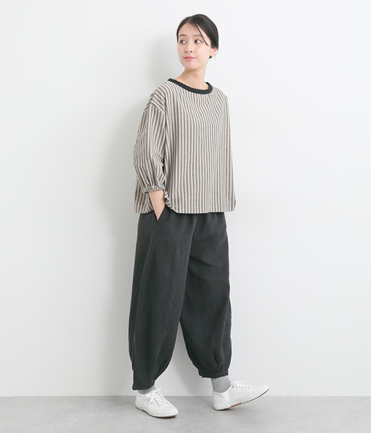 ナチュラルな生地感を活かしたシンプルな仕立てで、裾タックのバルーンシルエットでメリハリをつけています。着用感の良さだけでなく脱ぎはきもしやすいウエスト総ゴム仕立て。フィット感や腰位置を調整できる内紐入りです。