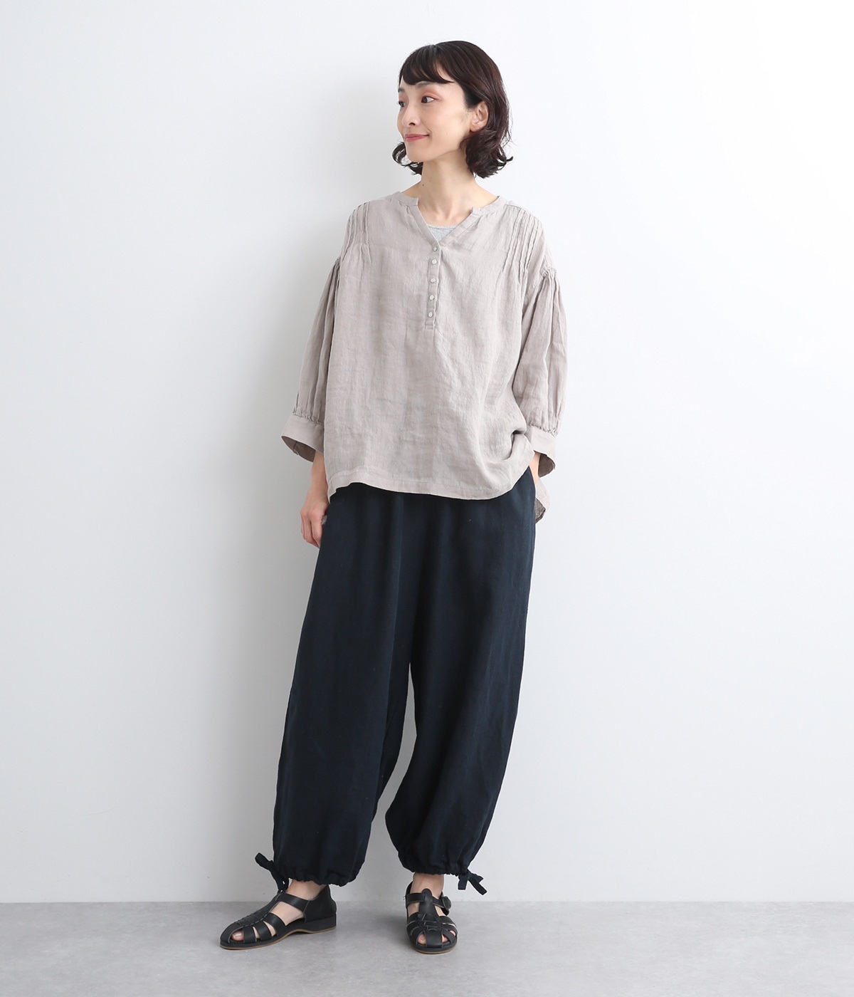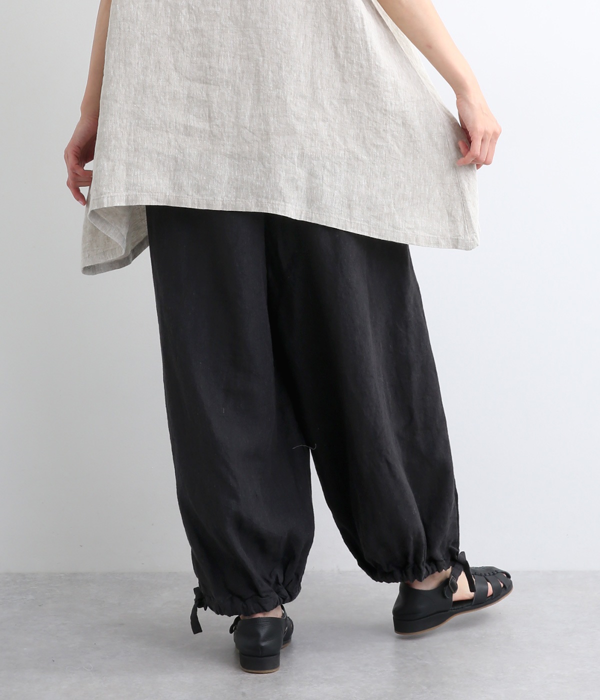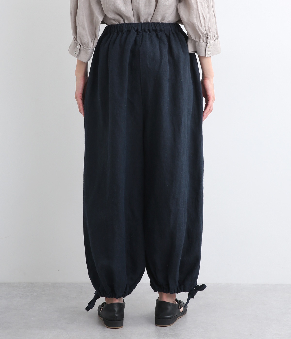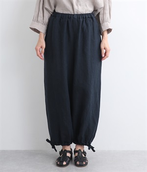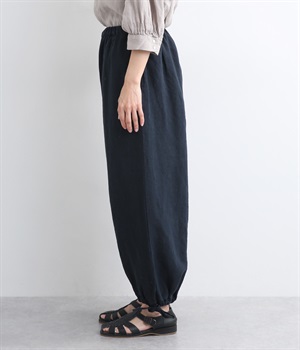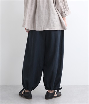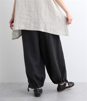 裾にドローコードを通した仕様で、きゅっと絞れるふんわりシルエットのパンツです。ウエストはフィットが心地よい総ゴム仕立てで、内側の紐で調節もできます。ワンピースやロングシャツとのレイヤードにもおすすめです。