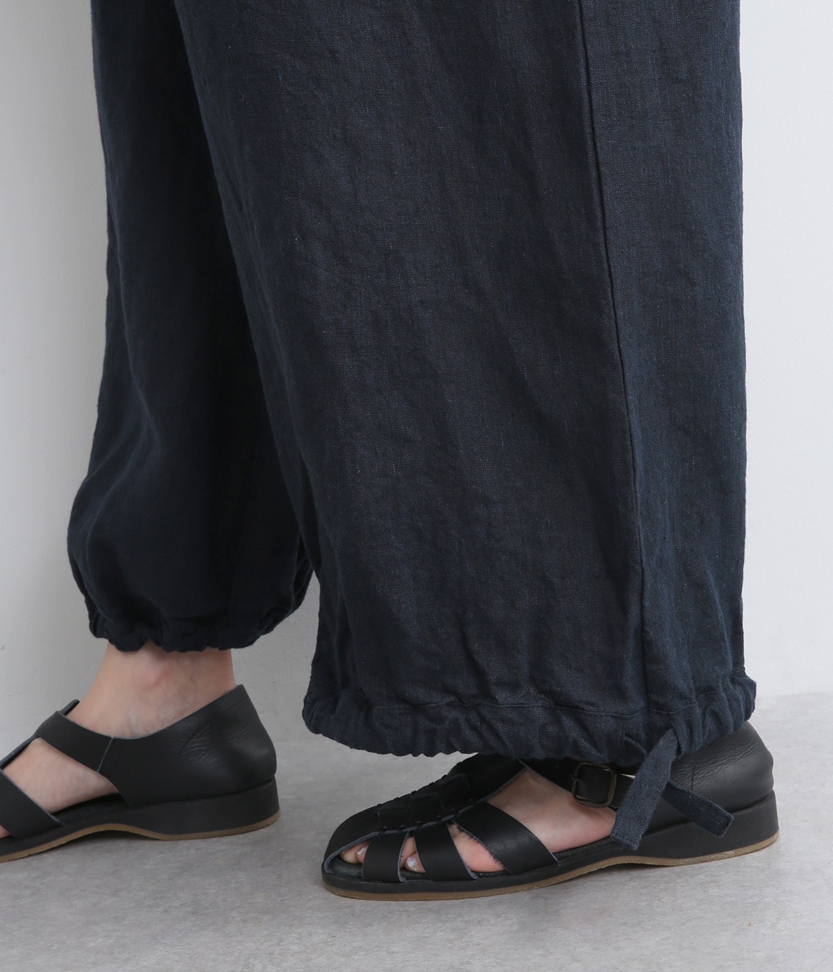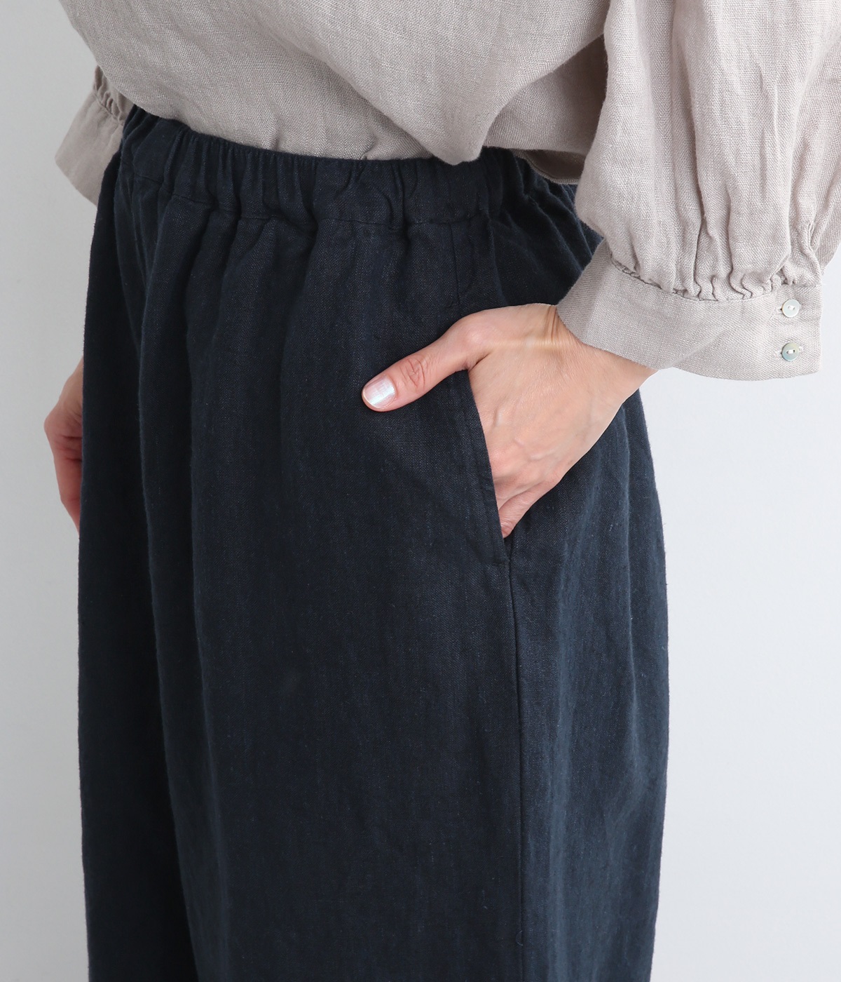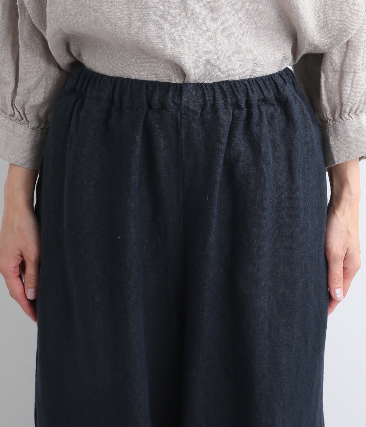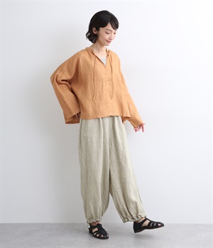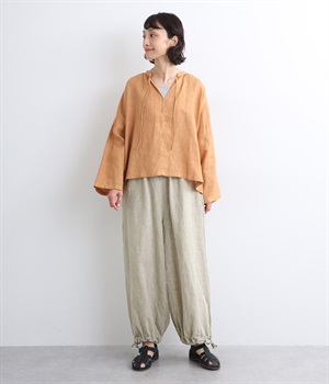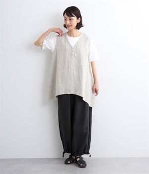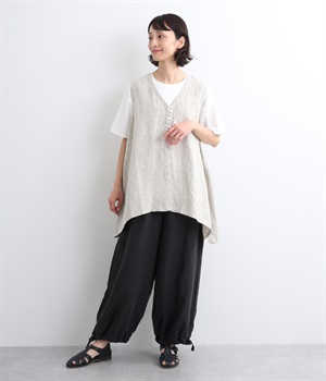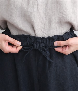 シャリ感があり、しっかりとした質感をもつリネン素材を使用しています。肌離れがよく、暑い時期でもさらっと穿けるのが特徴です。