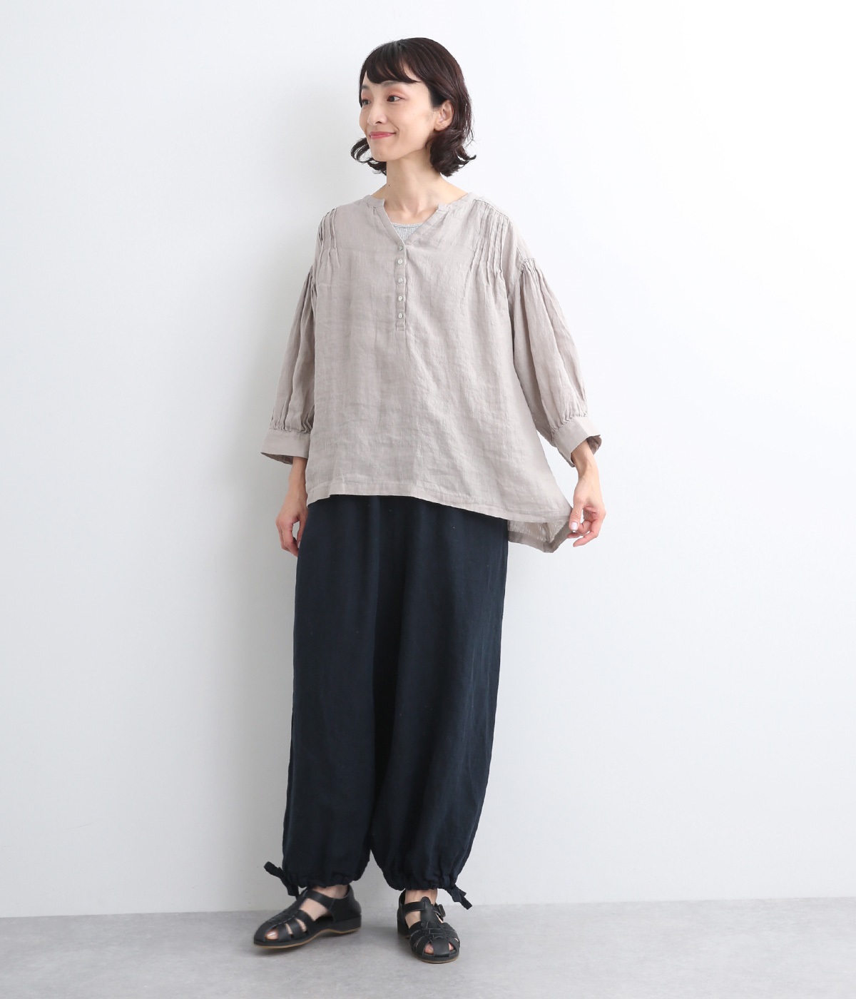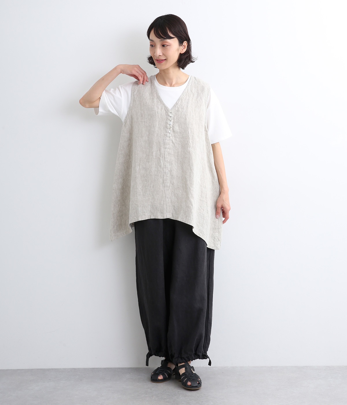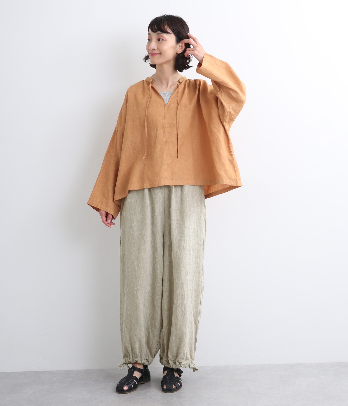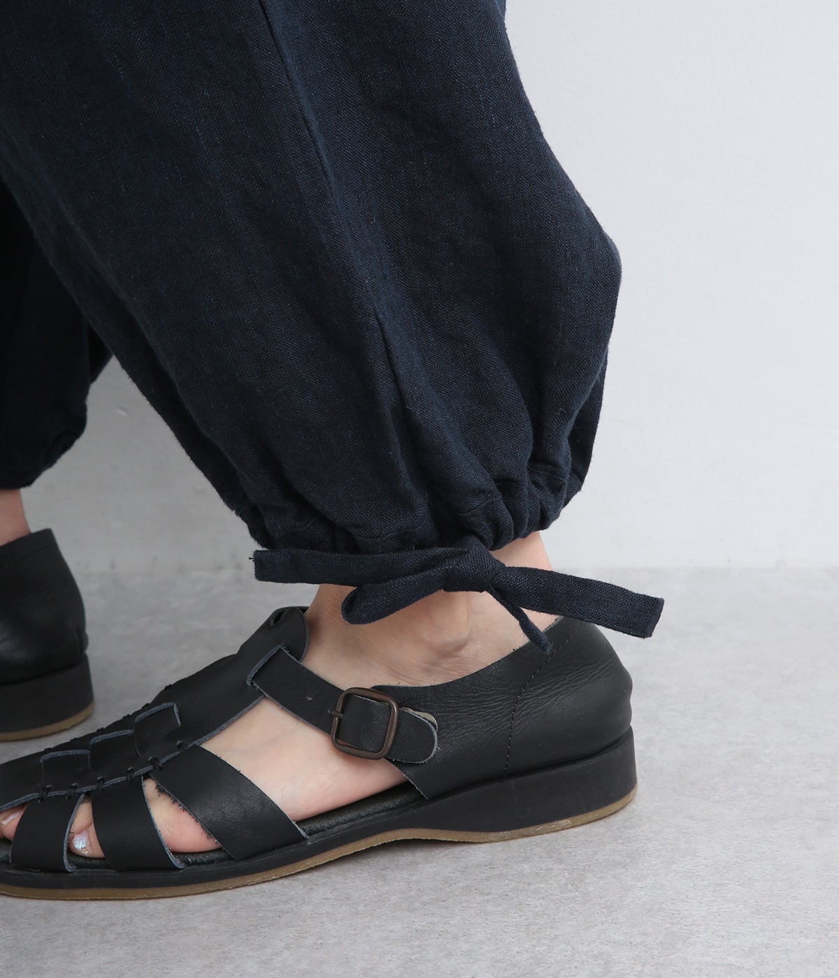 シャリ感があり、しっかりとした質感をもつリネン素材を使用しています。肌離れがよく、暑い時期でもさらっと穿けるのが特徴です。