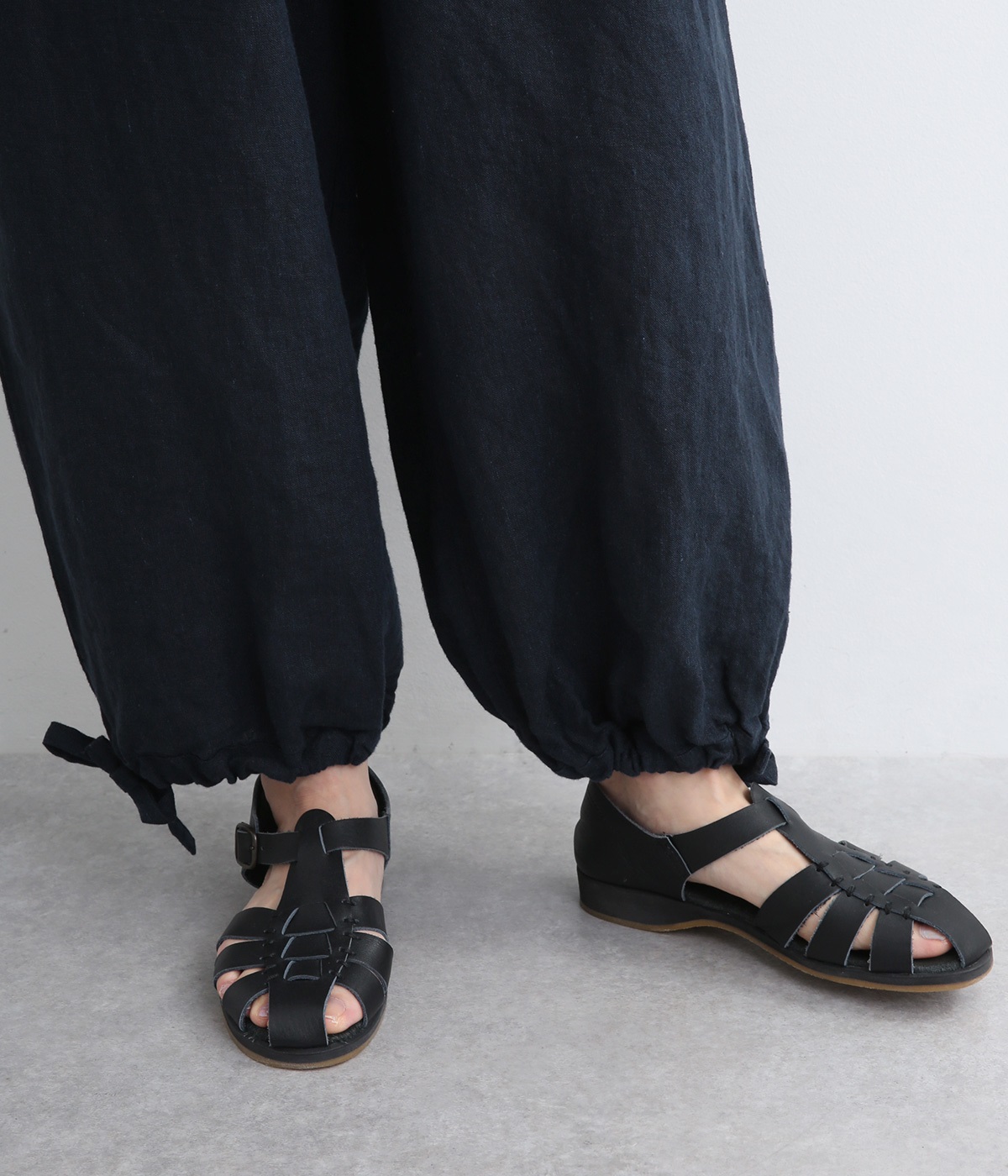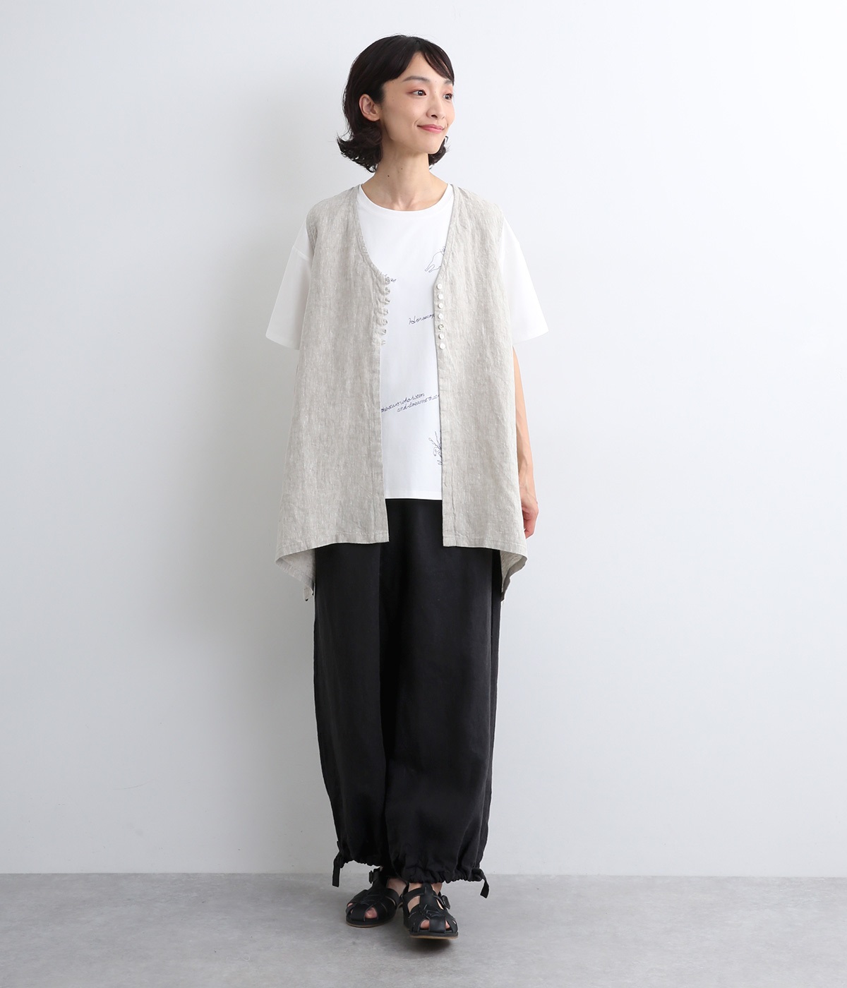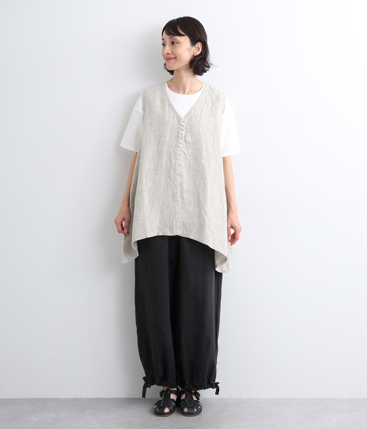 シャリ感があり、しっかりとした質感をもつリネン素材を使用しています。肌離れがよく、暑い時期でもさらっと穿けるのが特徴です。