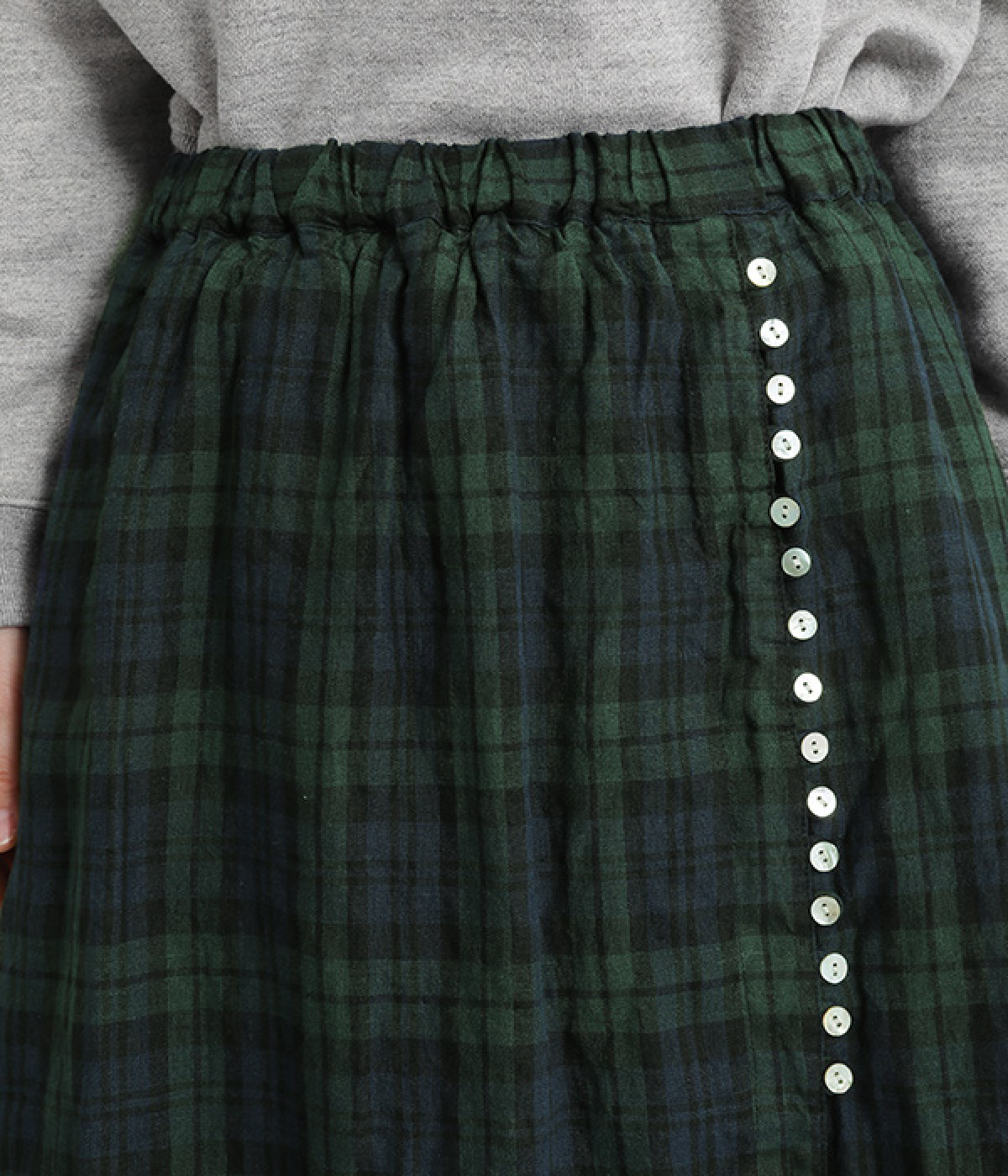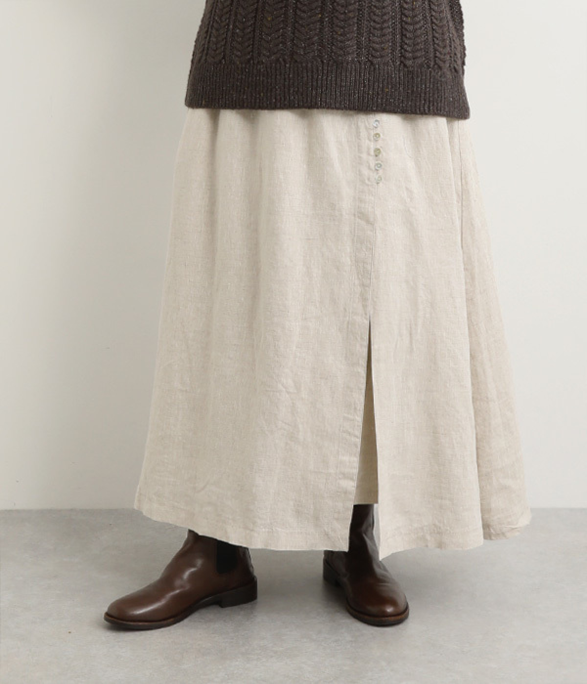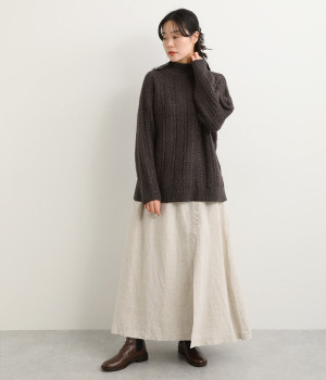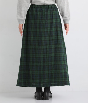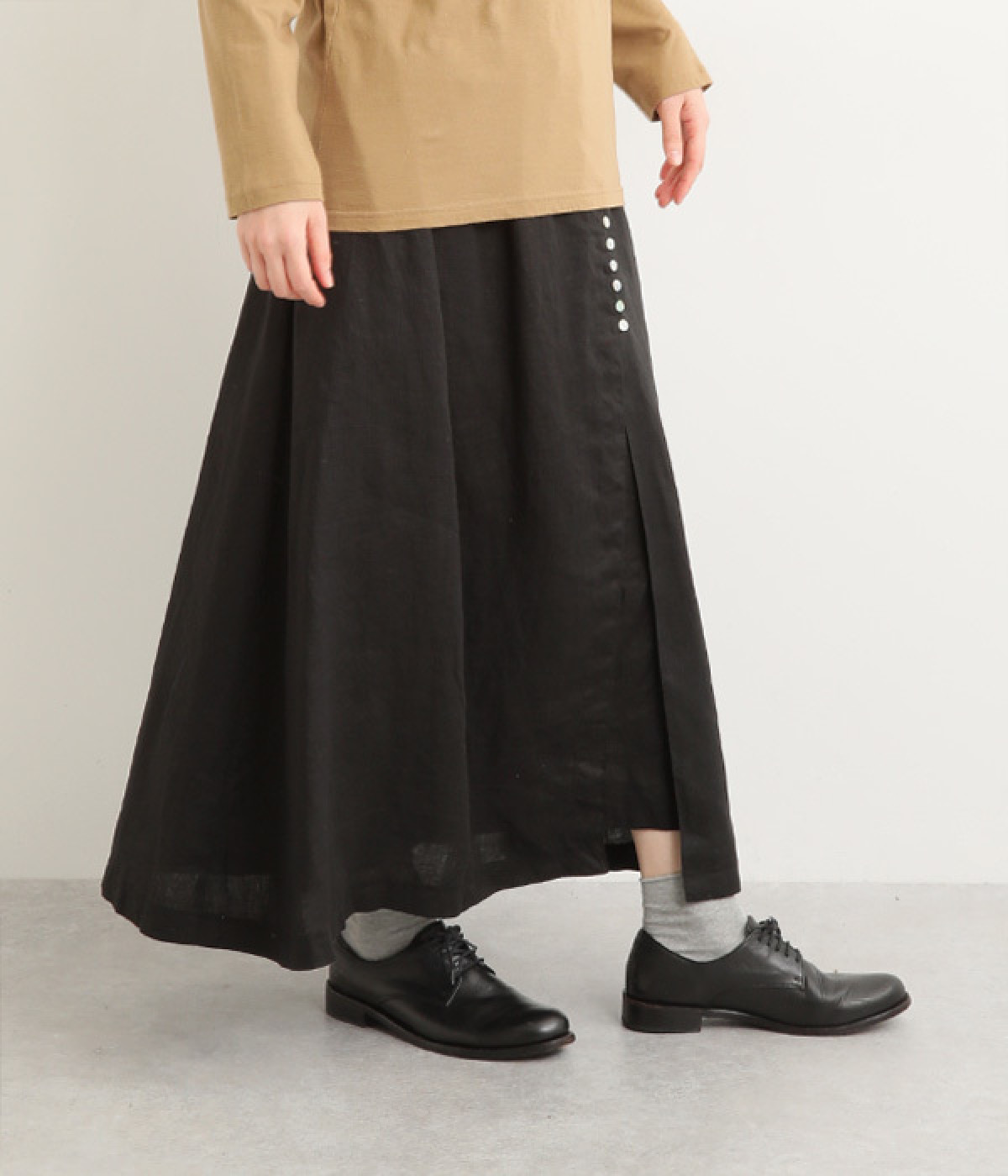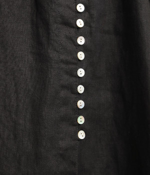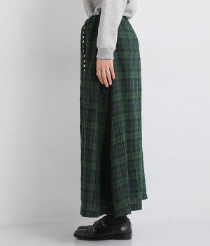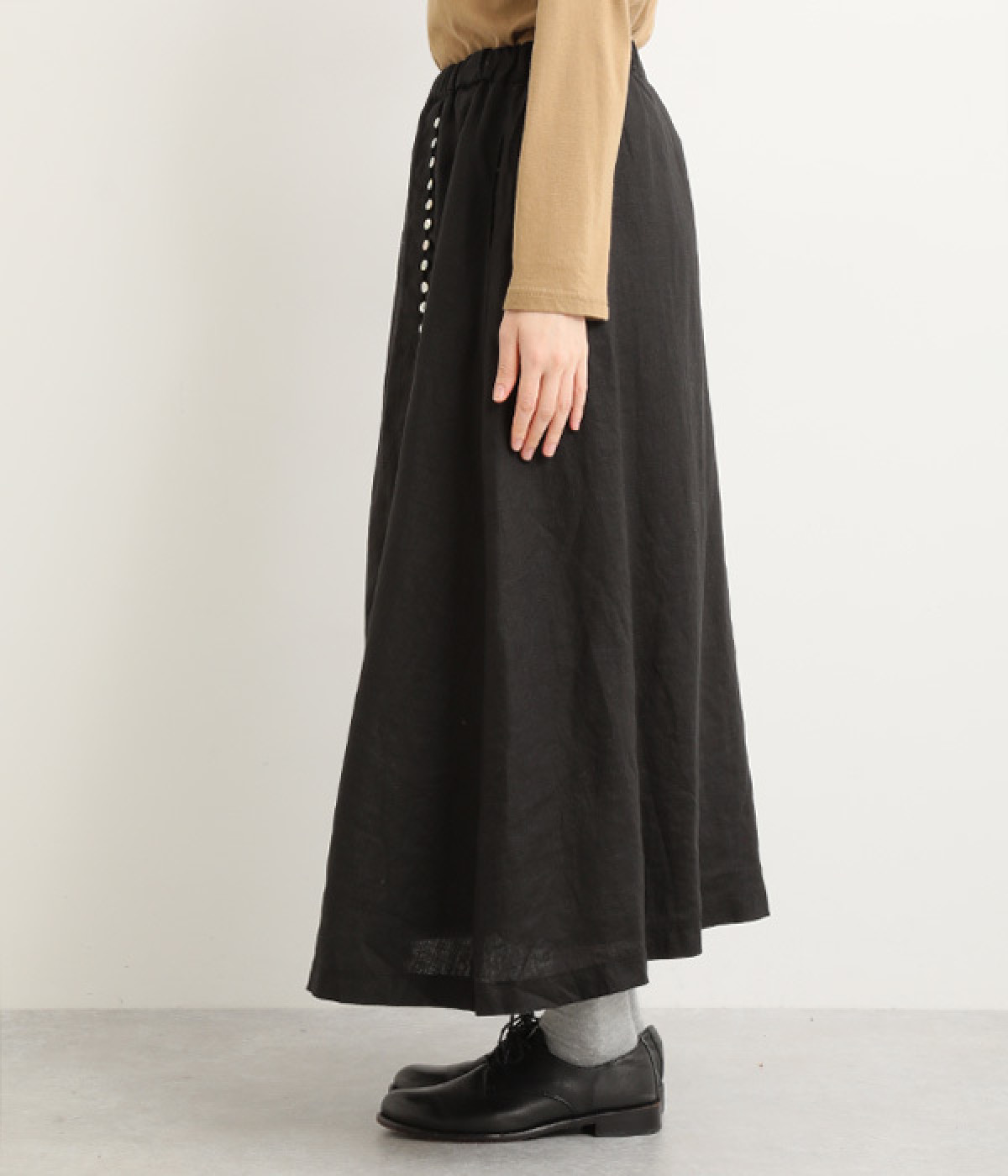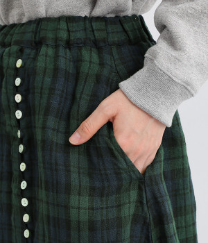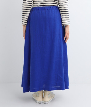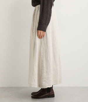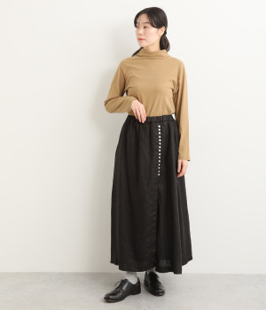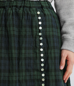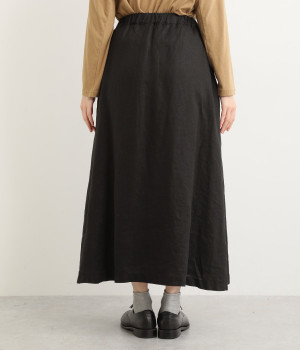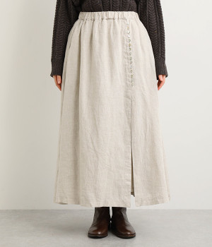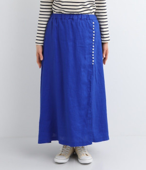 ほどよいシャリ感&しなやかさがありながら、ふんわりとしたやわらかさも併せ持つリネン素材で仕立てたスカート。ラップ風に見せた生地の上に、たくさんの配色ボタンを並べて遊び心をもたせました。しっかりと裏地をつけているため、生地の揺らめきによるインナー見えの心配もありません。トップスインがすっきりとまとまるウエスト総ゴム仕様も◎。足の動きが干渉されないフレアシルエットを採用しました。