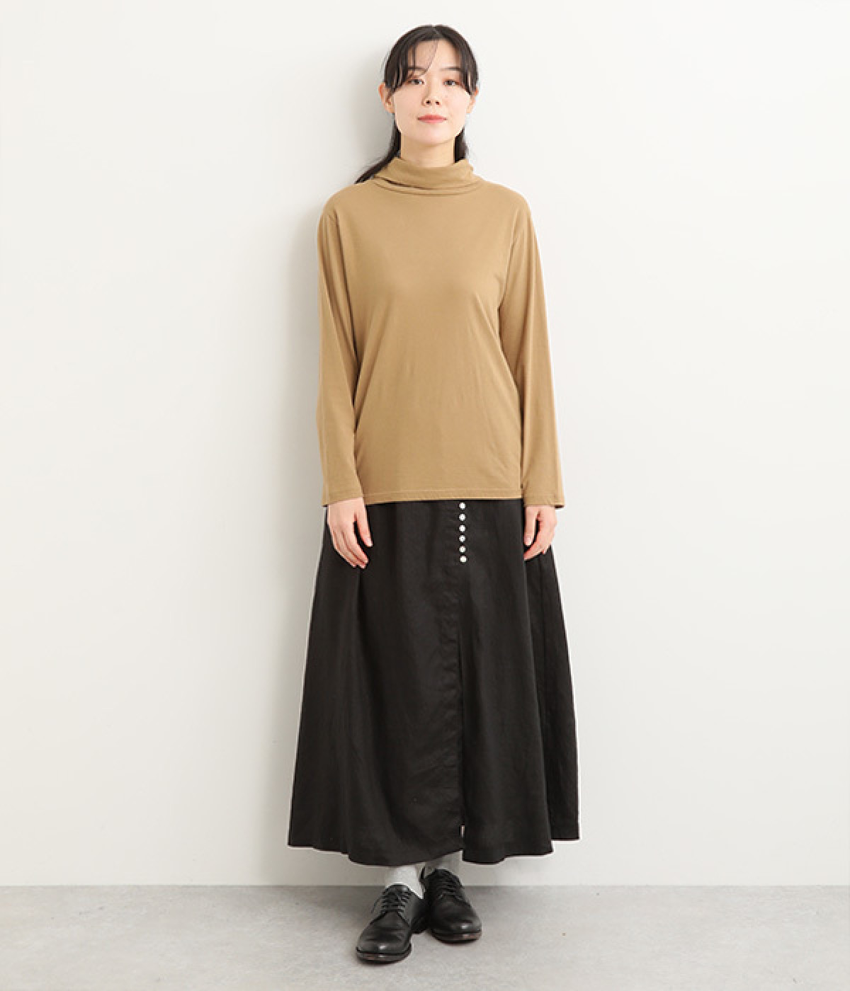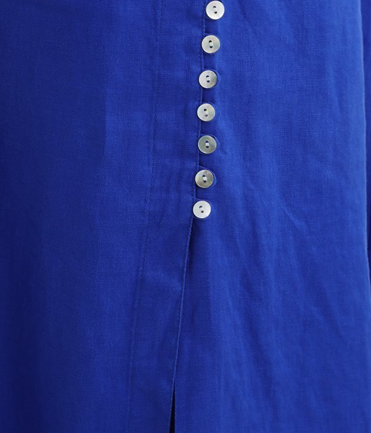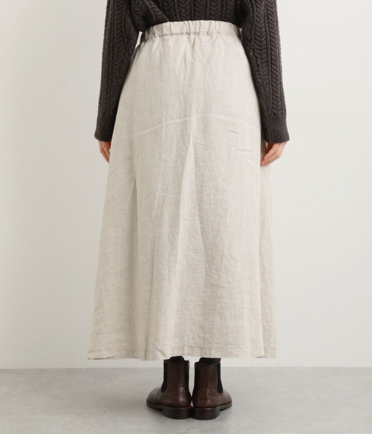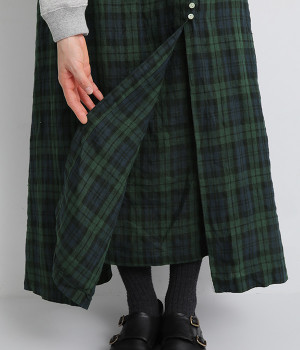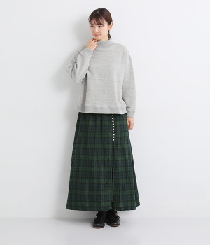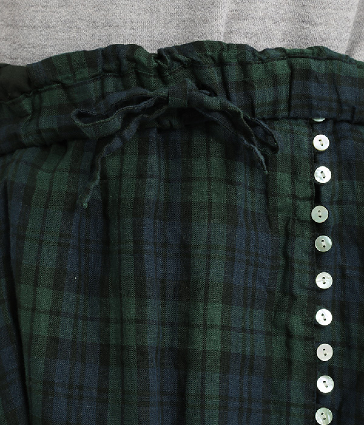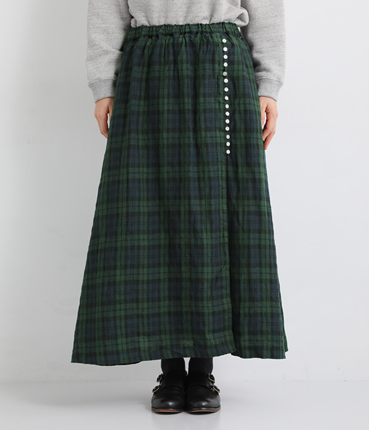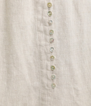 ほどよいシャリ感&しなやかさがありながら、ふんわりとしたやわらかさも併せ持つリネン素材で仕立てたスカート。ラップ風に見せた生地の上に、たくさんの配色ボタンを並べて遊び心をもたせました。しっかりと裏地をつけているため、生地の揺らめきによるインナー見えの心配もありません。トップスインがすっきりとまとまるウエスト総ゴム仕様も◎。足の動きが干渉されないフレアシルエットを採用しました。