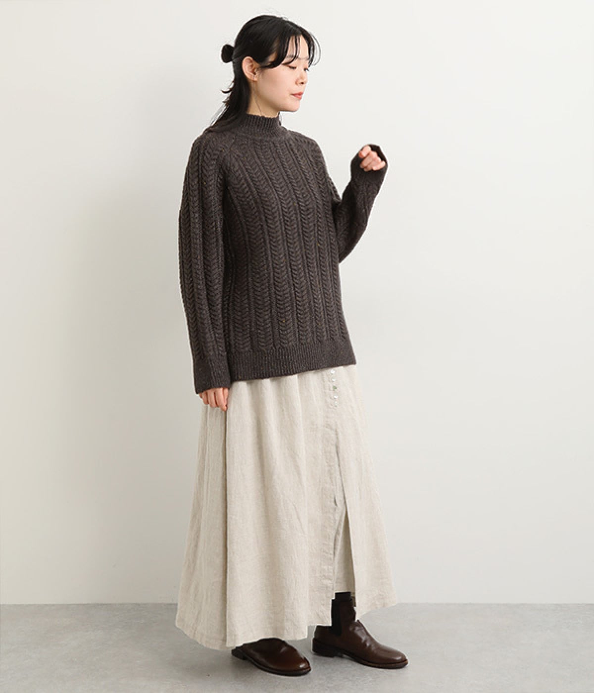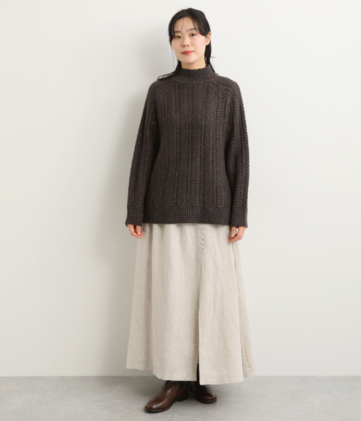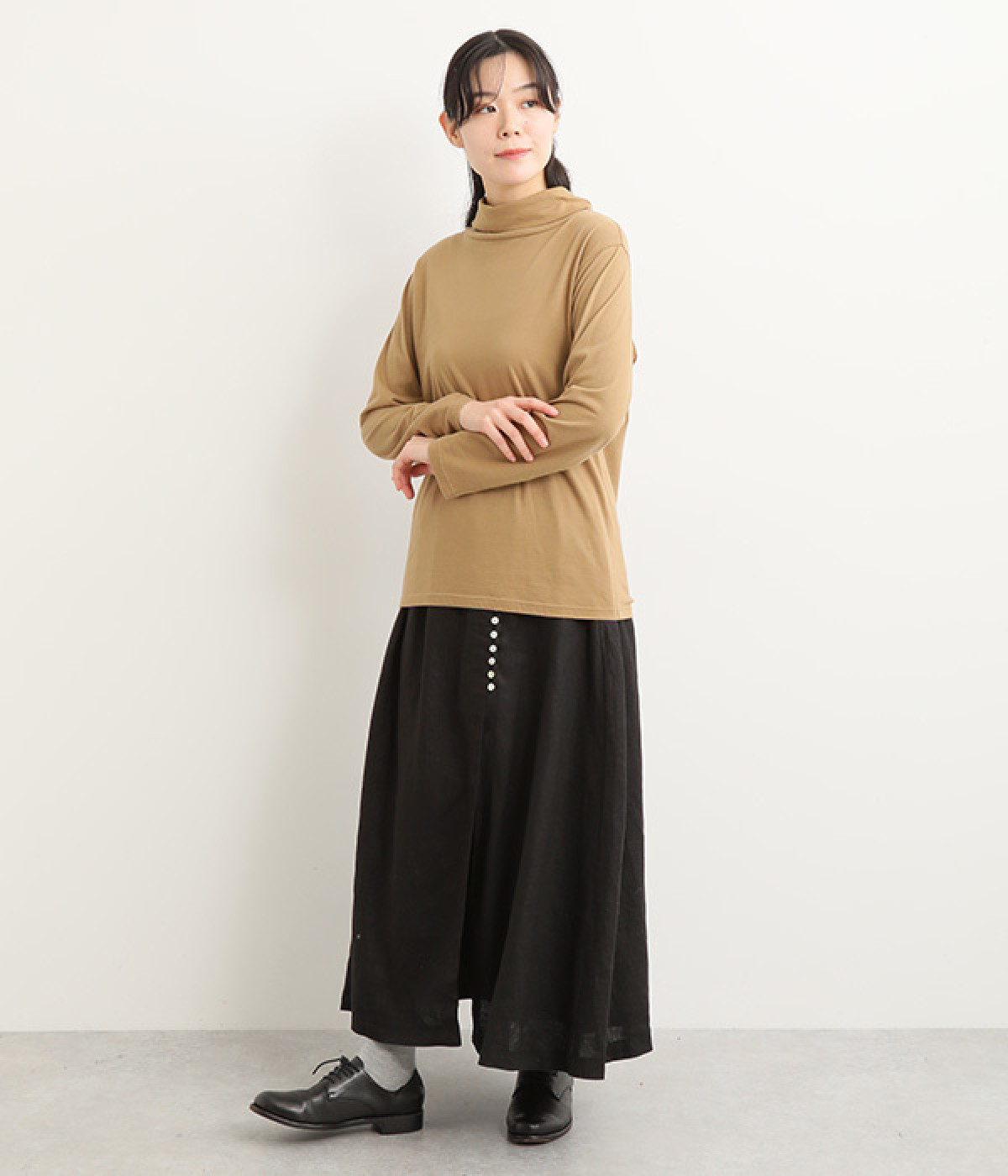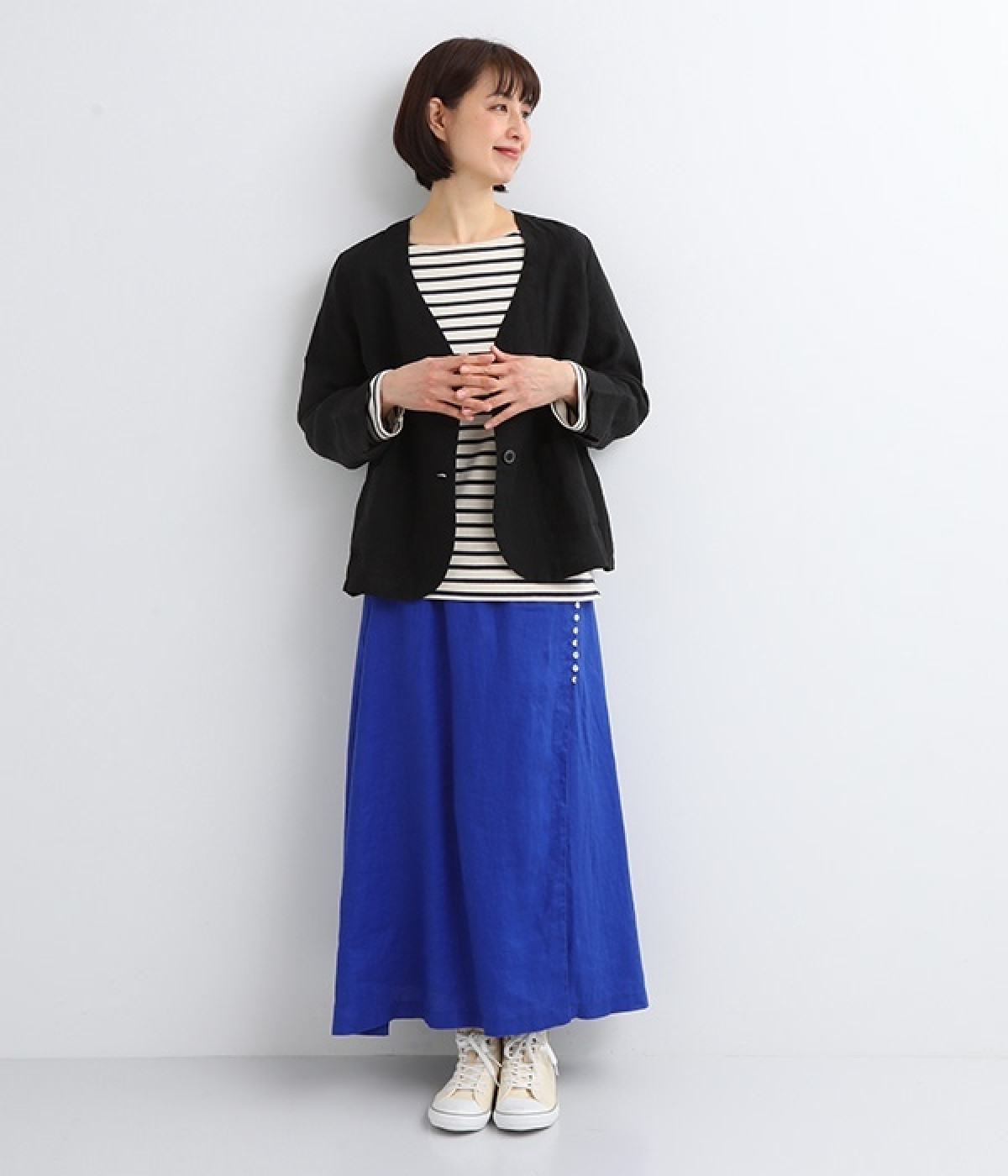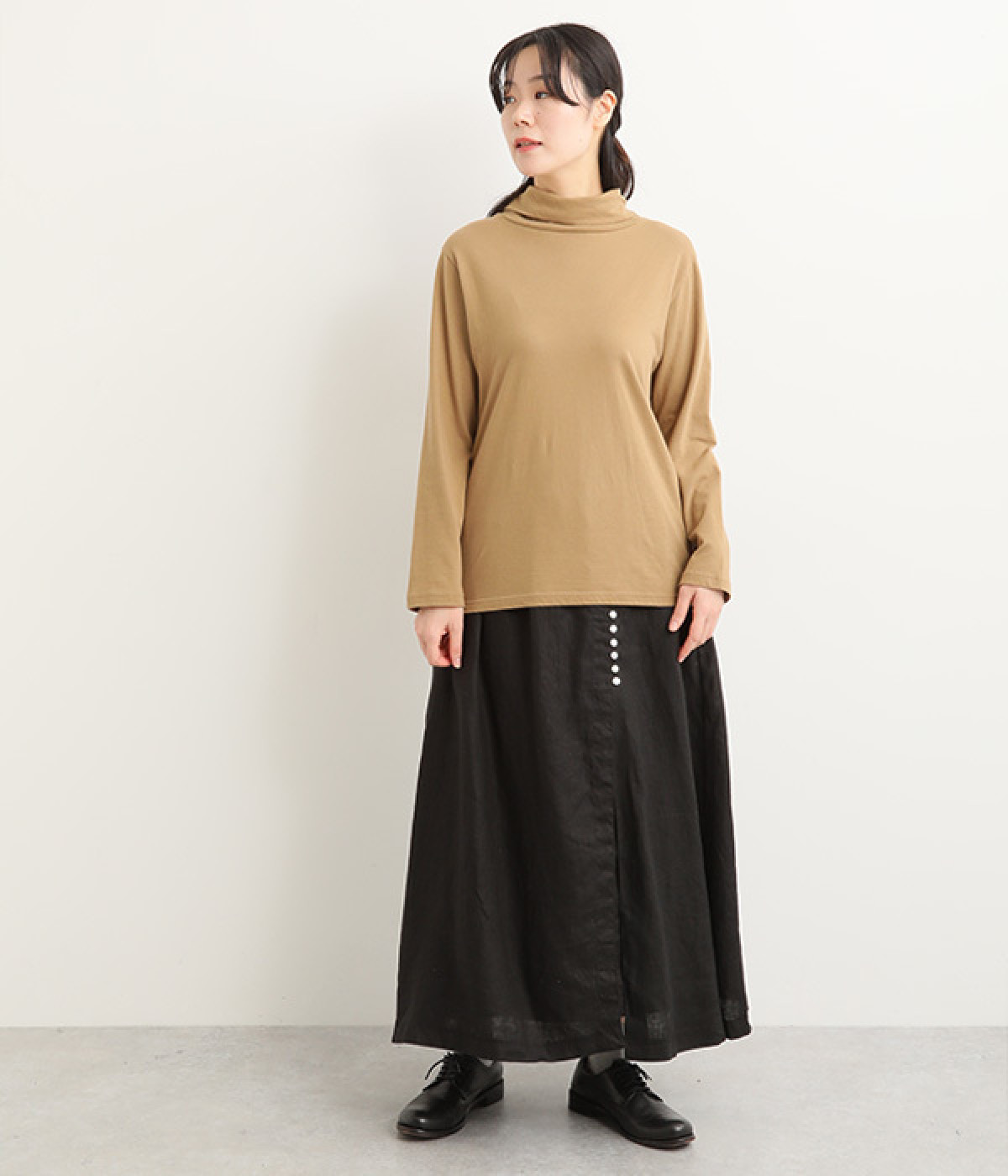 ほどよいシャリ感&しなやかさがありながら、ふんわりとしたやわらかさも併せ持つリネン素材で仕立てたスカート。ラップ風に見せた生地の上に、たくさんの配色ボタンを並べて遊び心をもたせました。しっかりと裏地をつけているため、生地の揺らめきによるインナー見えの心配もありません。トップスインがすっきりとまとまるウエスト総ゴム仕様も◎。足の動きが干渉されないフレアシルエットを採用しました。
