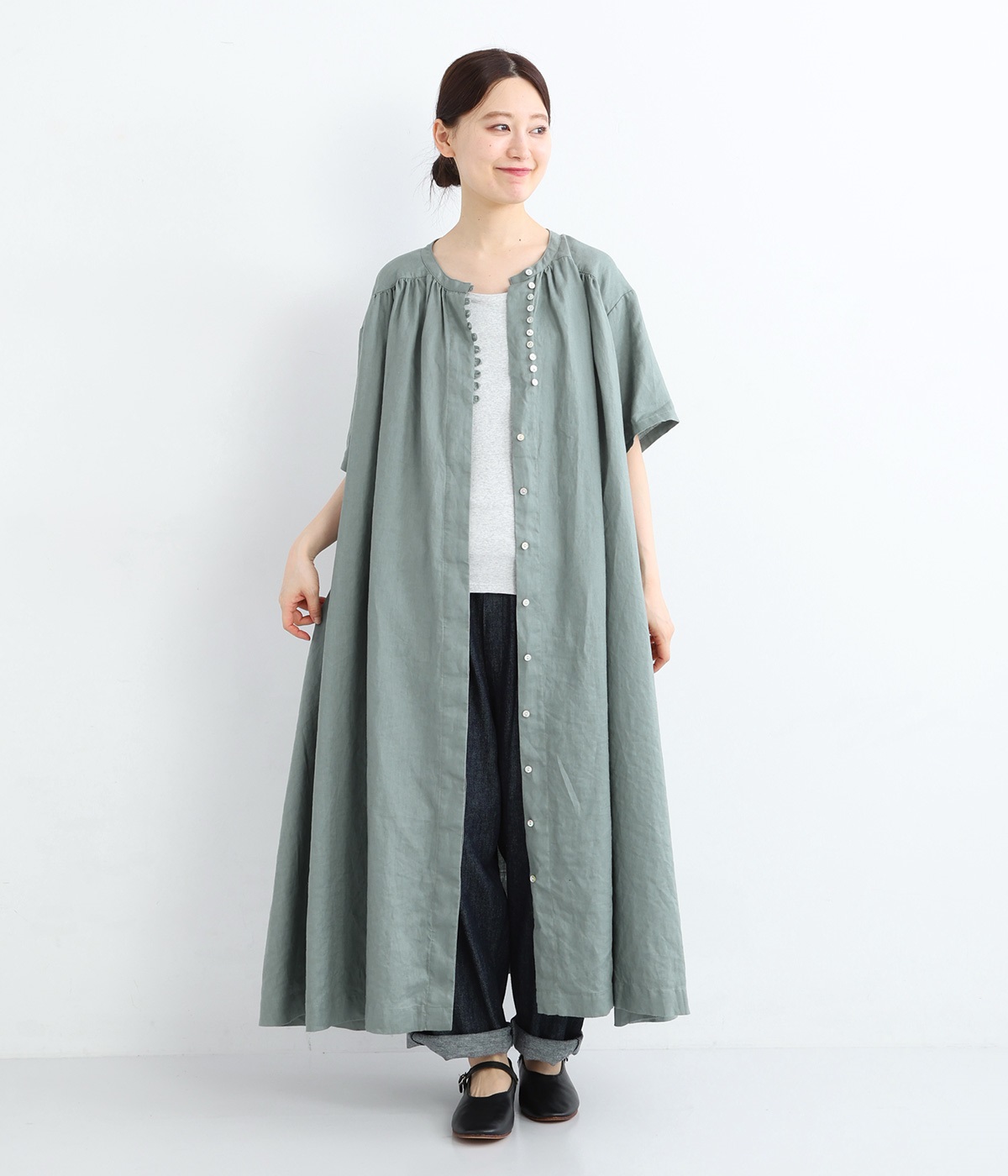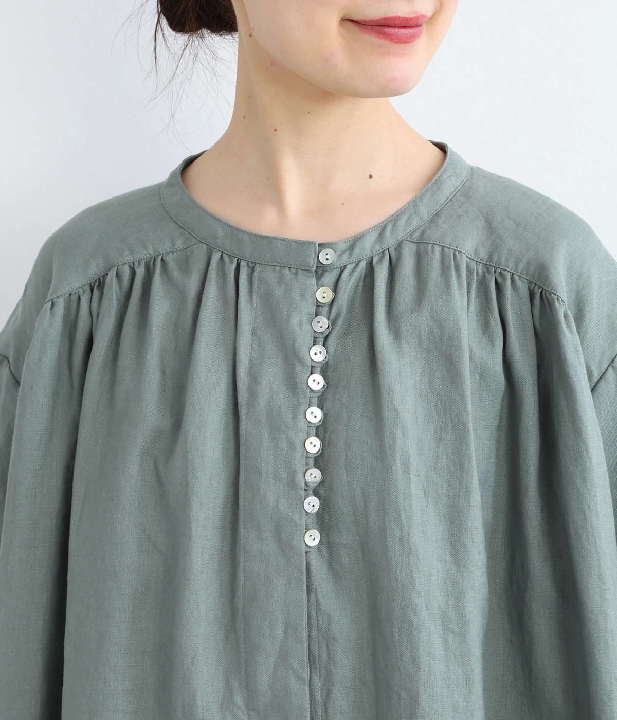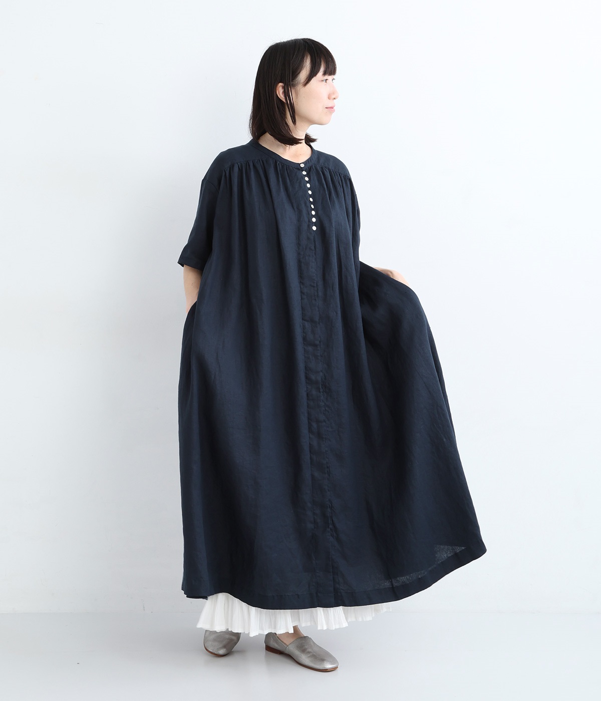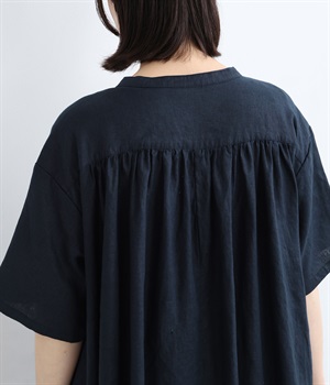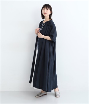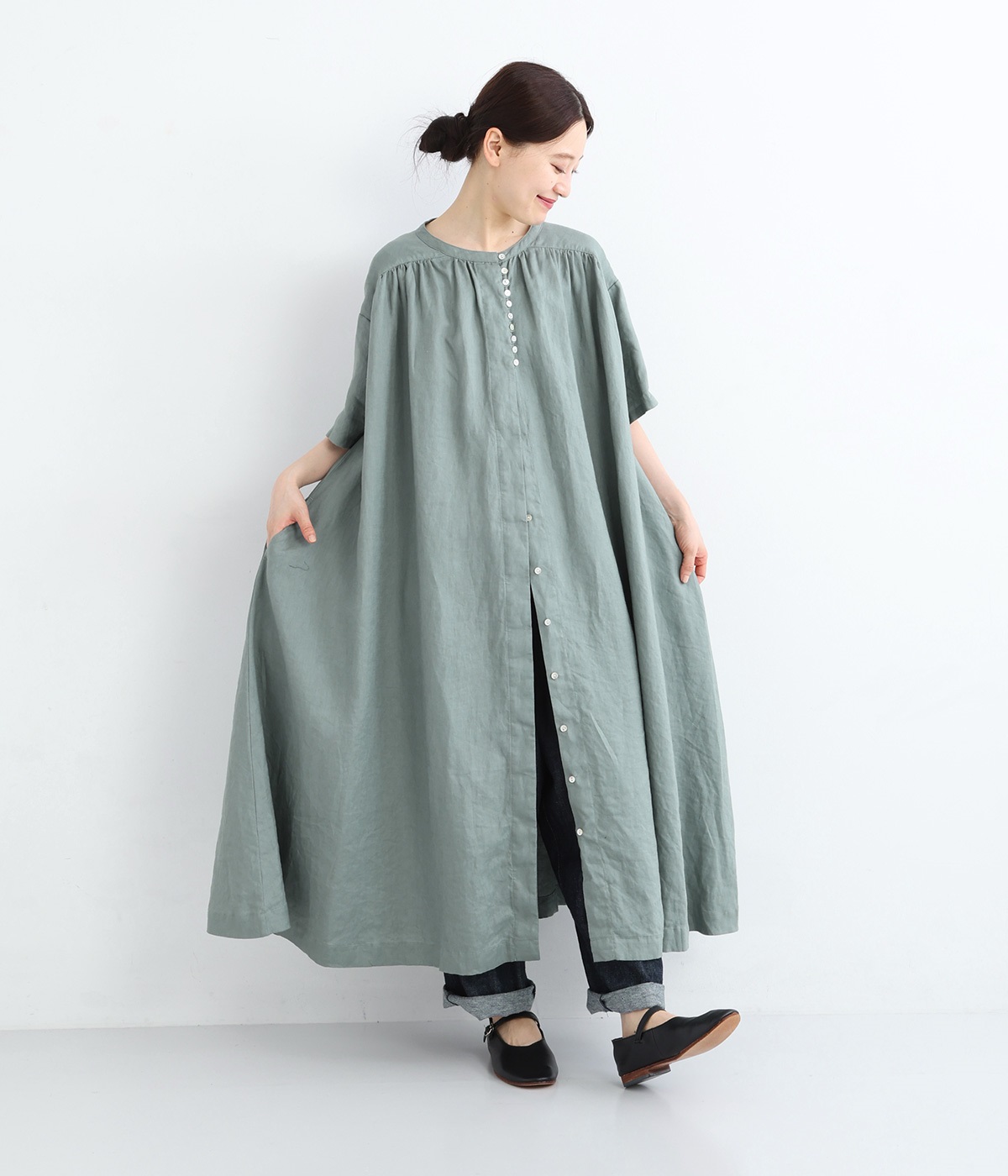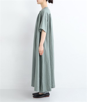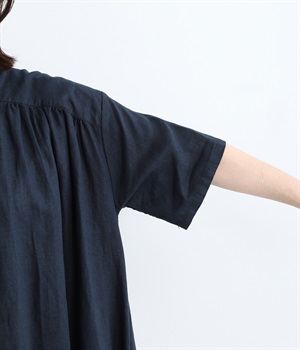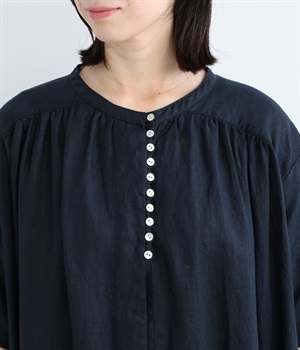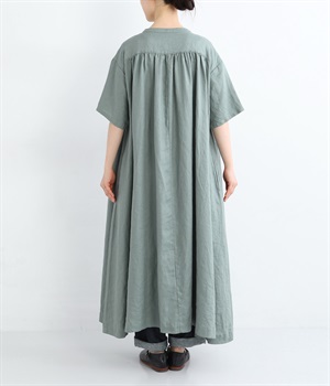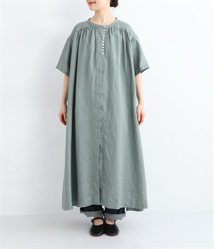 14番手リネン多ボタンギャザーワンピース