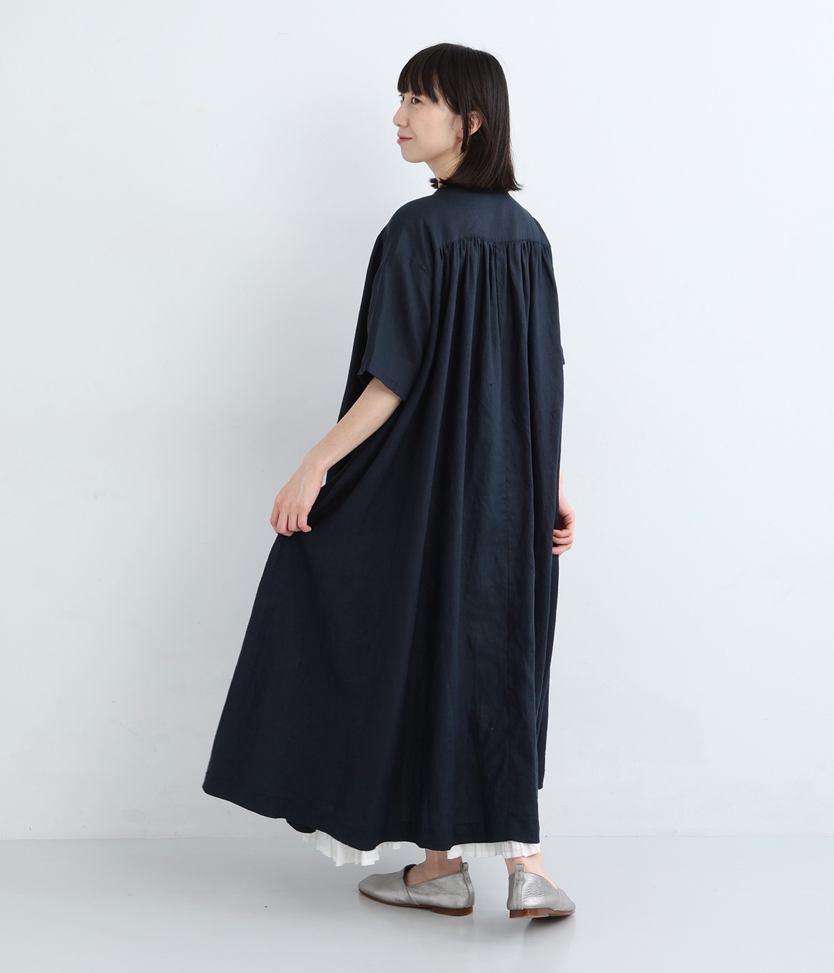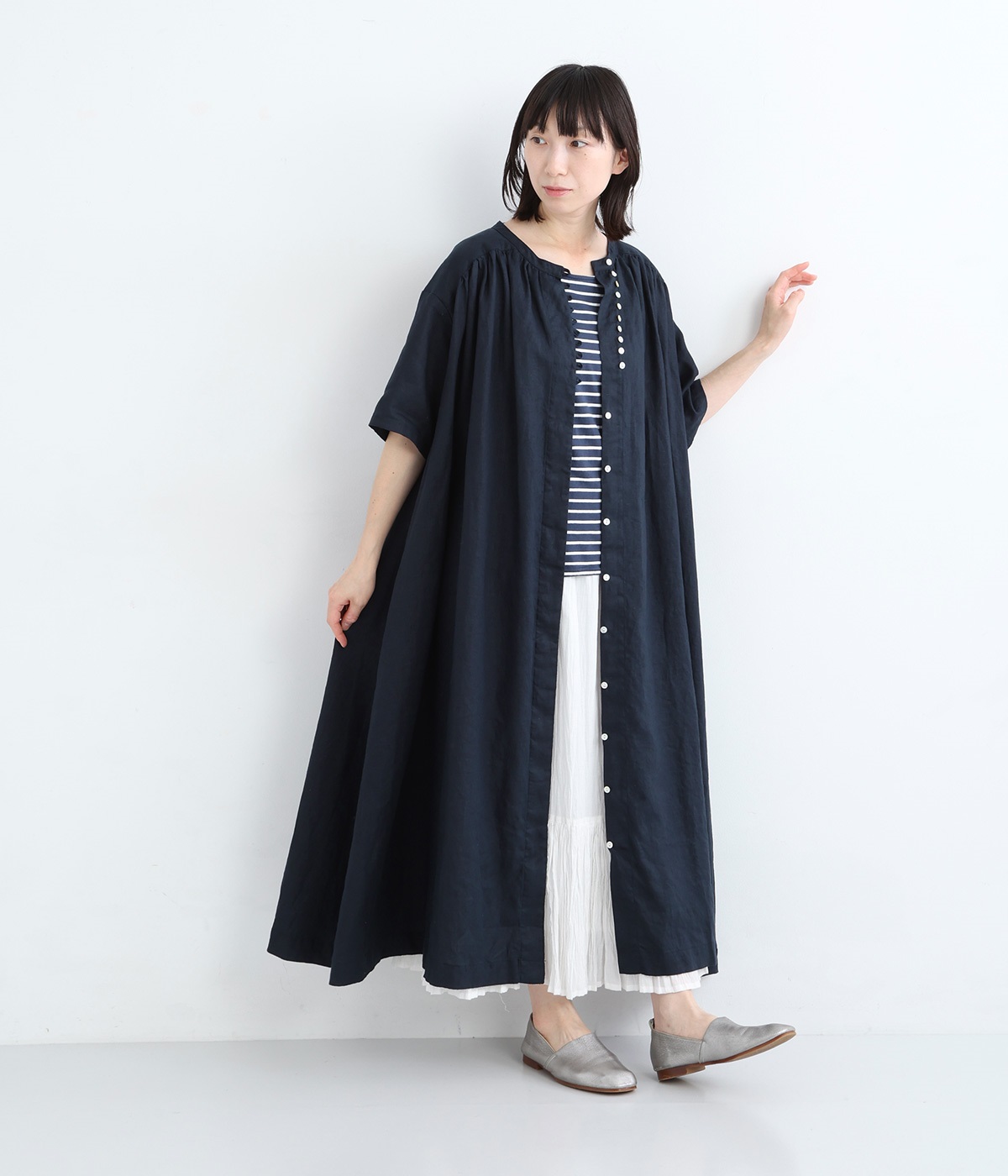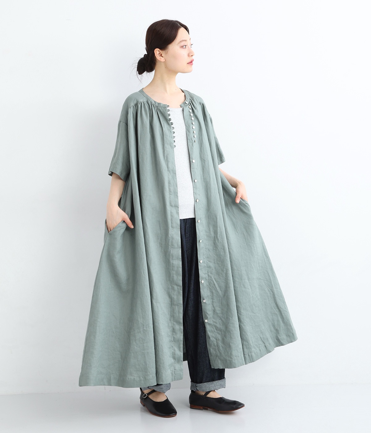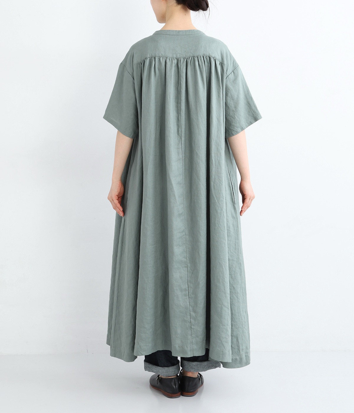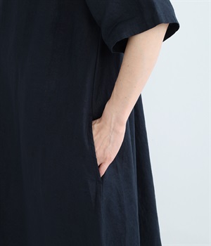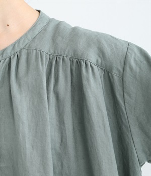 14番手リネン多ボタンギャザーワンピース