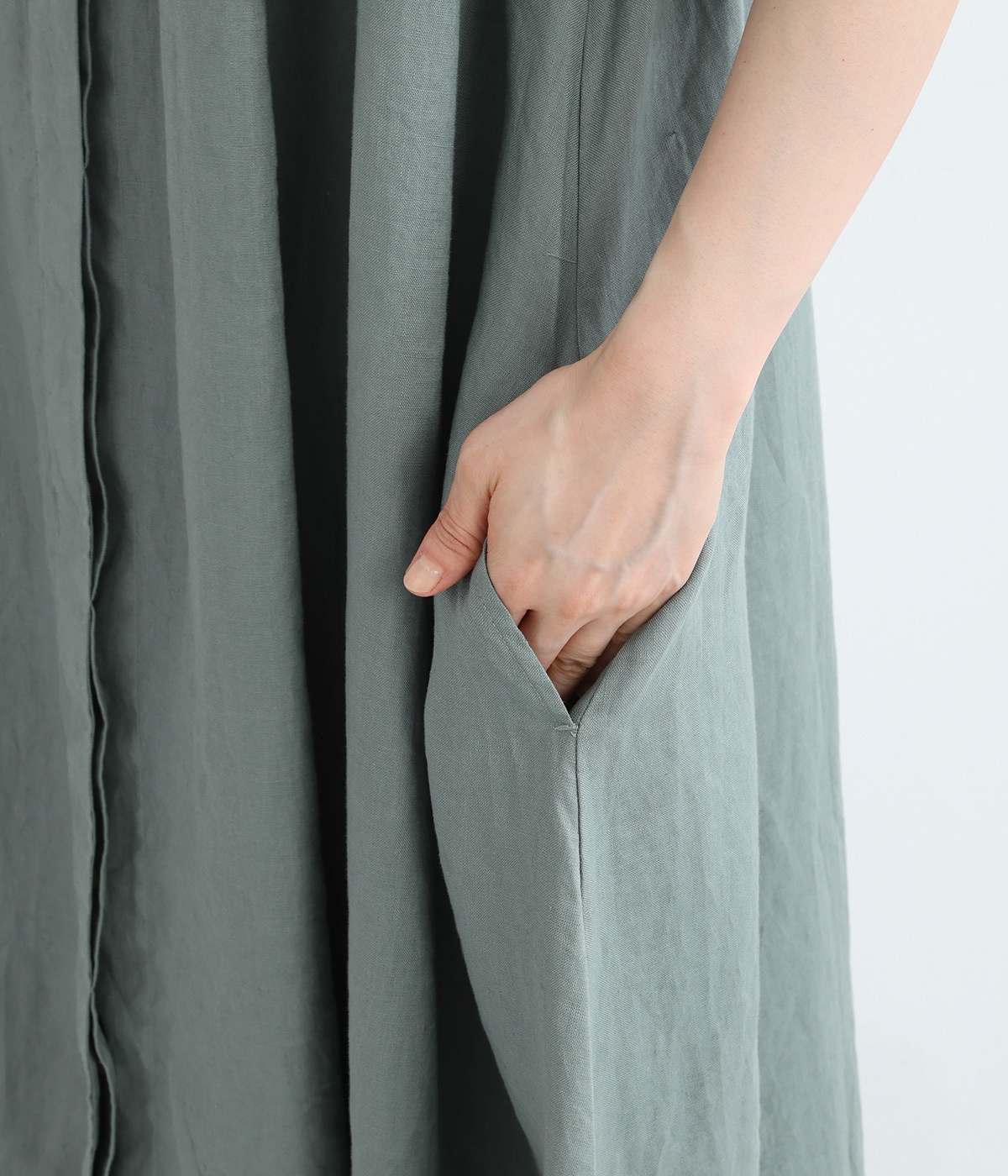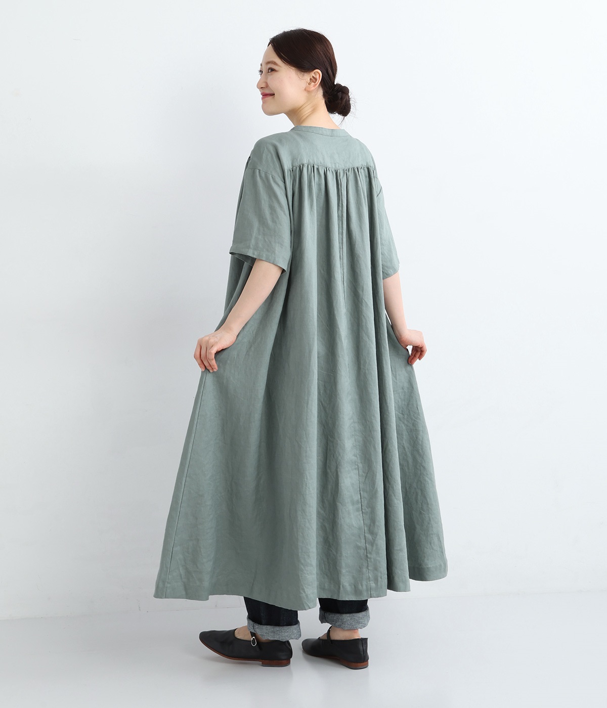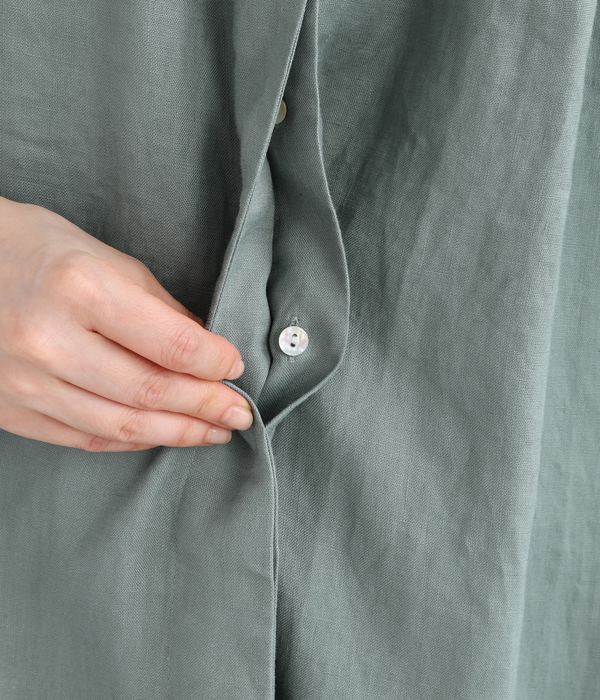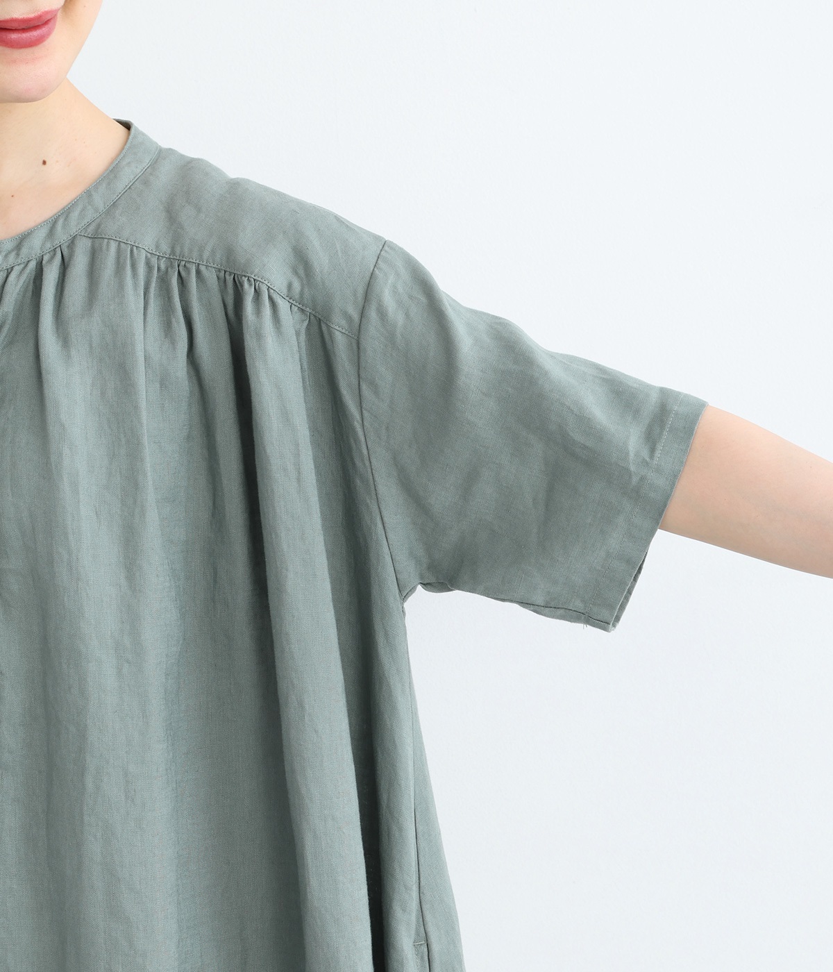 14番手リネン多ボタンギャザーワンピース
