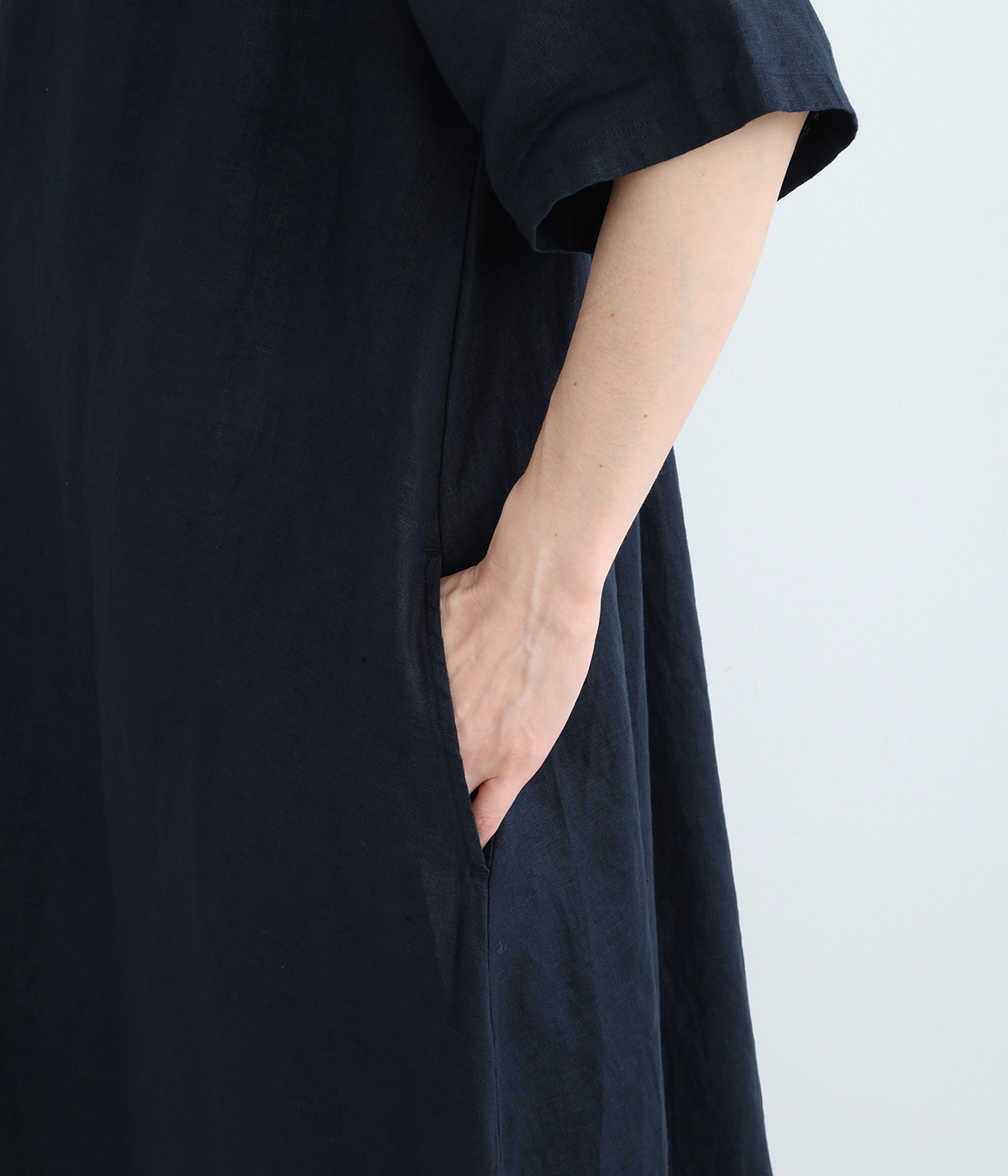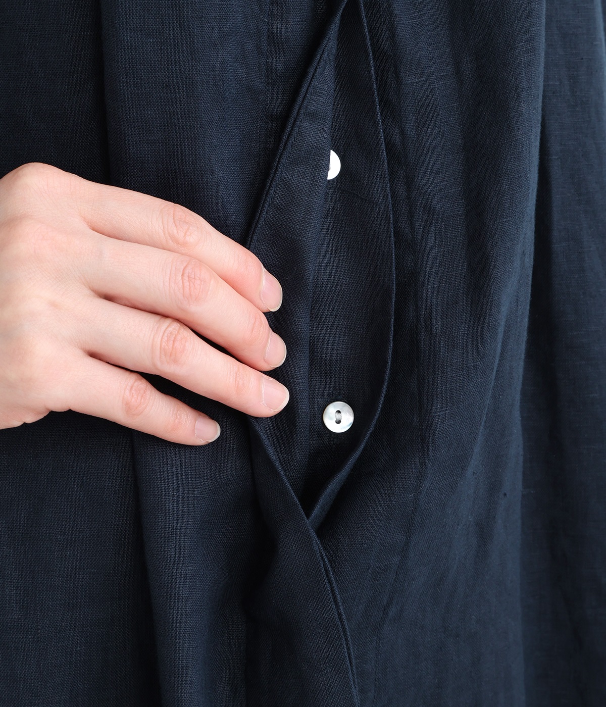 胸元から下は比翼仕立てでボタンが隠れているため、縦のラインがすっきりと整い、洗練された印象を与えてくれます。飽きの来ないデザインと上質なリネンを味方に、この夏のおしゃれをぜひお楽しみくださいね♪