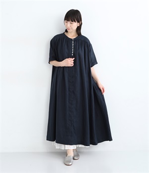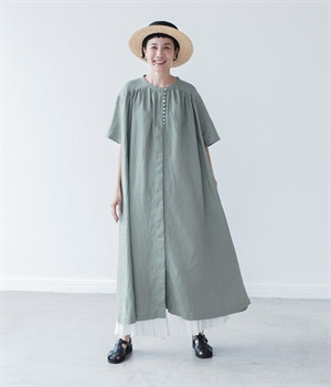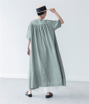 ゆったりとしたシルエットに、ネックラインから入った細やかなギャザーがやさしい表情を添えるワンピース。華美すぎず、シンプルすぎない絶妙なバランスで、日々の装いにそっと寄り添ってくれます。