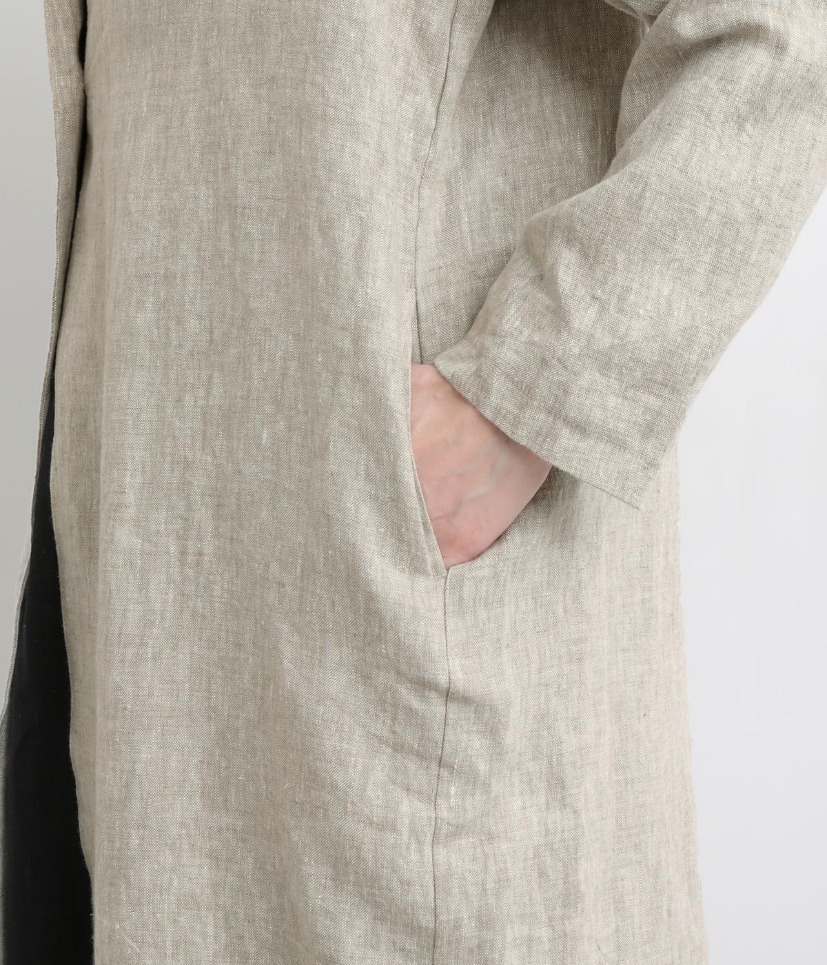 リネンの風合いを活かしたロングジャケット。襟元は、立ててモード風に、折り返してすっきりとしたテーラード調にと、表情を変えてたのしめます。ボタンをひとつだけにすることで、ナチュラルでこなれた雰囲気に仕上げました。軽めの羽織りとしても、ロングシーズン活躍する一着です。