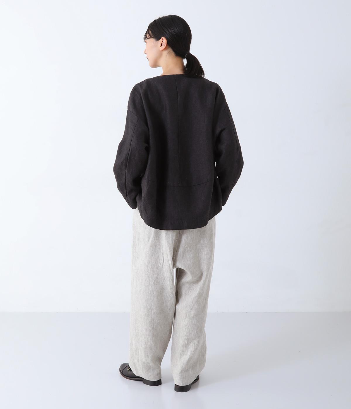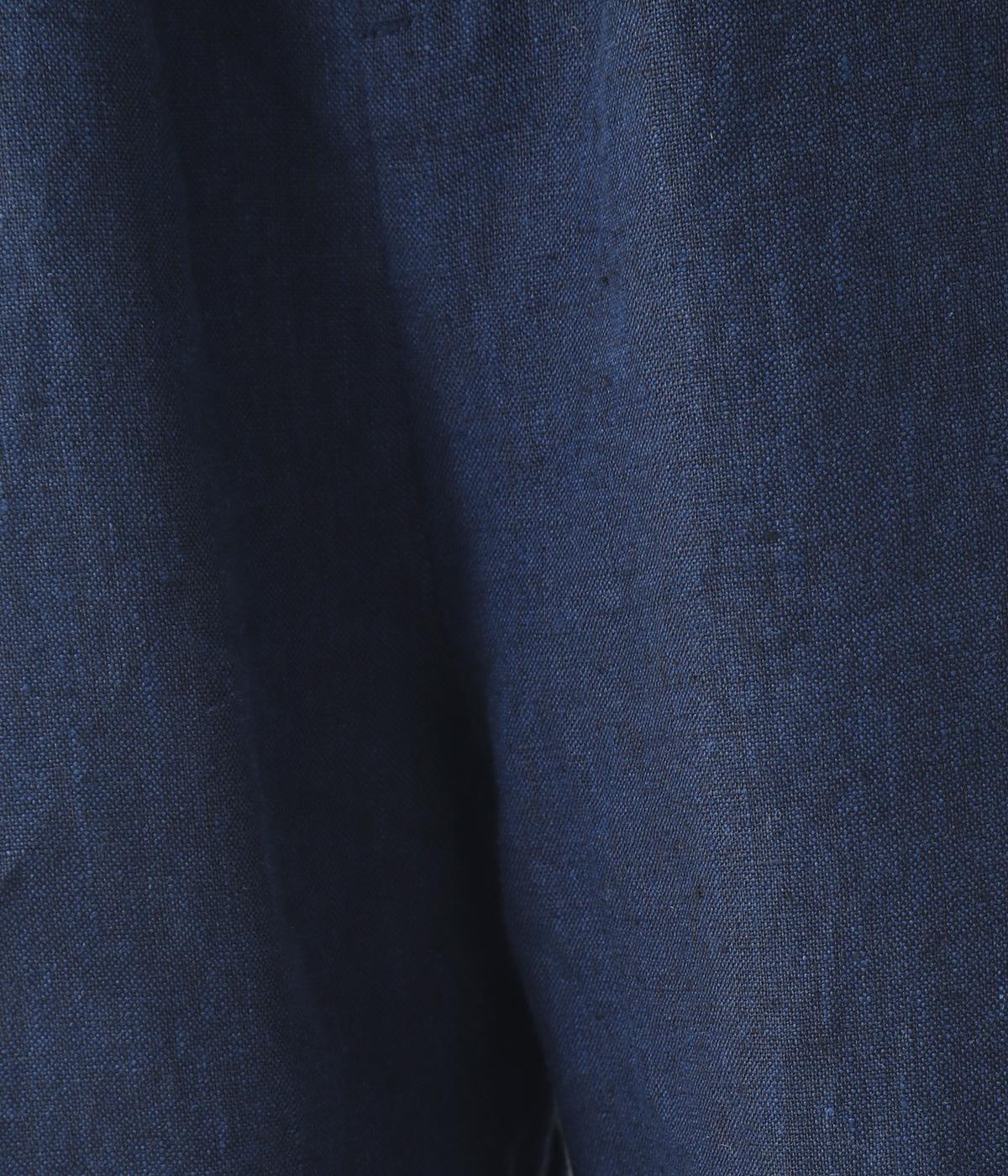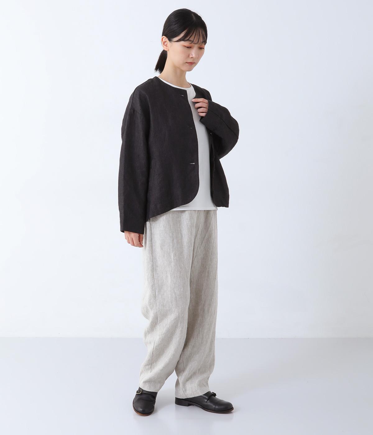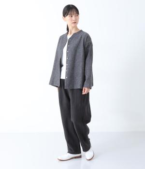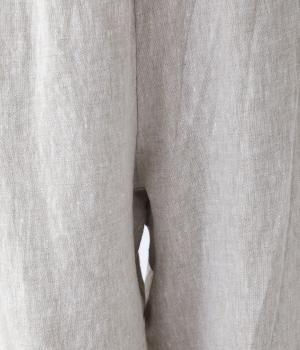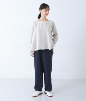 やや太めの9番手リネン糸で織り上げられた、ほどよいハリとしっかりとした厚みのある生地感です。色ムラやネップの見えるナチュラルさが際立つ見た目も魅力で、素材にこだわる大人らしい着こなしをたのしめます。