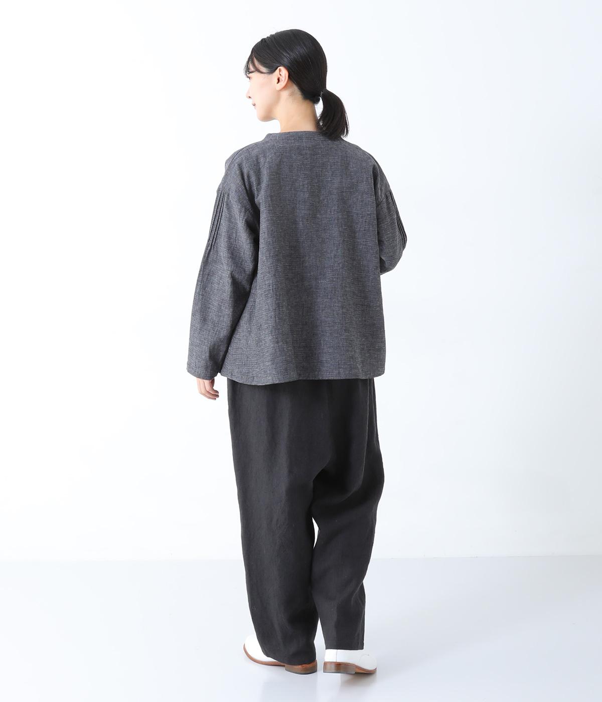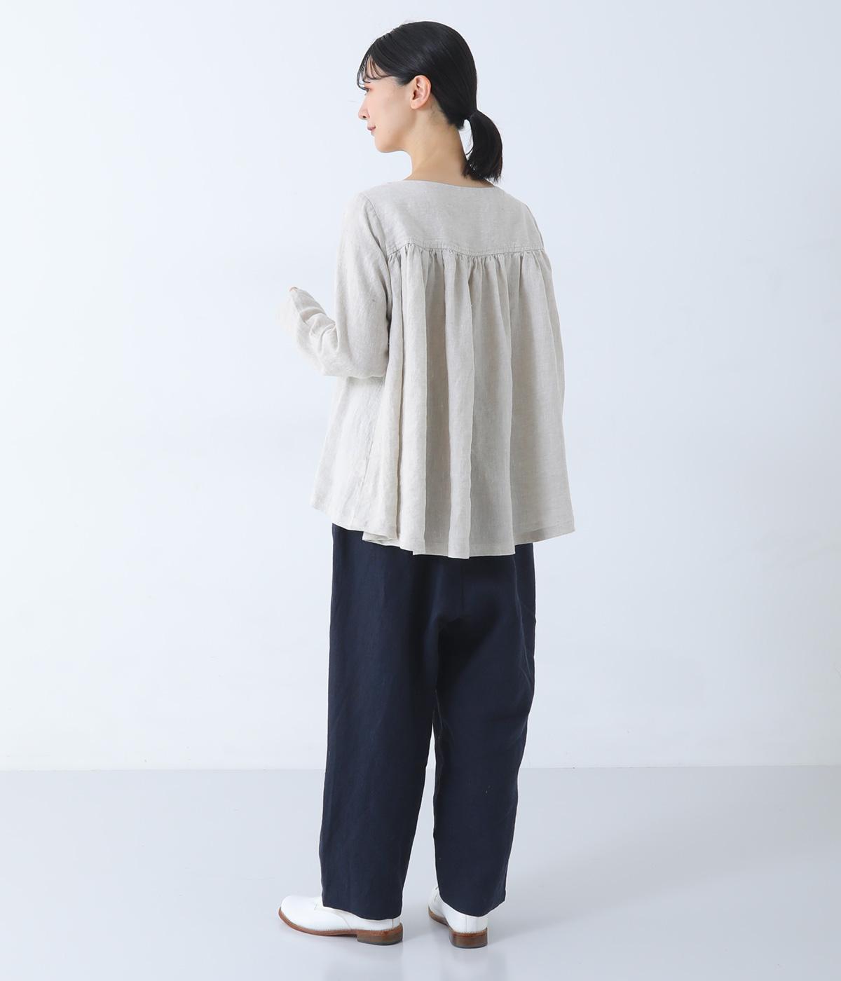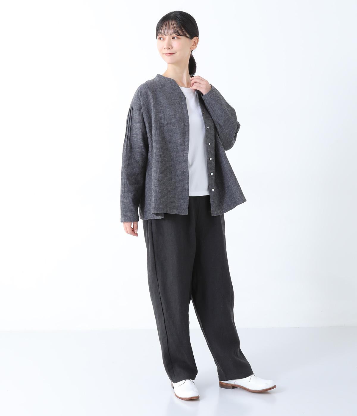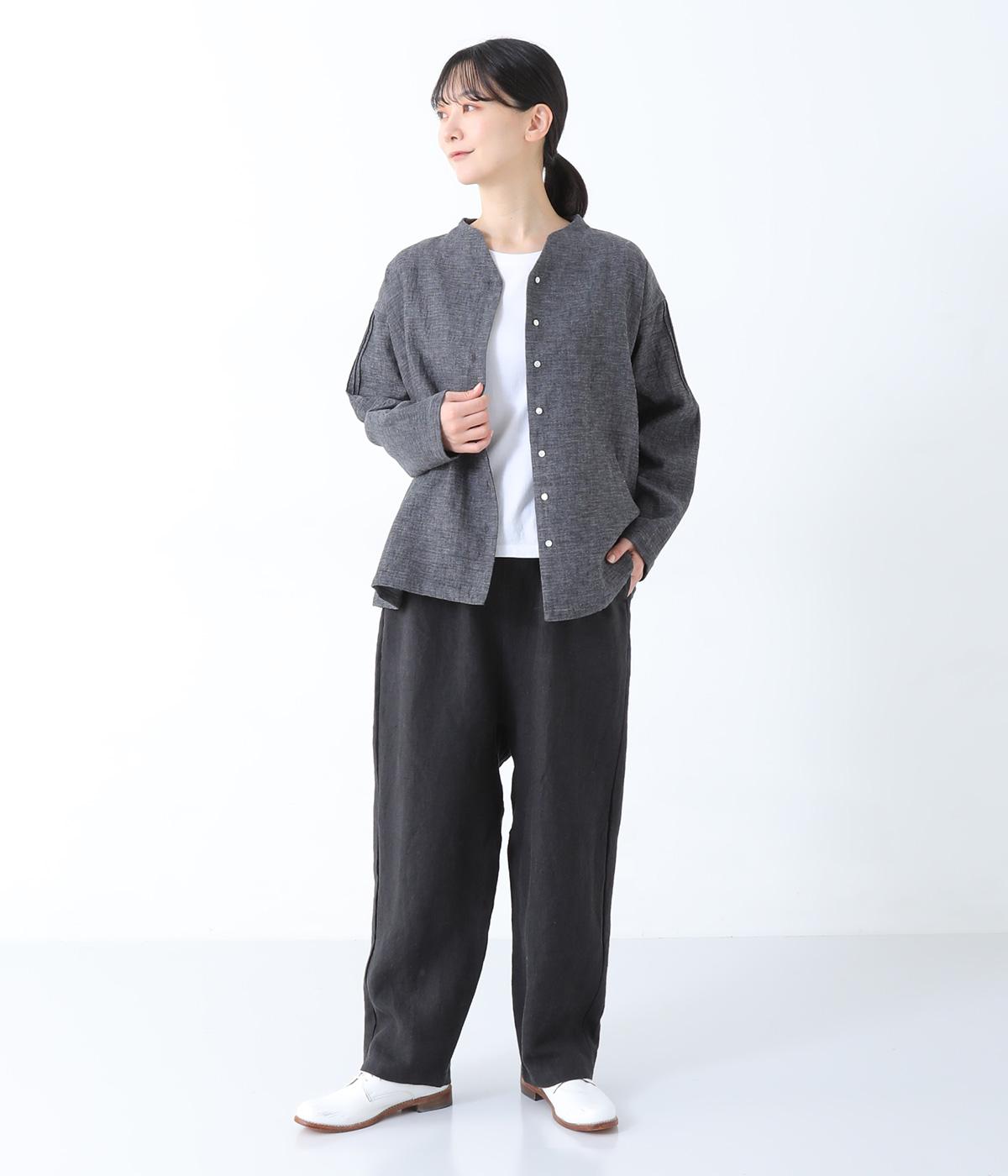 やや太めの9番手リネン糸で織り上げられた、ほどよいハリとしっかりとした厚みのある生地感です。色ムラやネップの見えるナチュラルさが際立つ見た目も魅力で、素材にこだわる大人らしい着こなしをたのしめます。