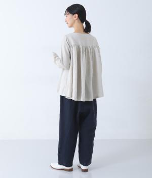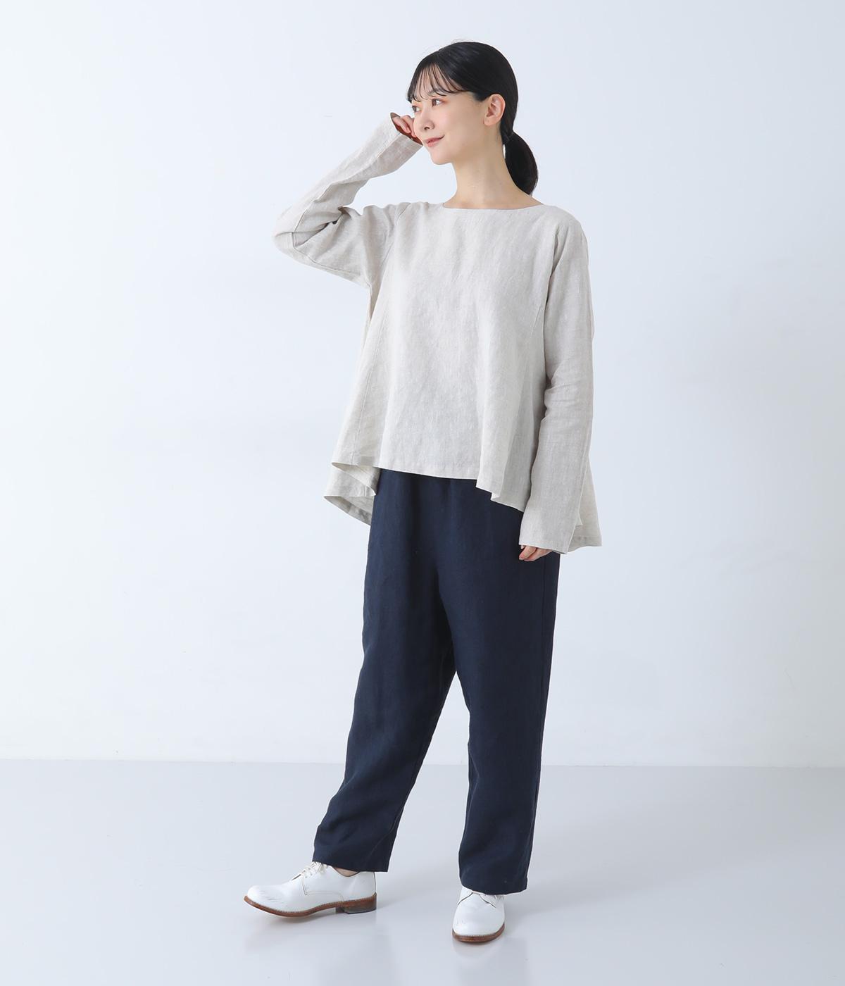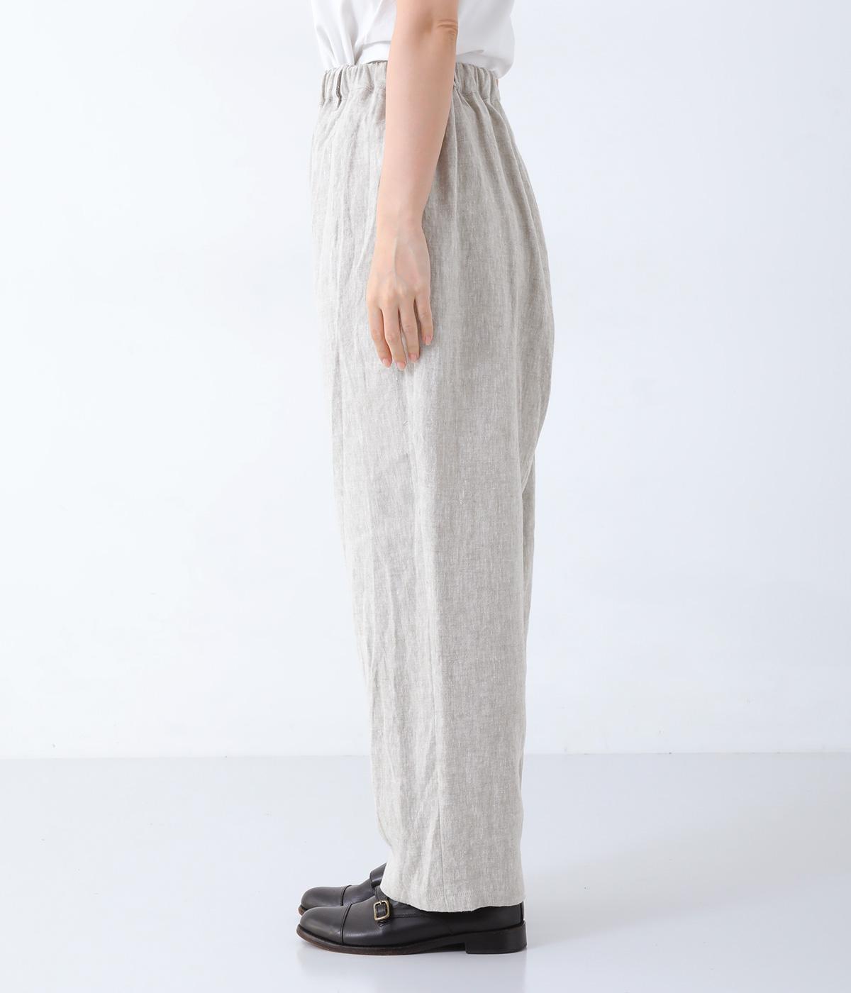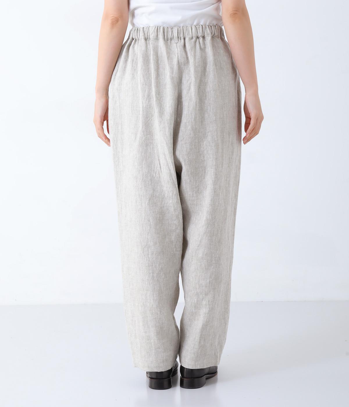 股上を深く設定し、ゆるっとリラックスして穿けるサルエルパンツ。リネン生地の自然な佇まいが映え、手抜き感のない大人ナチュラルなスタイルが完成します。体のラインをカバーしてくれるので、さまざまな着丈のトップスと好相性。ウエストは総ゴム仕様で、内側に紐を通しています。