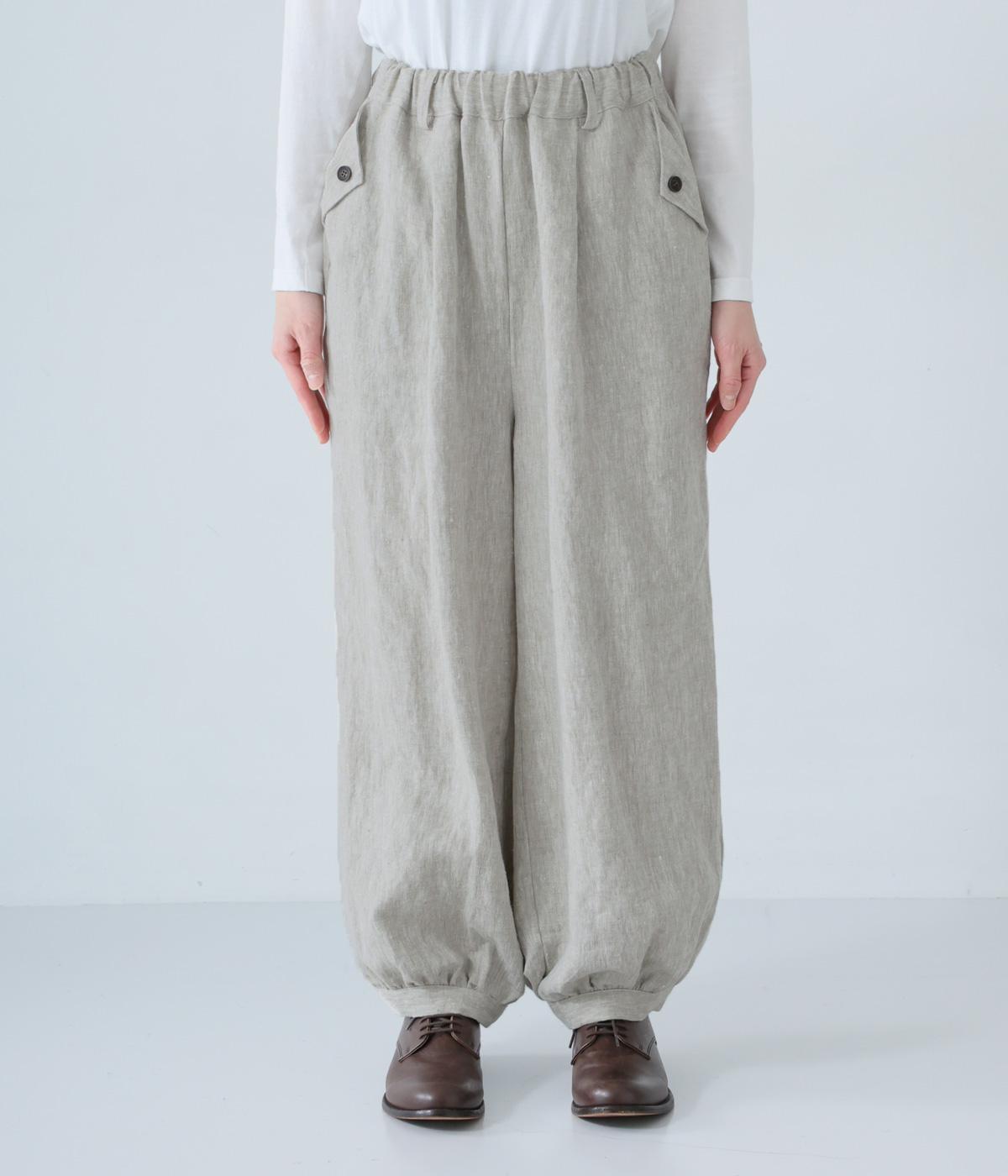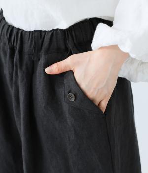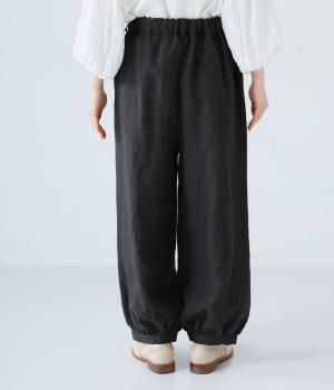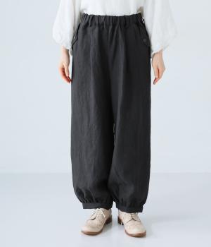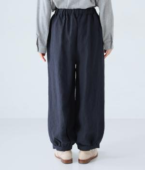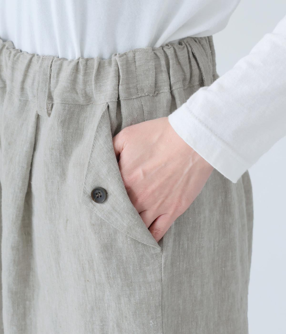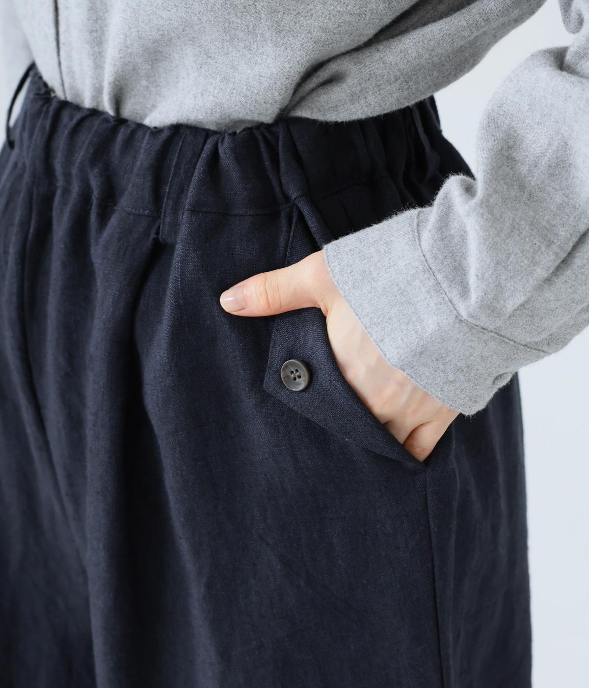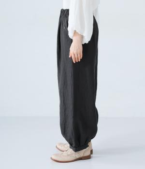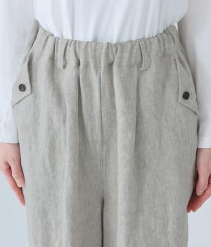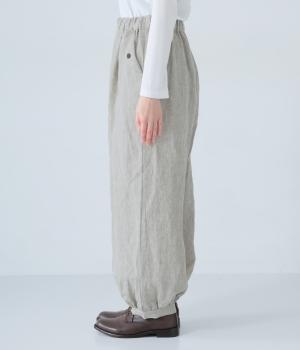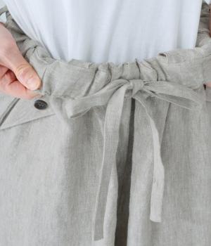 リネンの自然な佇まいが映える大人らしい一本。裾にギャザーを入れてゆったりとしたシルエットに丸みを持たせました。フラップとボタンをつけたサイドポケットがアクセントに。ウエストは総ゴム仕様で、内側にフィット感を高める紐をプラスしています。