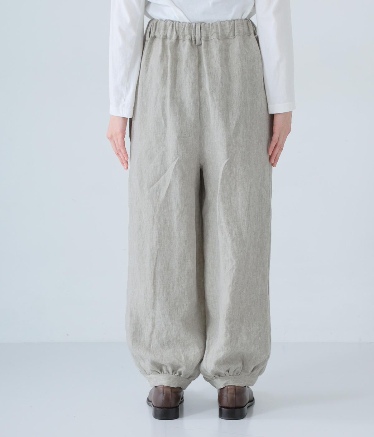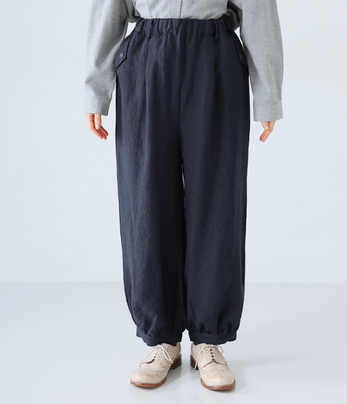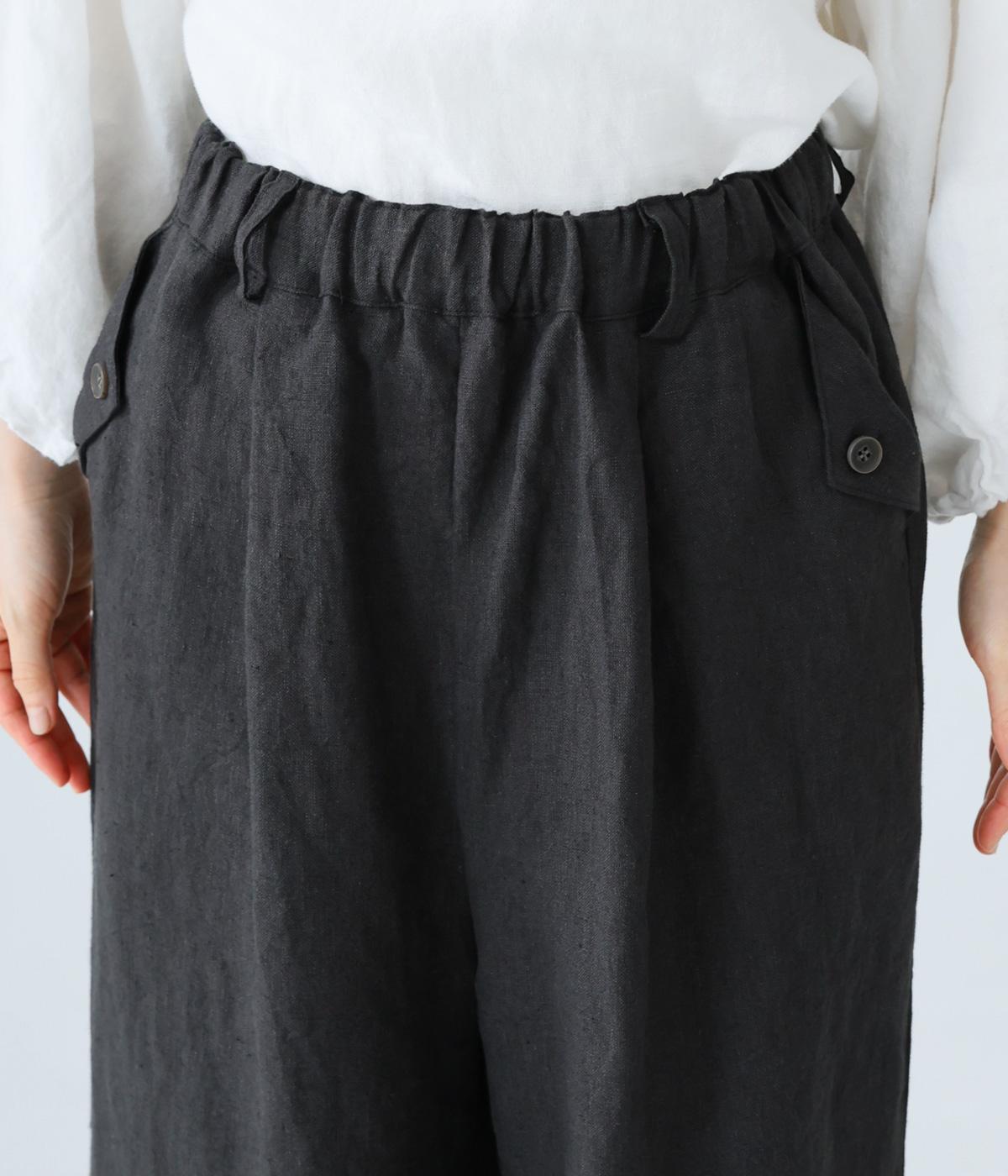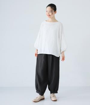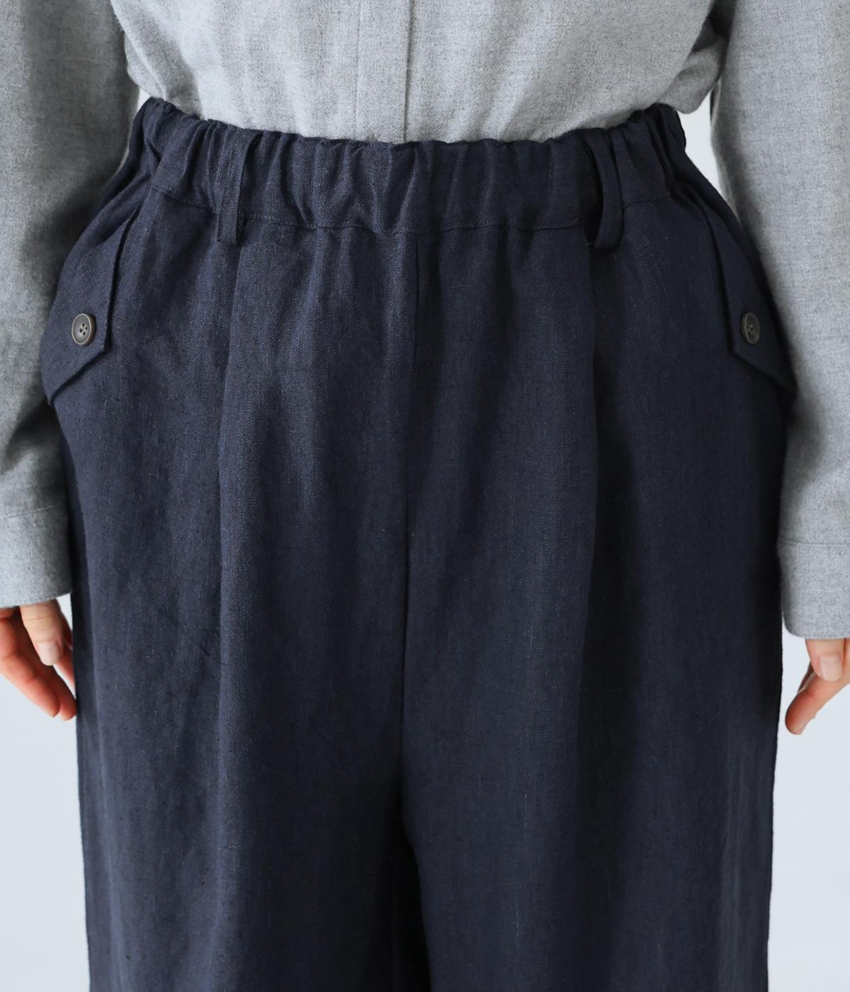リネンの自然な佇まいが映える大人らしい一本。裾にギャザーを入れてゆったりとしたシルエットに丸みを持たせました。フラップとボタンをつけたサイドポケットがアクセントに。ウエストは総ゴム仕様で、内側にフィット感を高める紐をプラスしています。