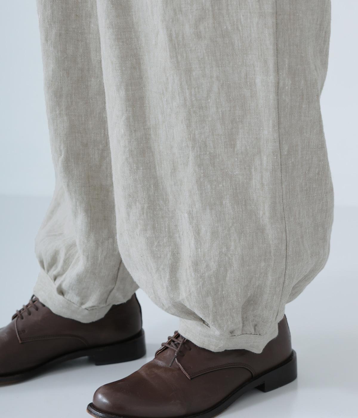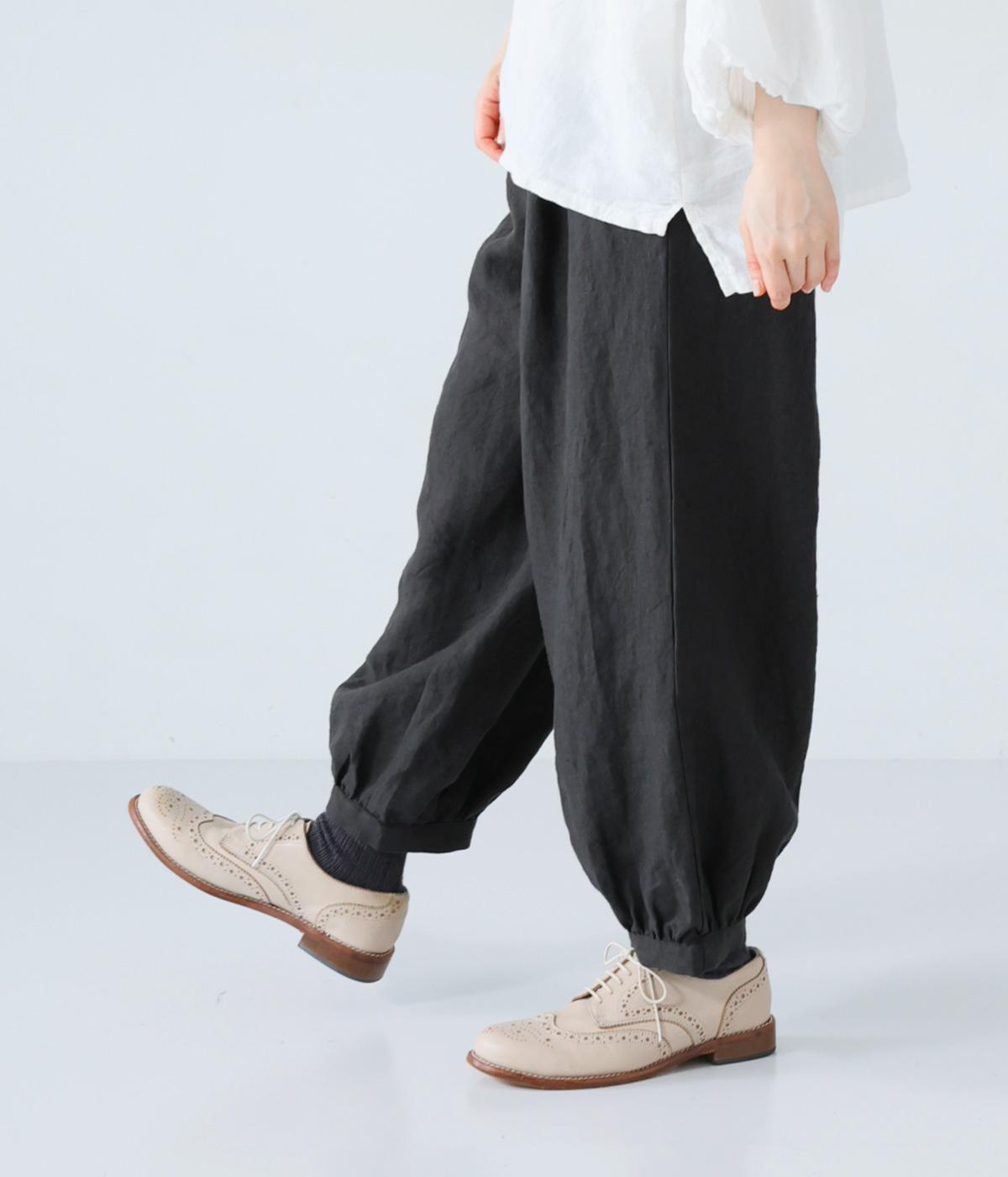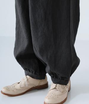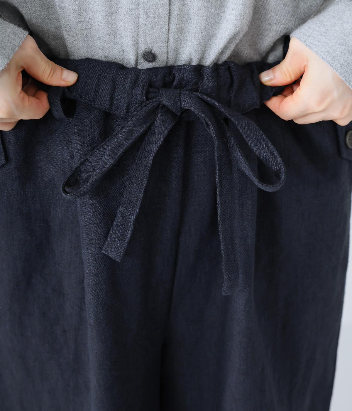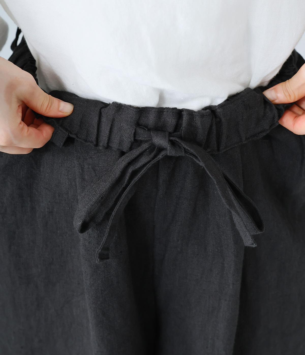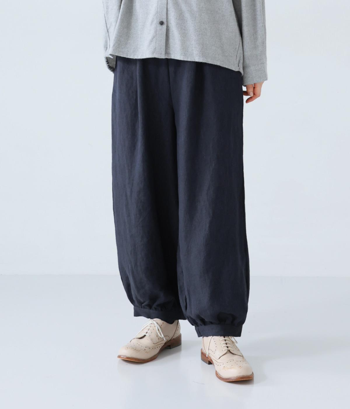 リネンの自然な佇まいが映える大人らしい一本。裾にギャザーを入れてゆったりとしたシルエットに丸みを持たせました。フラップとボタンをつけたサイドポケットがアクセントに。ウエストは総ゴム仕様で、内側にフィット感を高める紐をプラスしています。