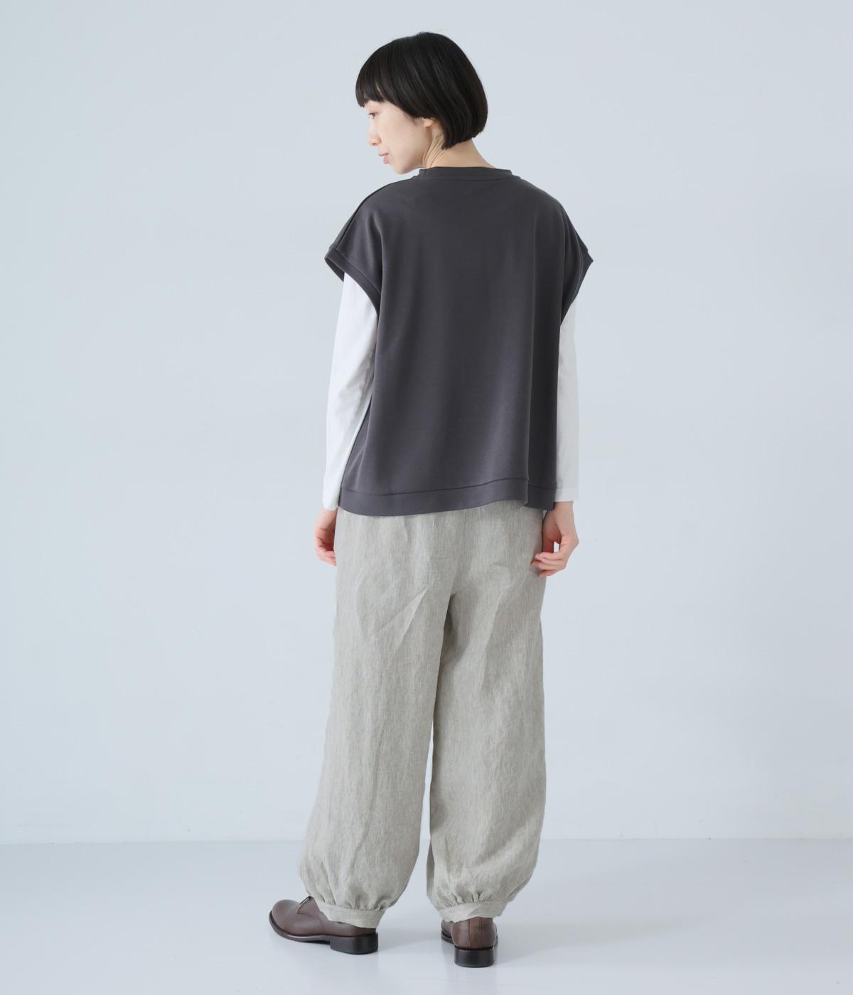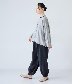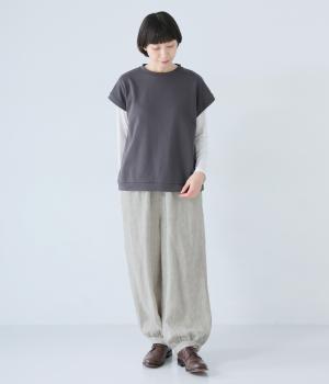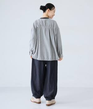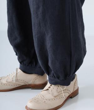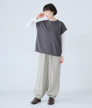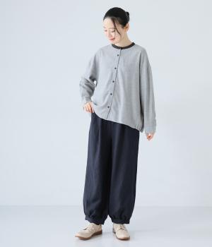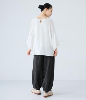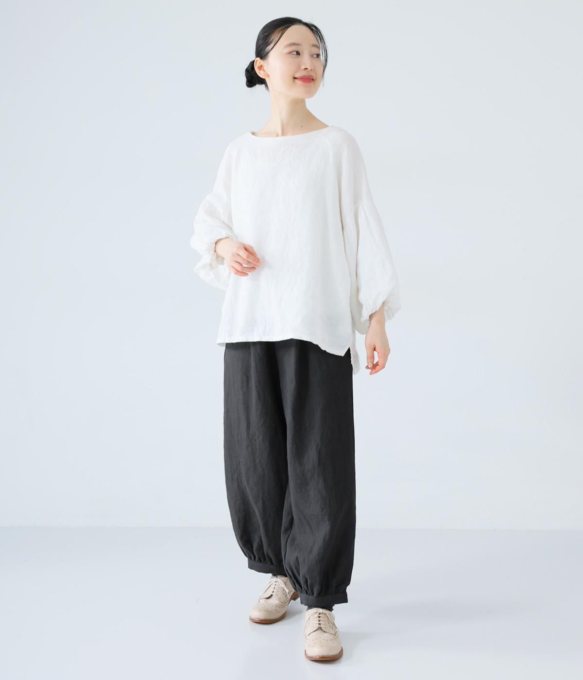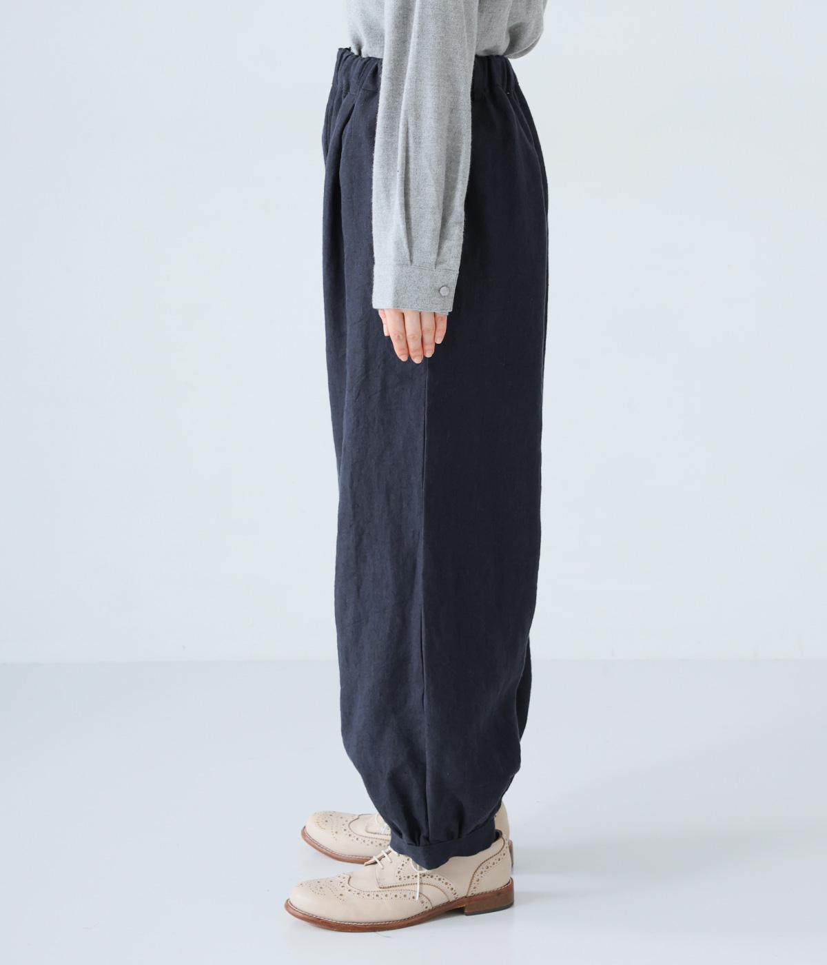 リネンの自然な佇まいが映える大人らしい一本。裾にギャザーを入れてゆったりとしたシルエットに丸みを持たせました。フラップとボタンをつけたサイドポケットがアクセントに。ウエストは総ゴム仕様で、内側にフィット感を高める紐をプラスしています。