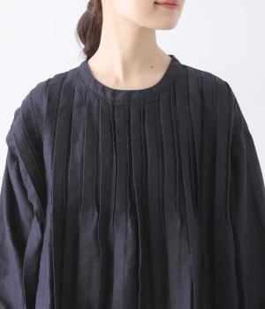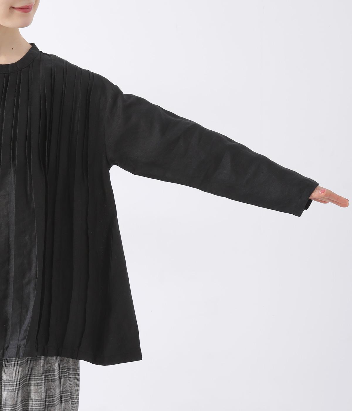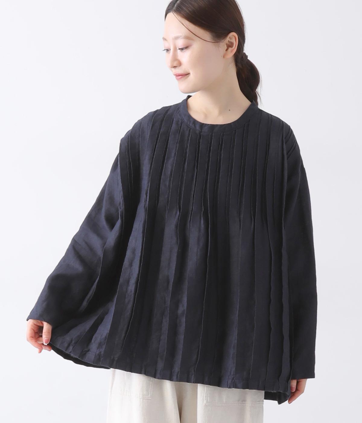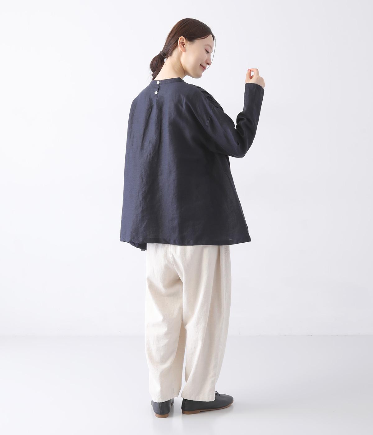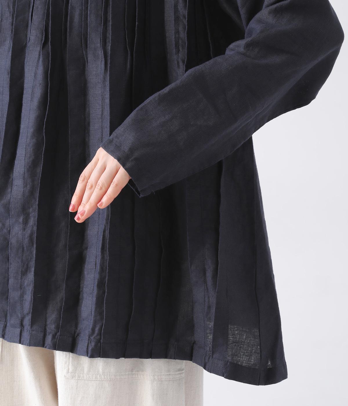 ナチュラルな佇まいのリネンブラウスに、巾違いのピンタックデザインで華やかさをプラス。風が通り抜けるようなふんわりシルエットも、縦ラインを強調するピンタックですっきりと見せています。着脱をアシストする、後ろネックのボタンもポイントです。