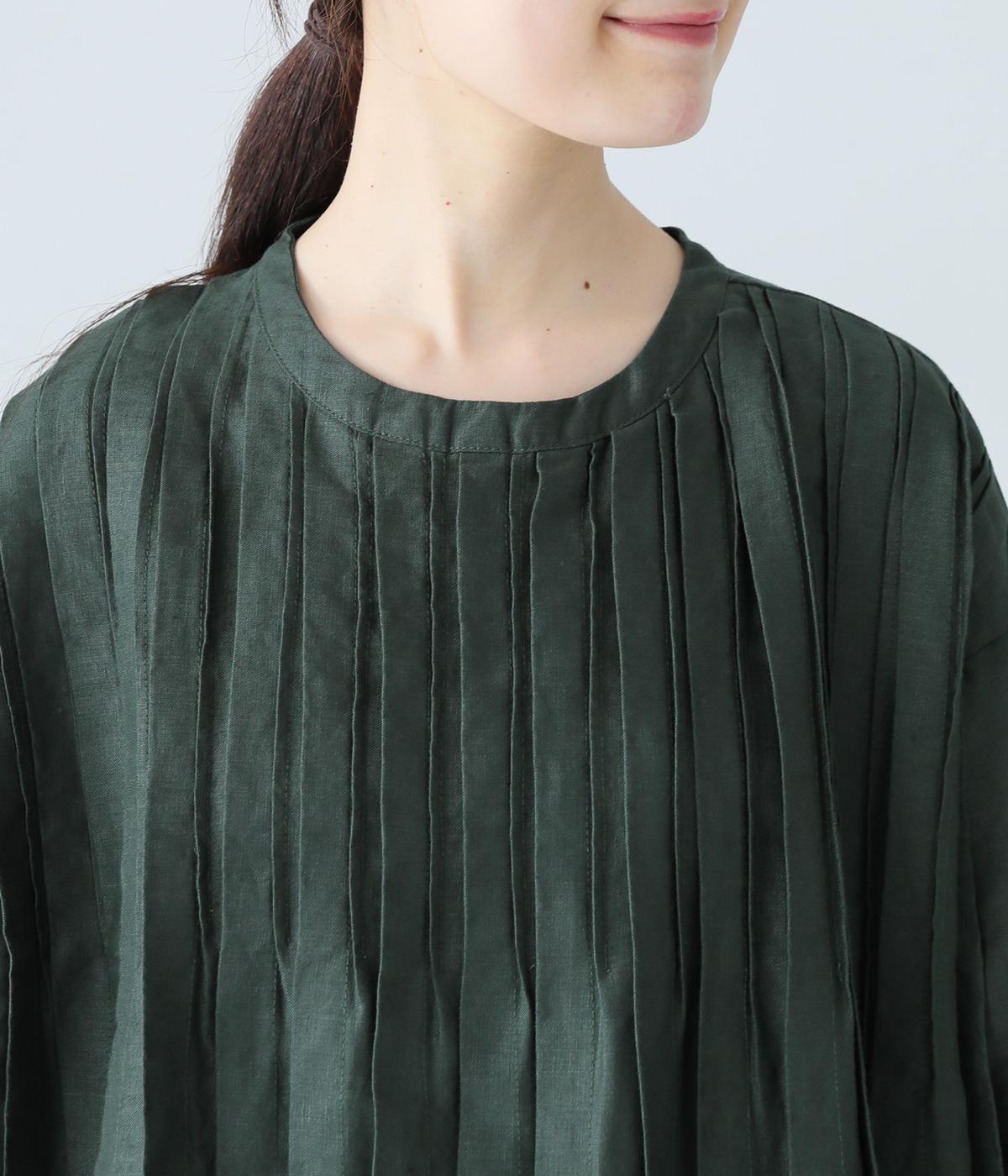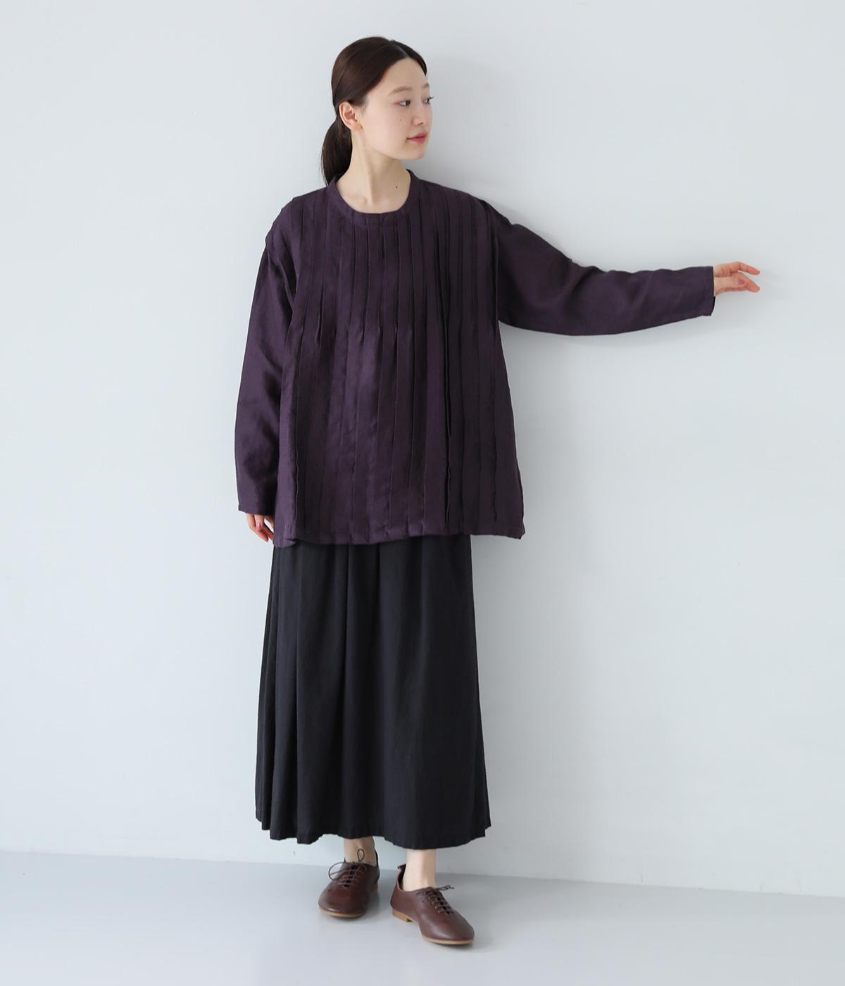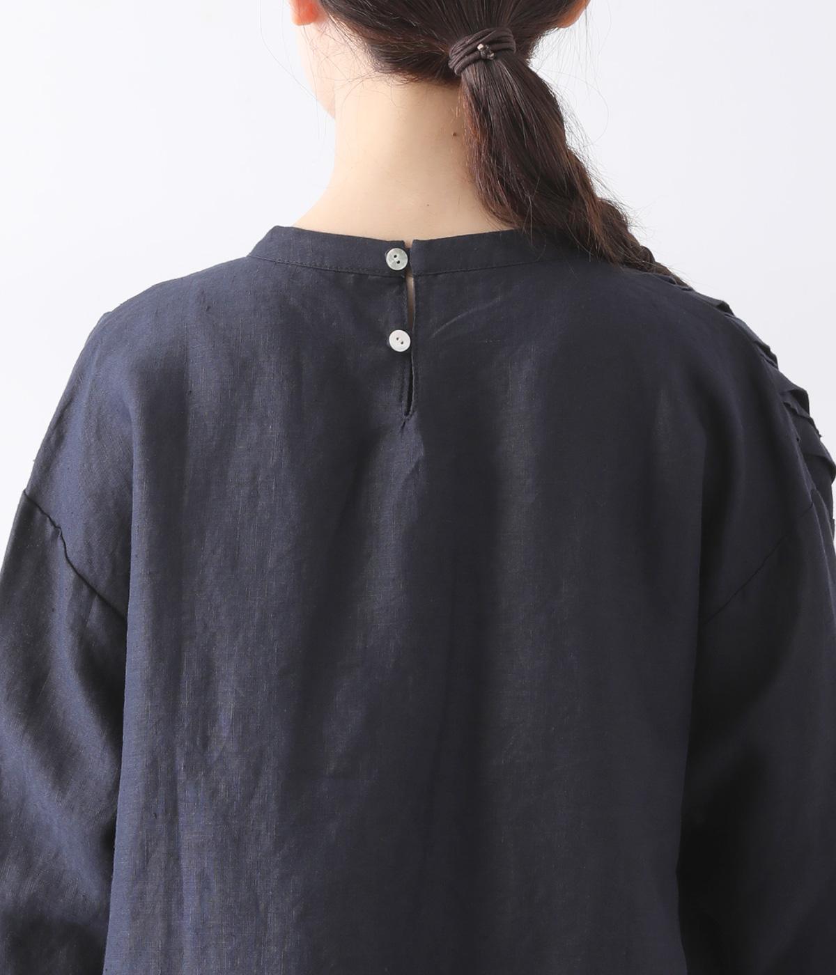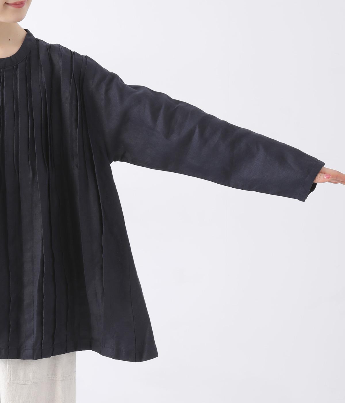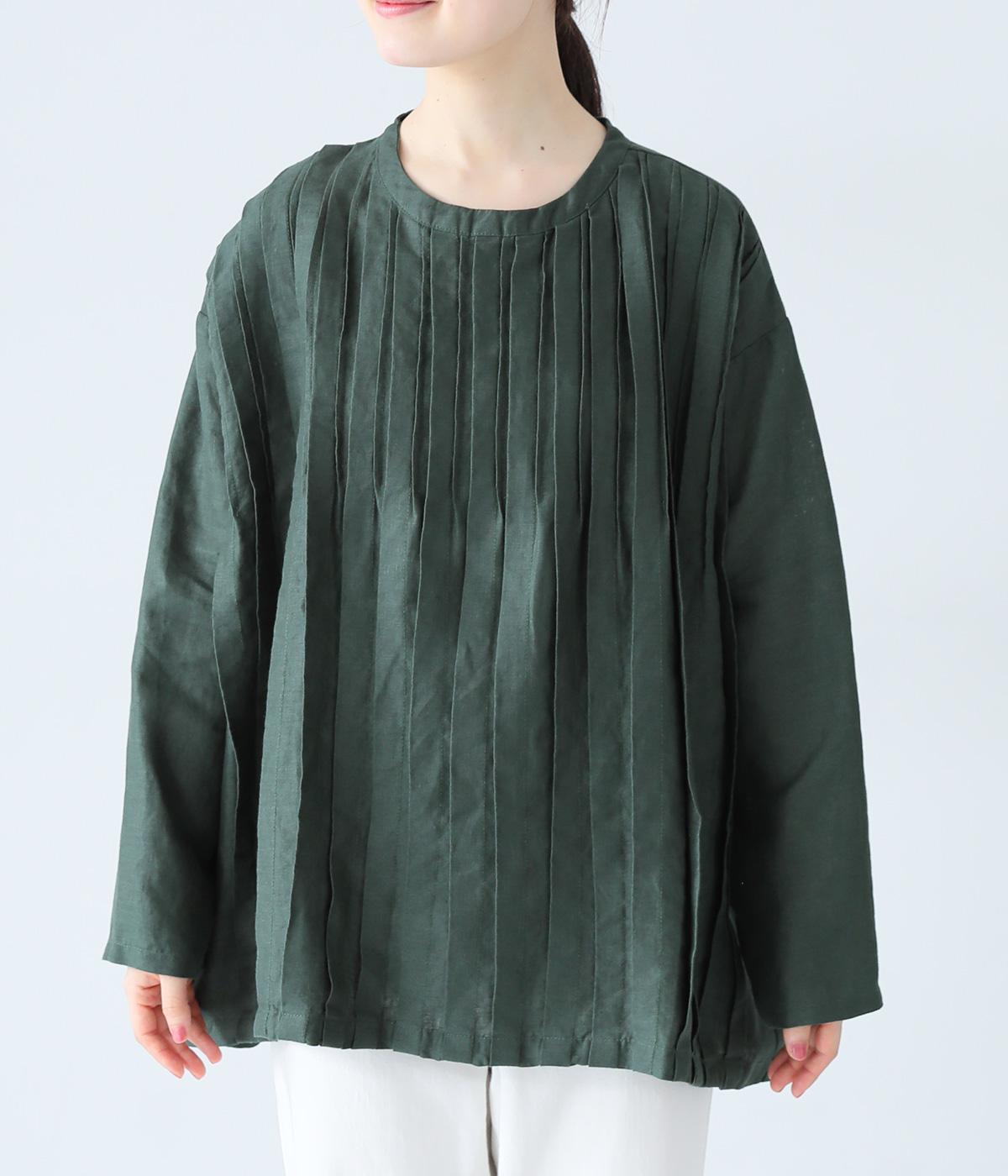 ナチュラルな佇まいのリネンブラウスに、巾違いのピンタックデザインで華やかさをプラス。風が通り抜けるようなふんわりシルエットも、縦ラインを強調するピンタックですっきりと見せています。着脱をアシストする、後ろネックのボタンもポイントです。