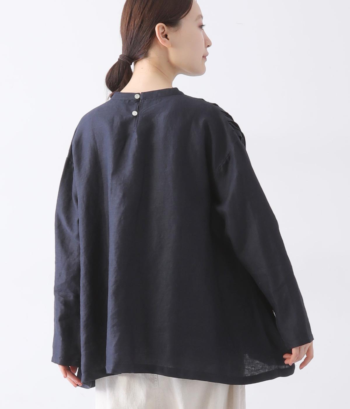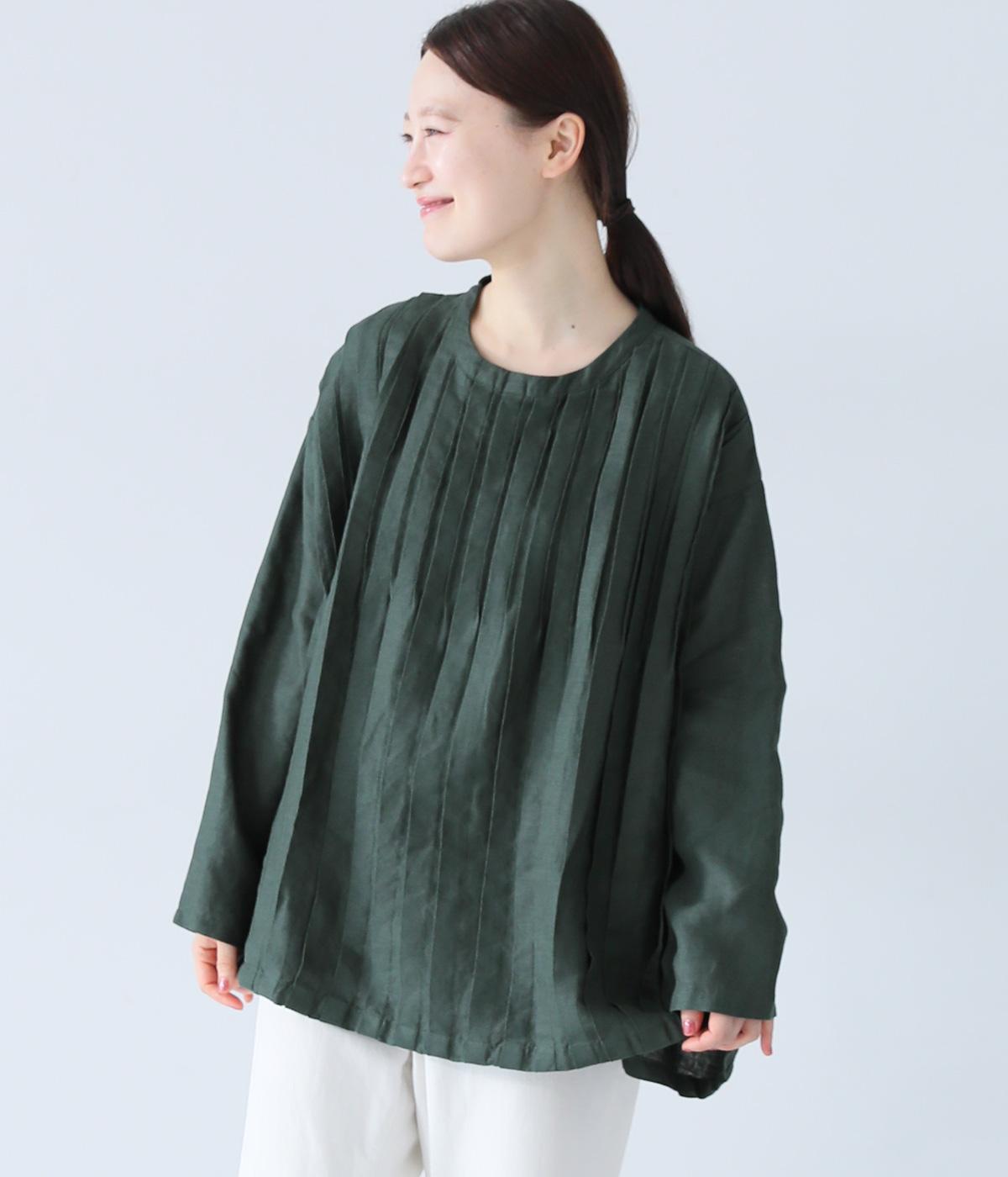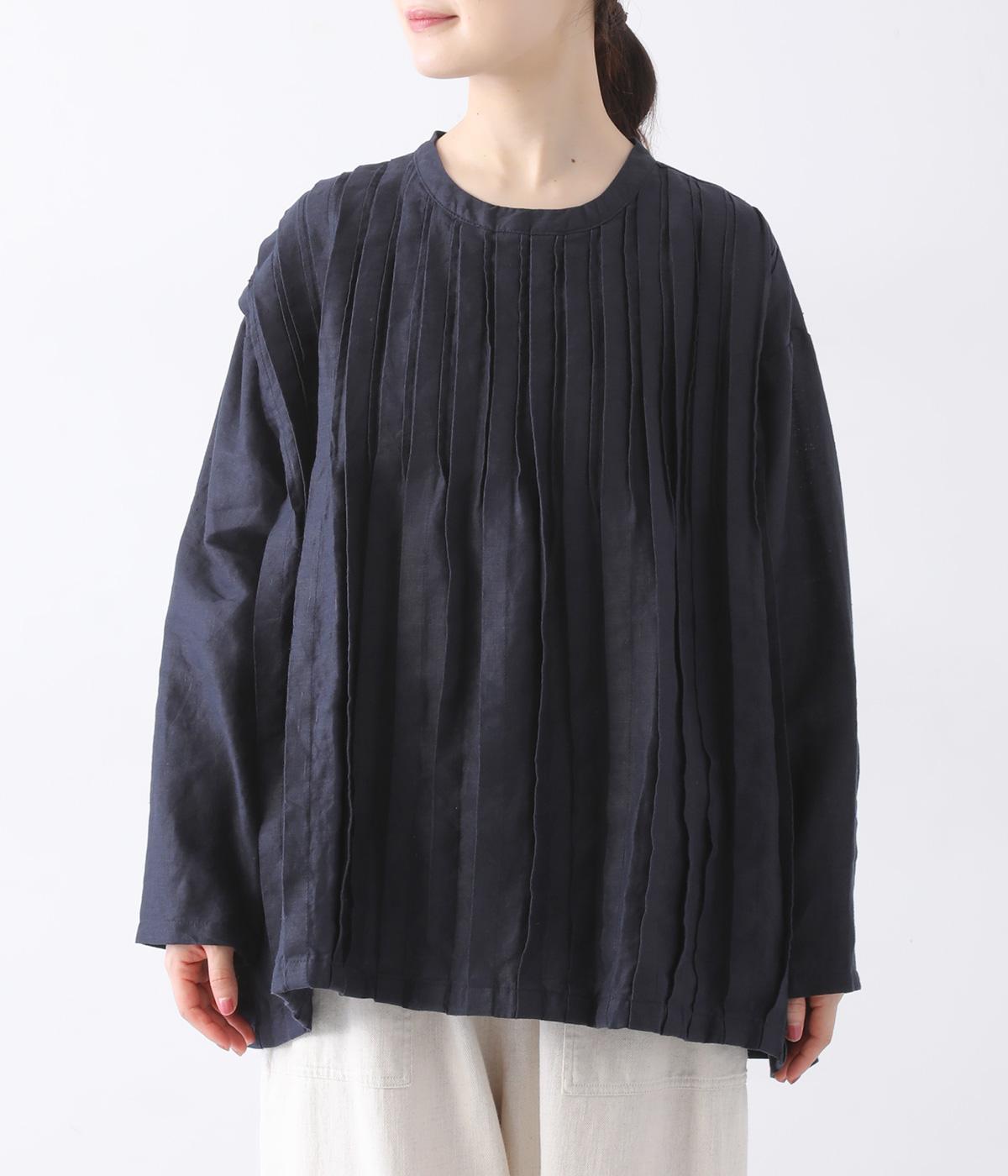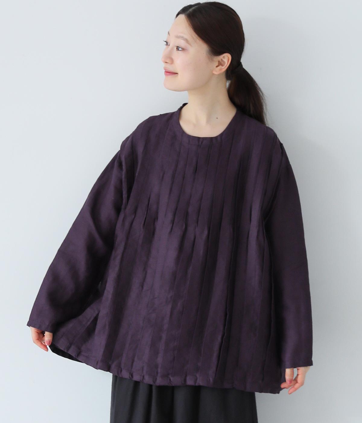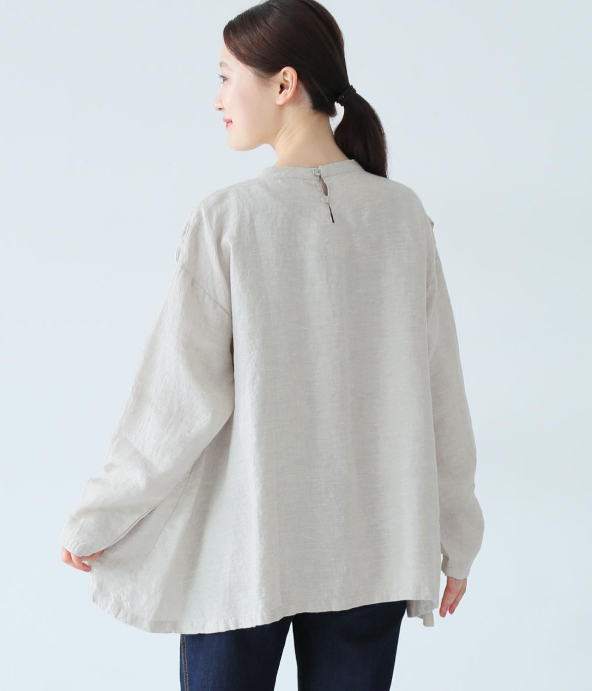 ナチュラルな佇まいのリネンブラウスに、巾違いのピンタックデザインで華やかさをプラス。風が通り抜けるようなふんわりシルエットも、縦ラインを強調するピンタックですっきりと見せています。着脱をアシストする、後ろネックのボタンもポイントです。