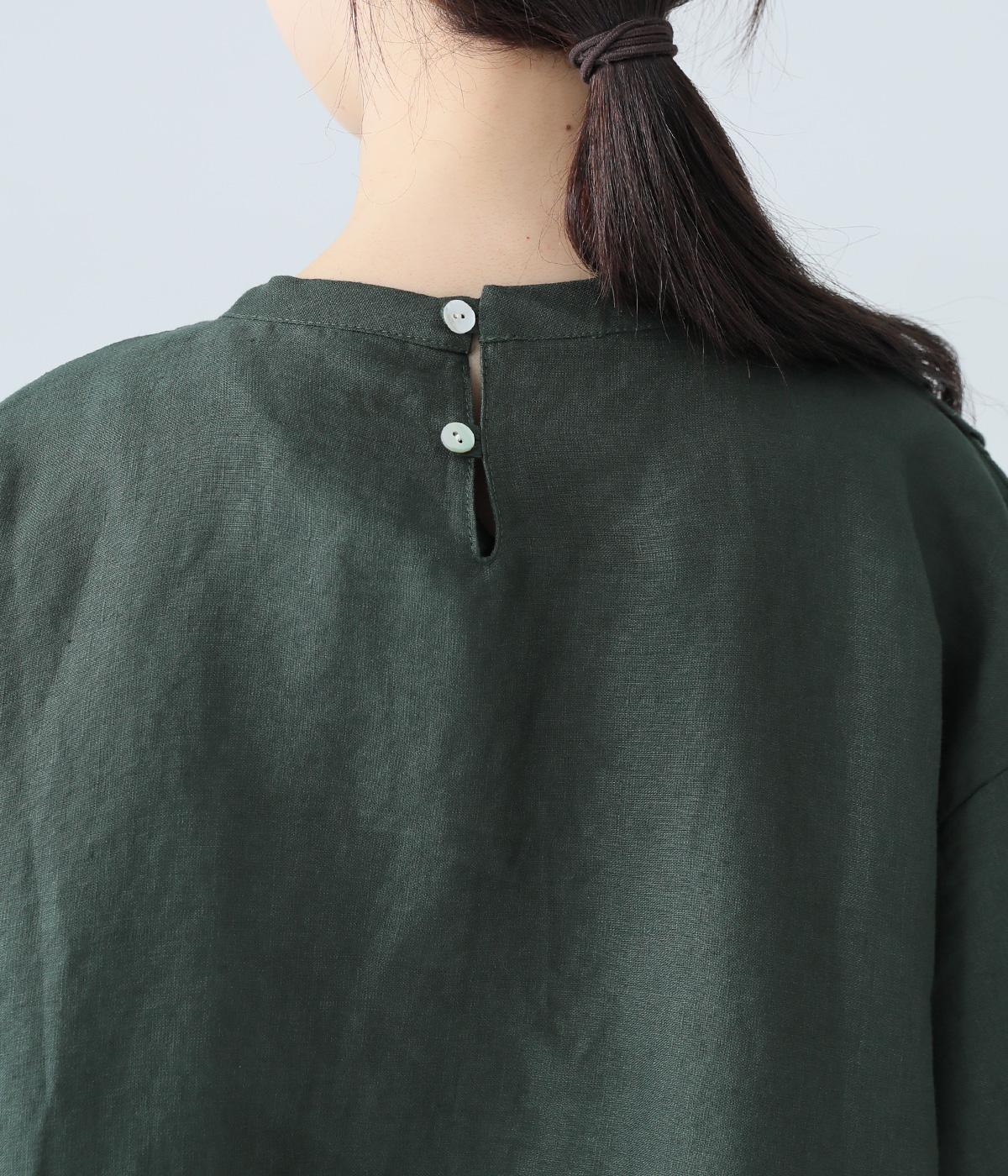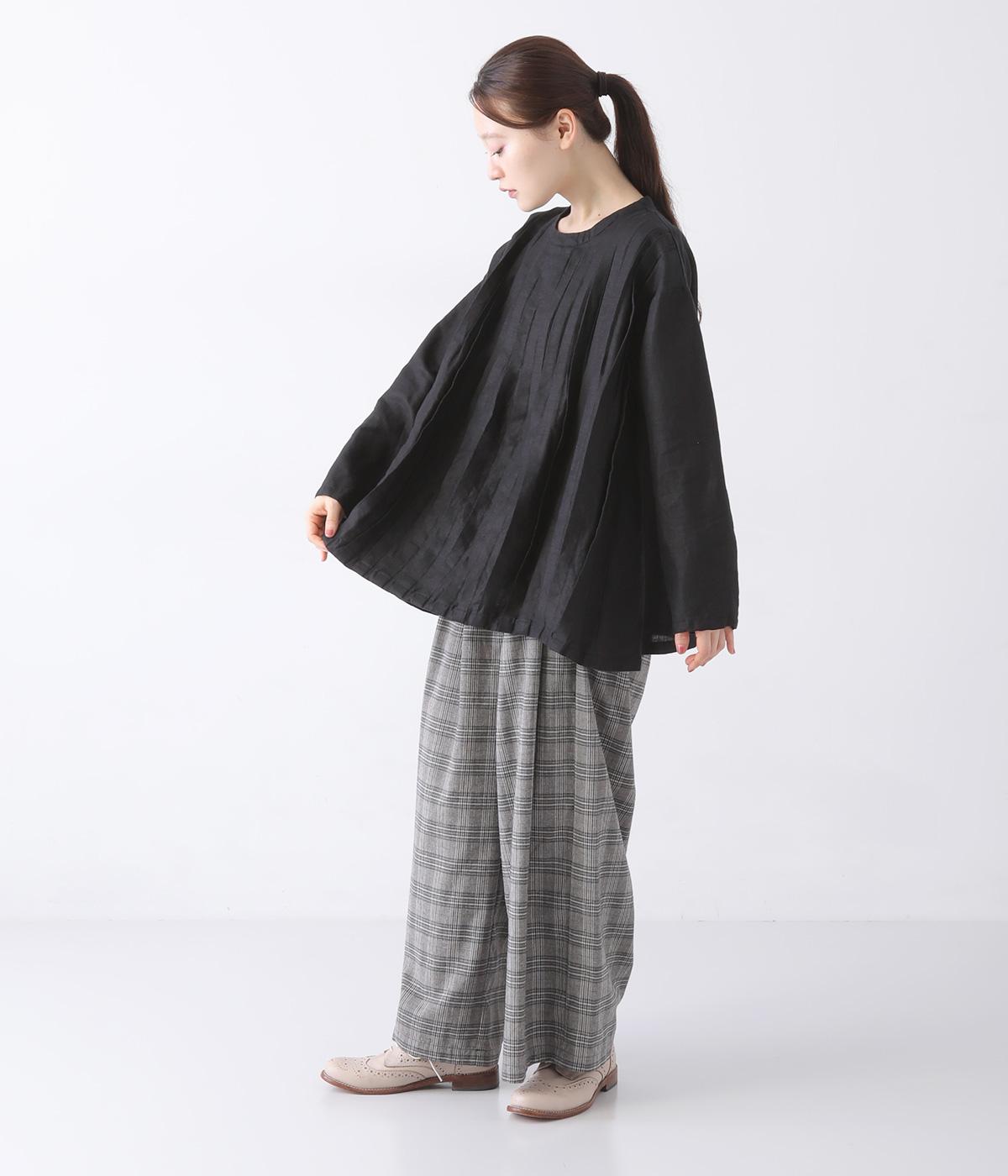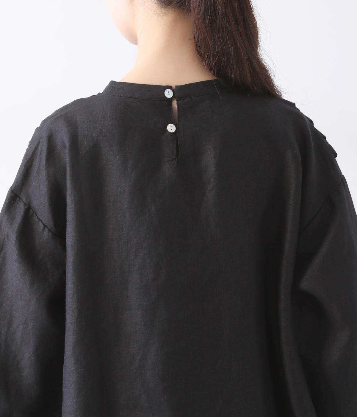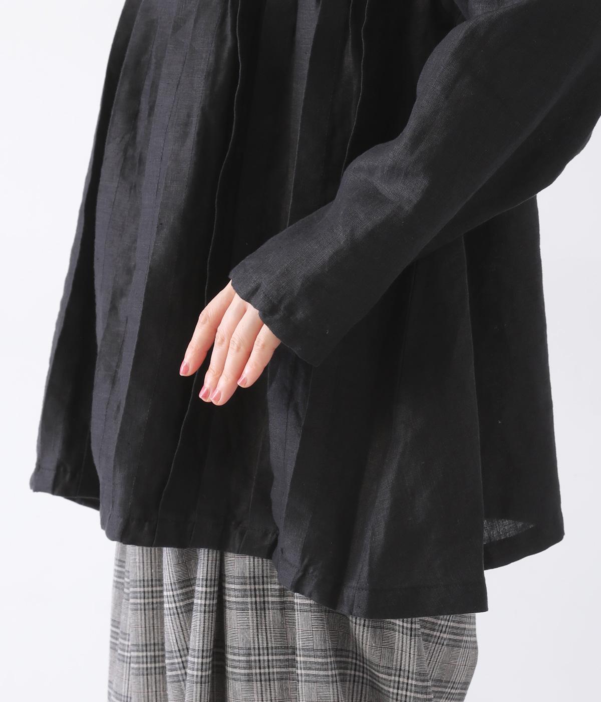 ナチュラルな佇まいのリネンブラウスに、巾違いのピンタックデザインで華やかさをプラス。風が通り抜けるようなふんわりシルエットも、縦ラインを強調するピンタックですっきりと見せています。着脱をアシストする、後ろネックのボタンもポイントです。