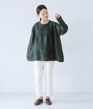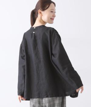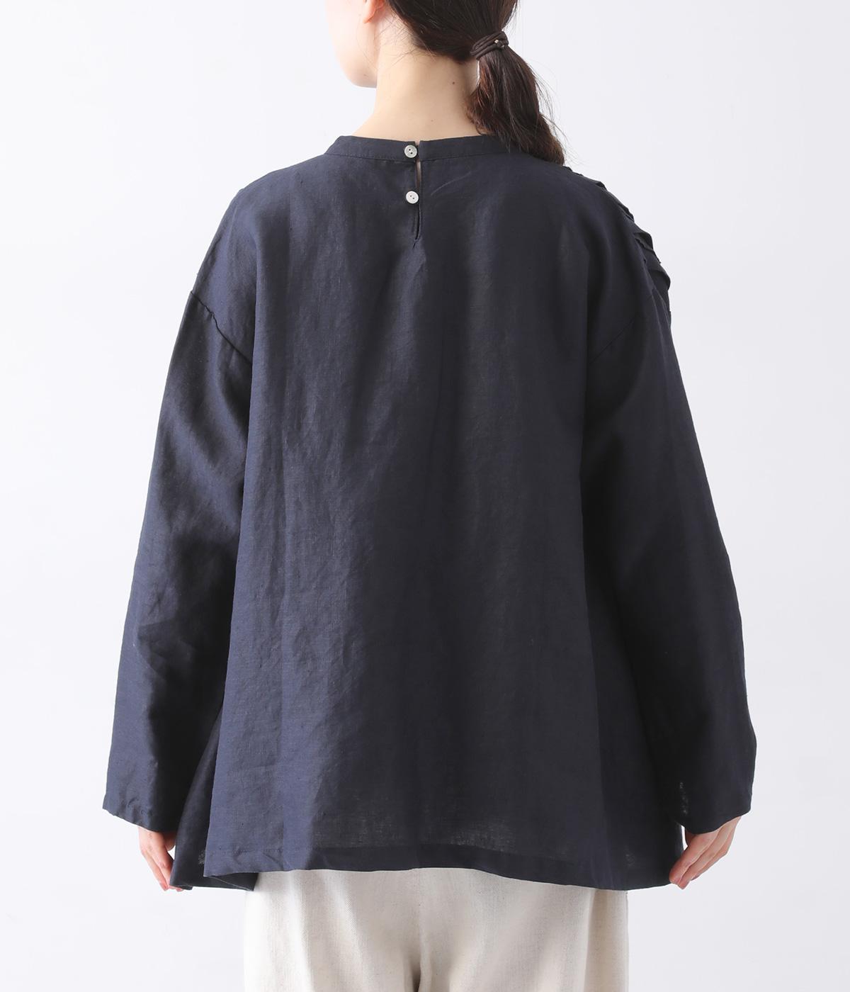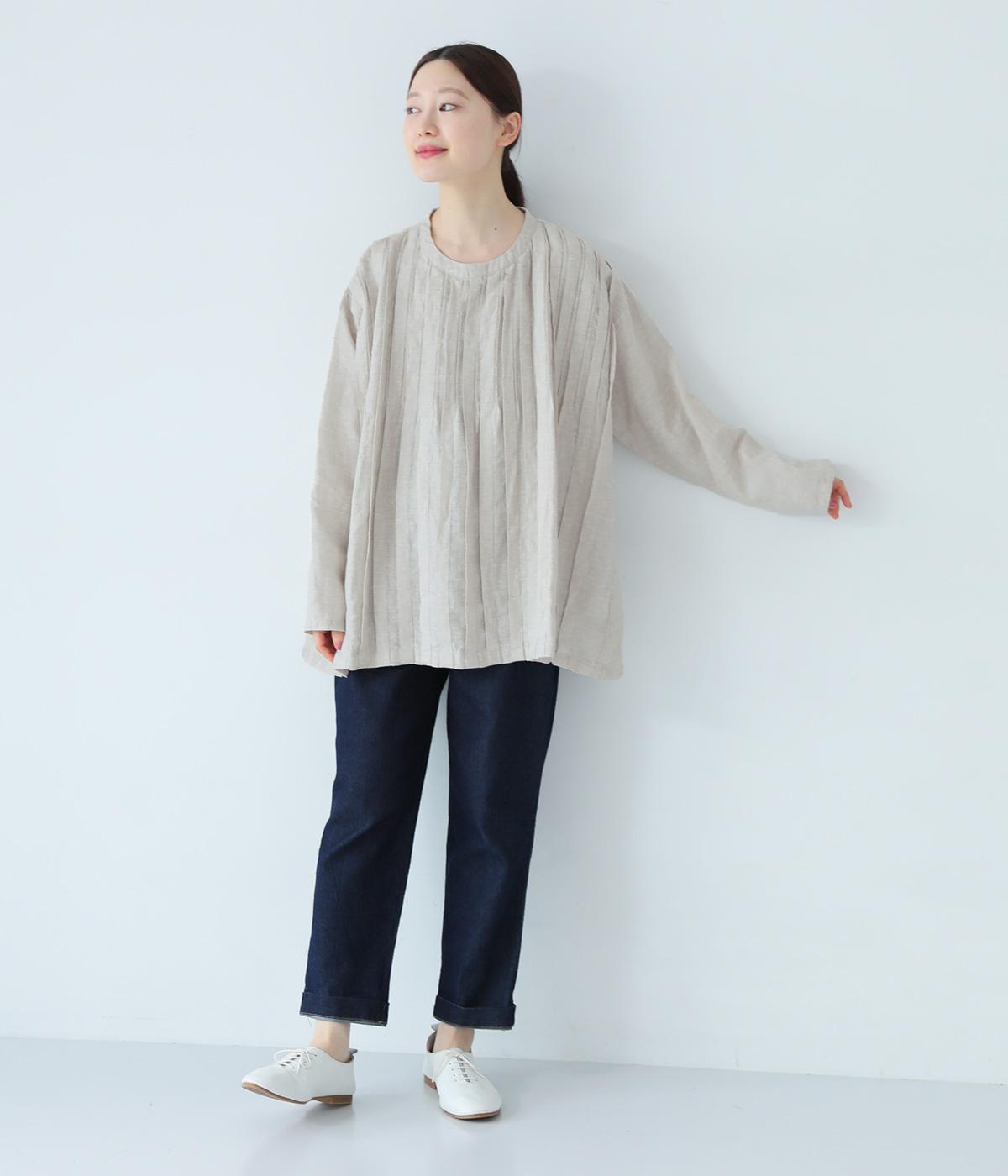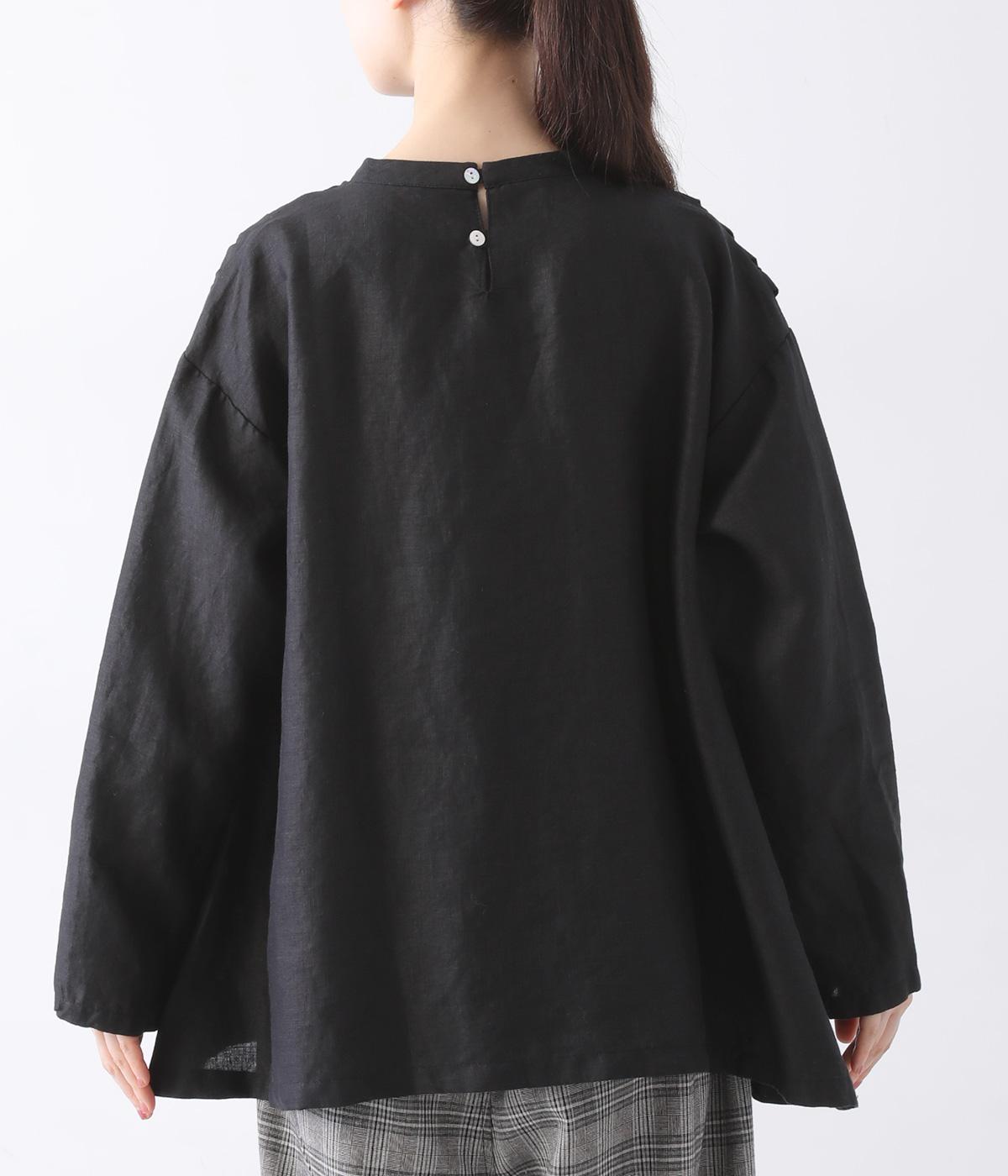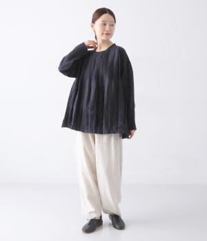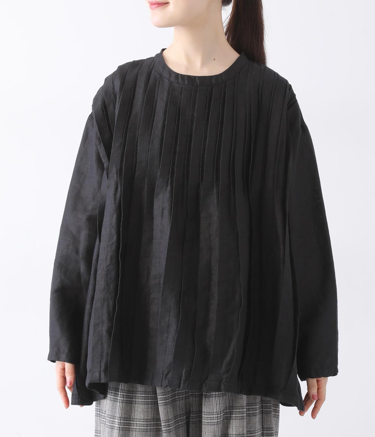 ナチュラルな佇まいのリネンブラウスに、巾違いのピンタックデザインで華やかさをプラス。風が通り抜けるようなふんわりシルエットも、縦ラインを強調するピンタックですっきりと見せています。着脱をアシストする、後ろネックのボタンもポイントです。