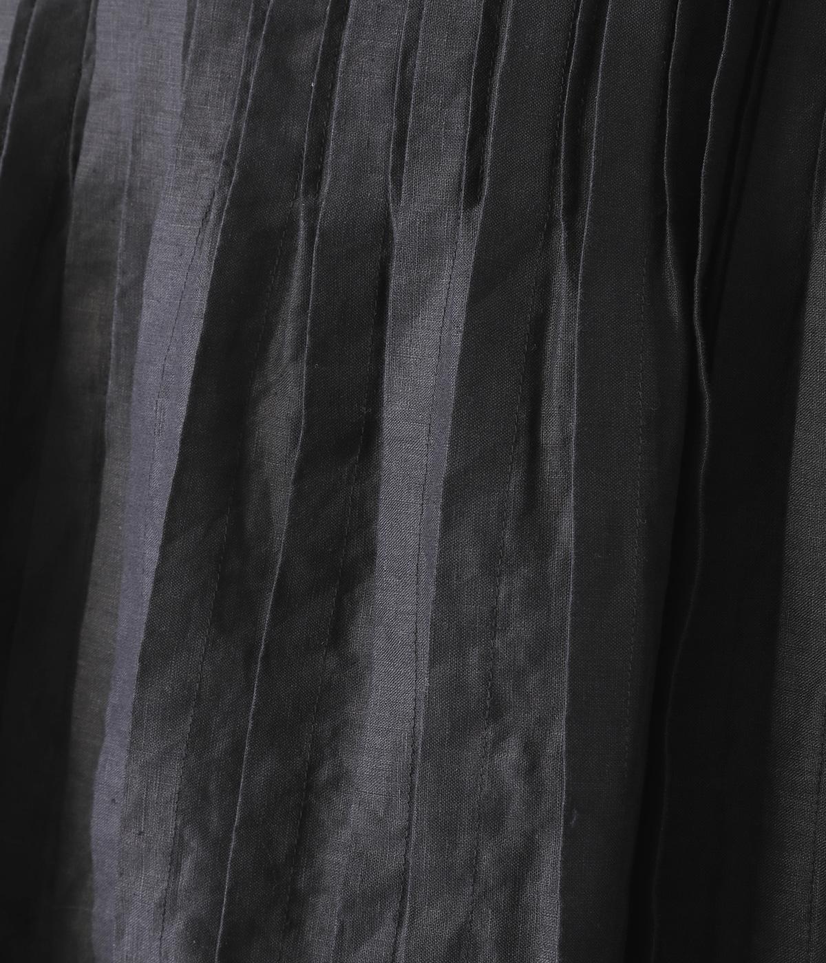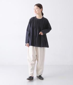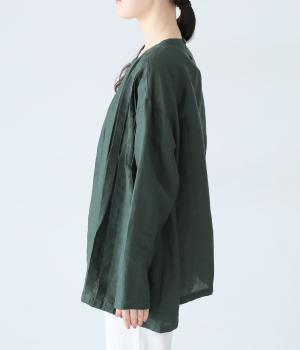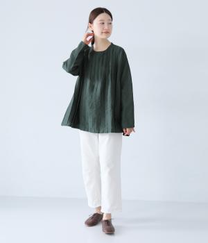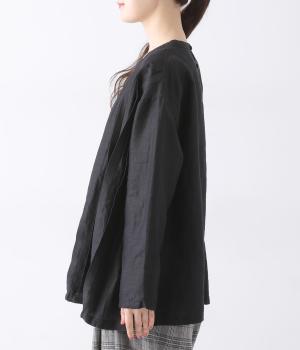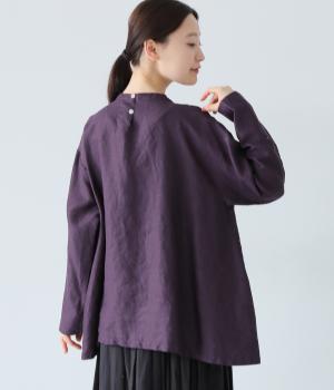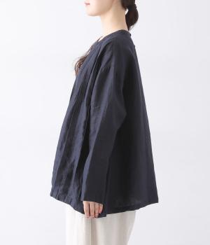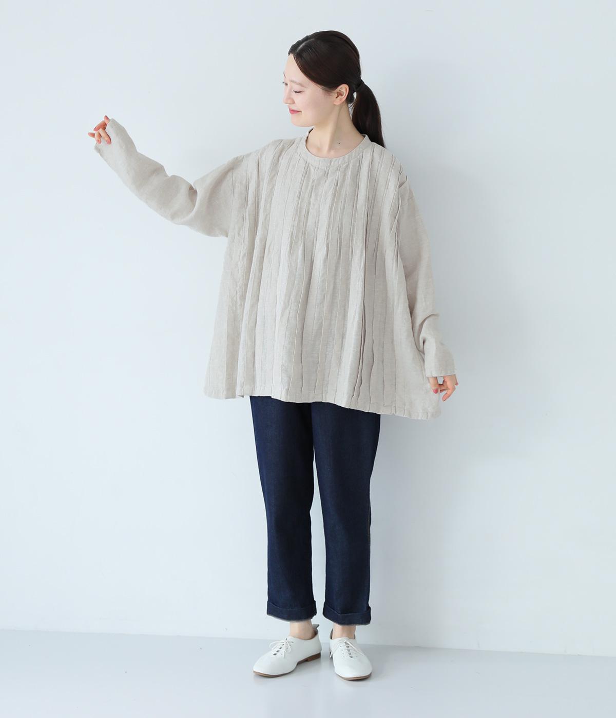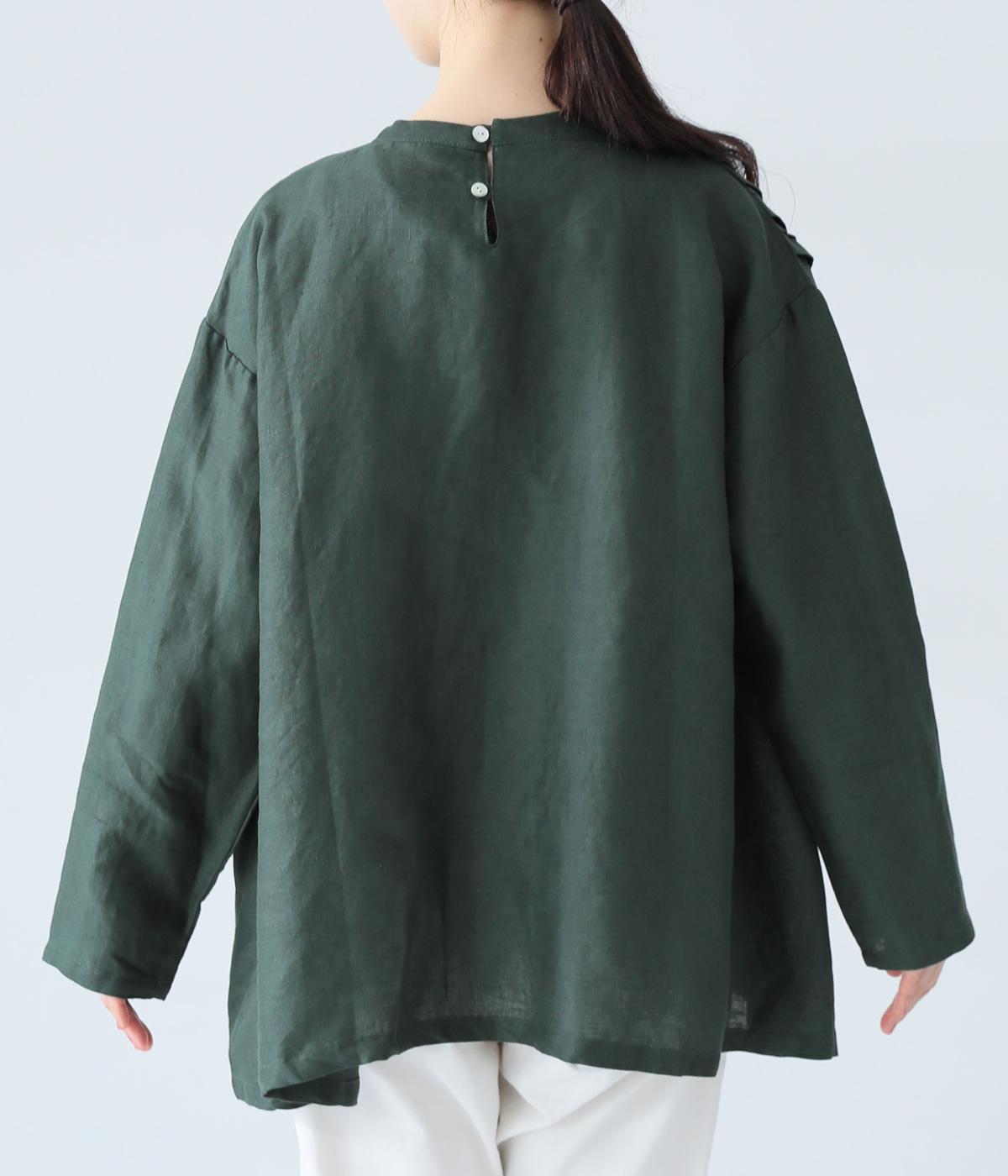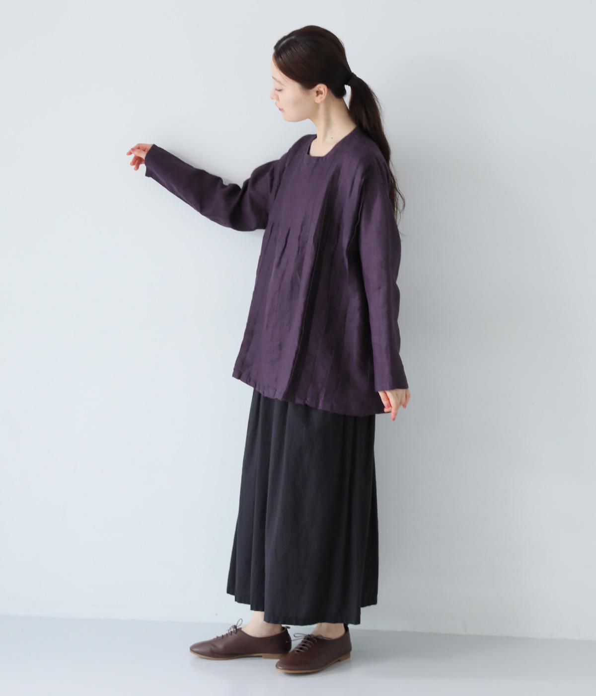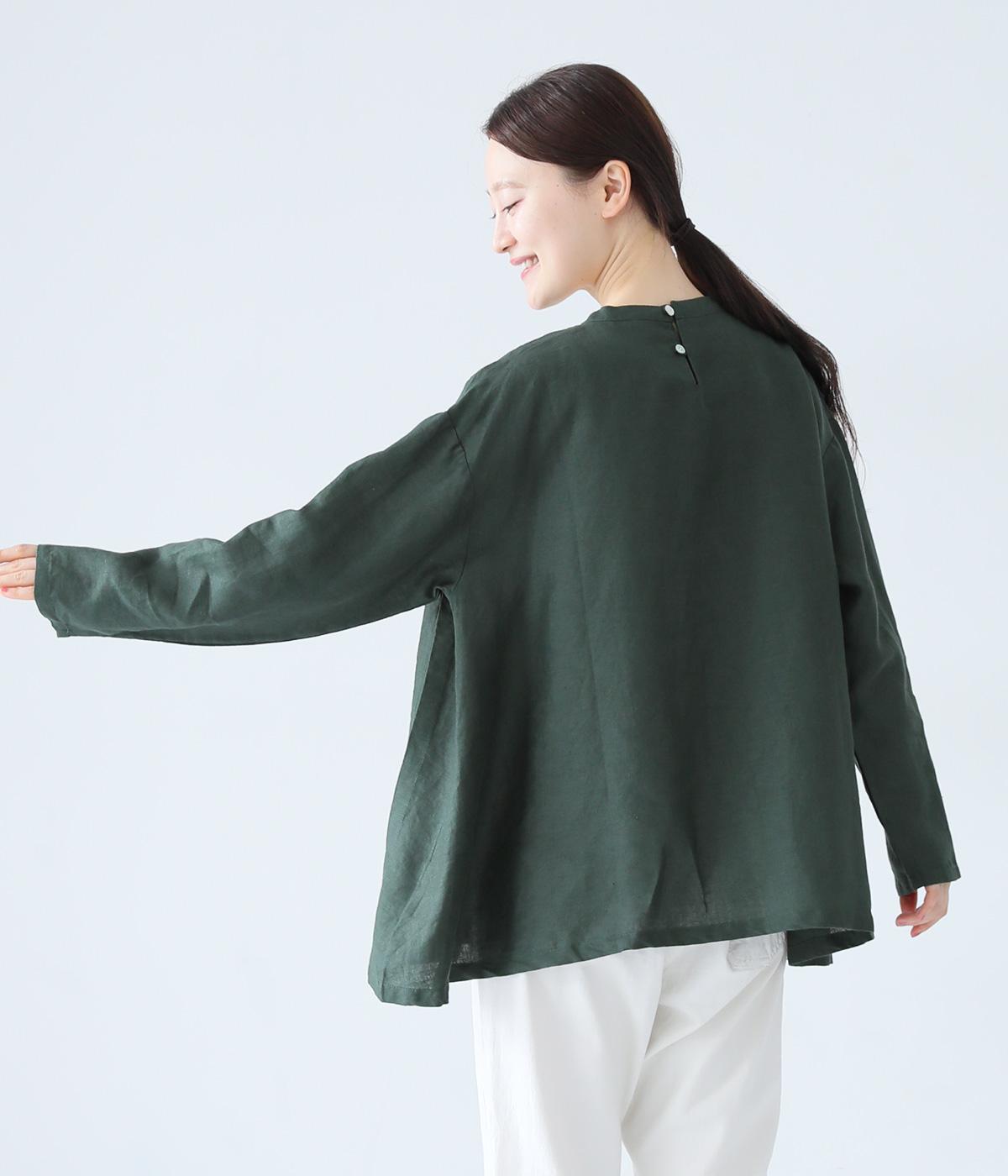 ナチュラルな佇まいのリネンブラウスに、巾違いのピンタックデザインで華やかさをプラス。風が通り抜けるようなふんわりシルエットも、縦ラインを強調するピンタックですっきりと見せています。着脱をアシストする、後ろネックのボタンもポイントです。