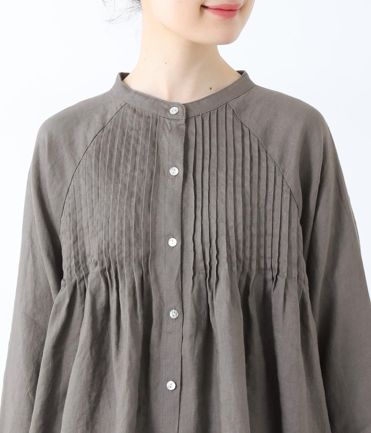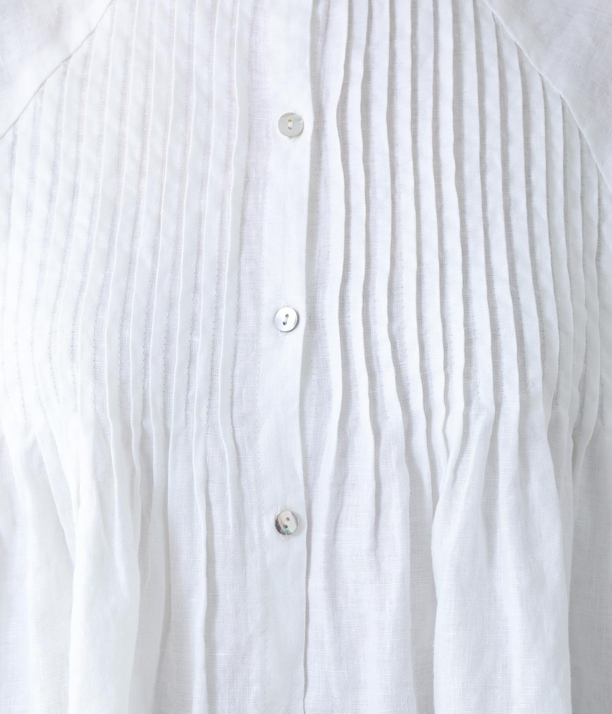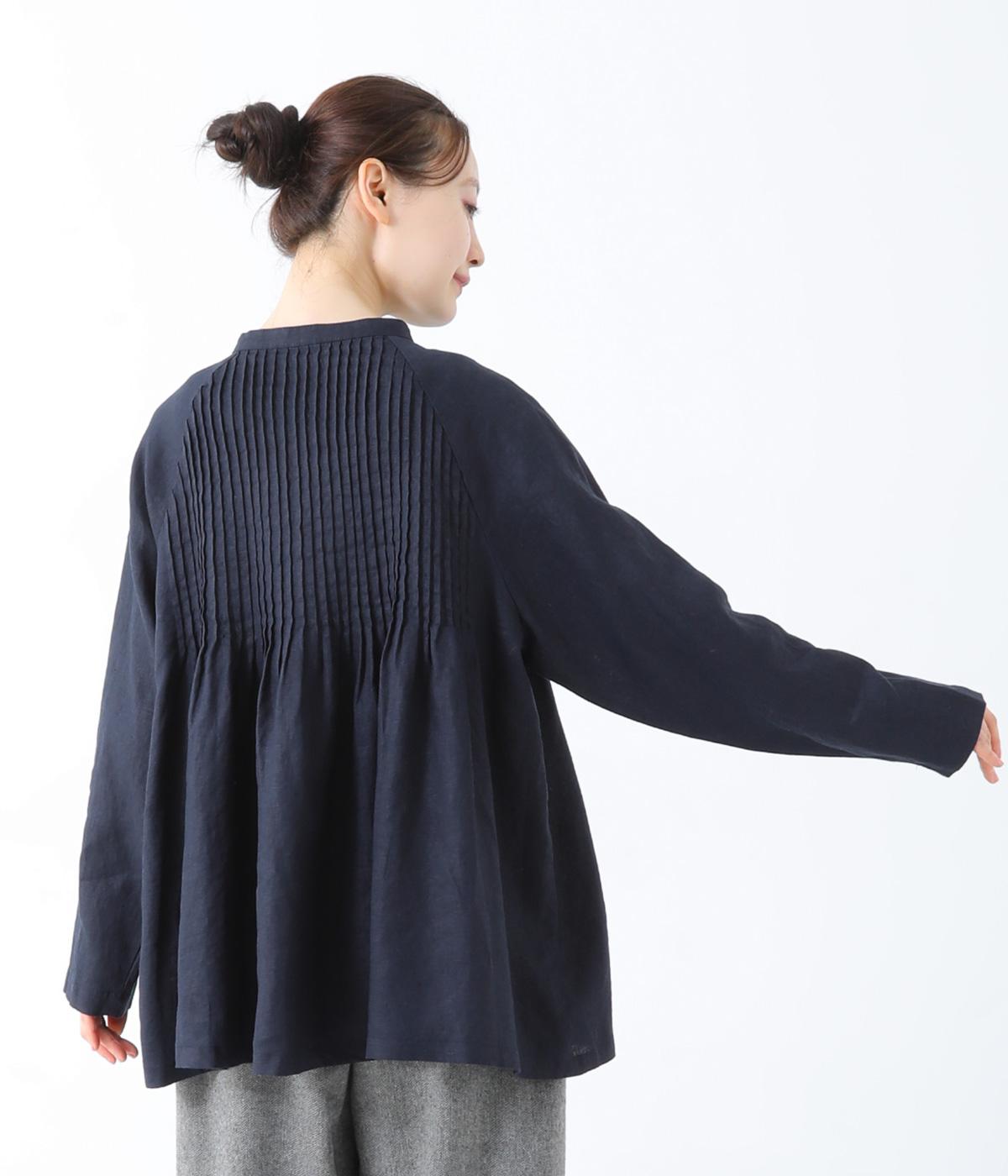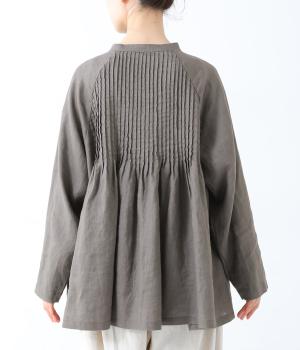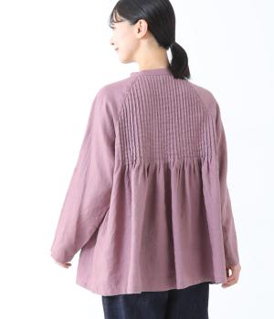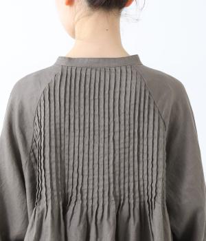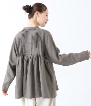 前後ヨークに贅沢にほどこしたピンタックがポイント。そこから広がるドレープと、フレアなシルエットが女性らしい華やかさを加速させます。長めの着丈が気になるお尻まわりをカバー。肩幅をすっきりと見せるラグランスリーブもポイントです。
