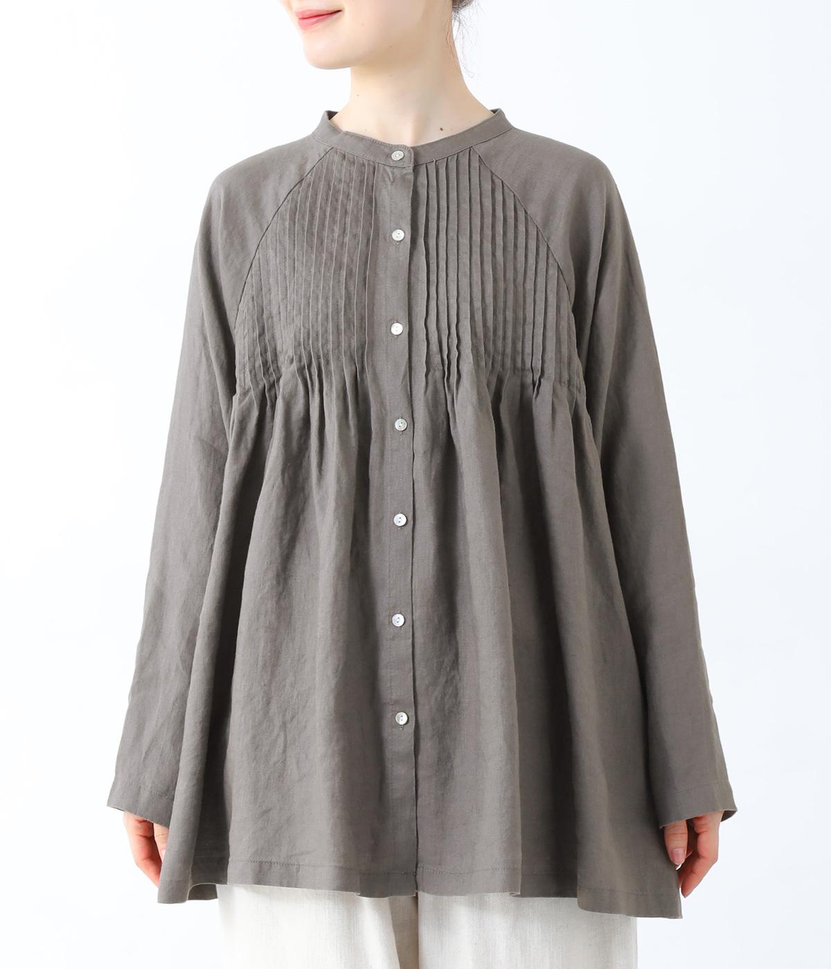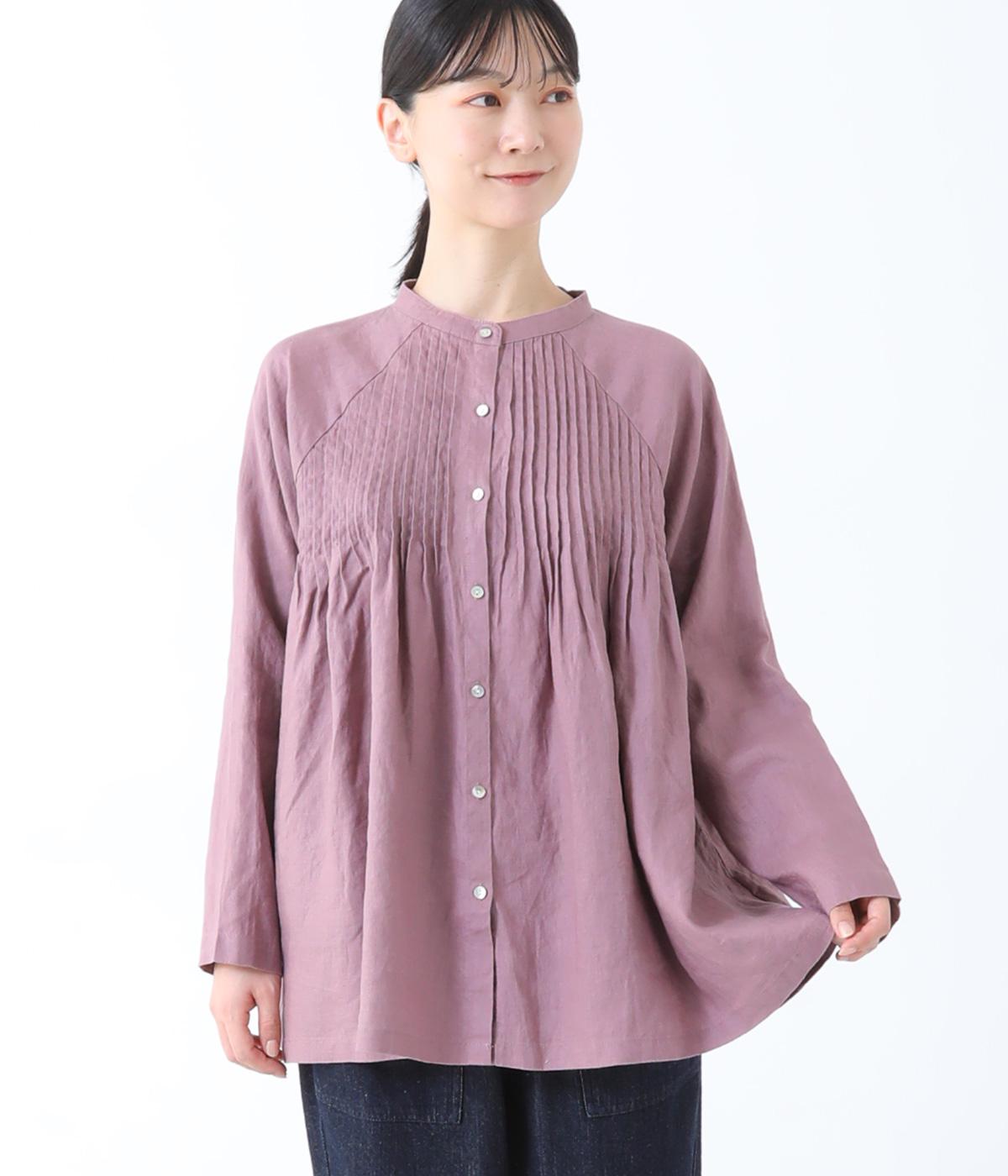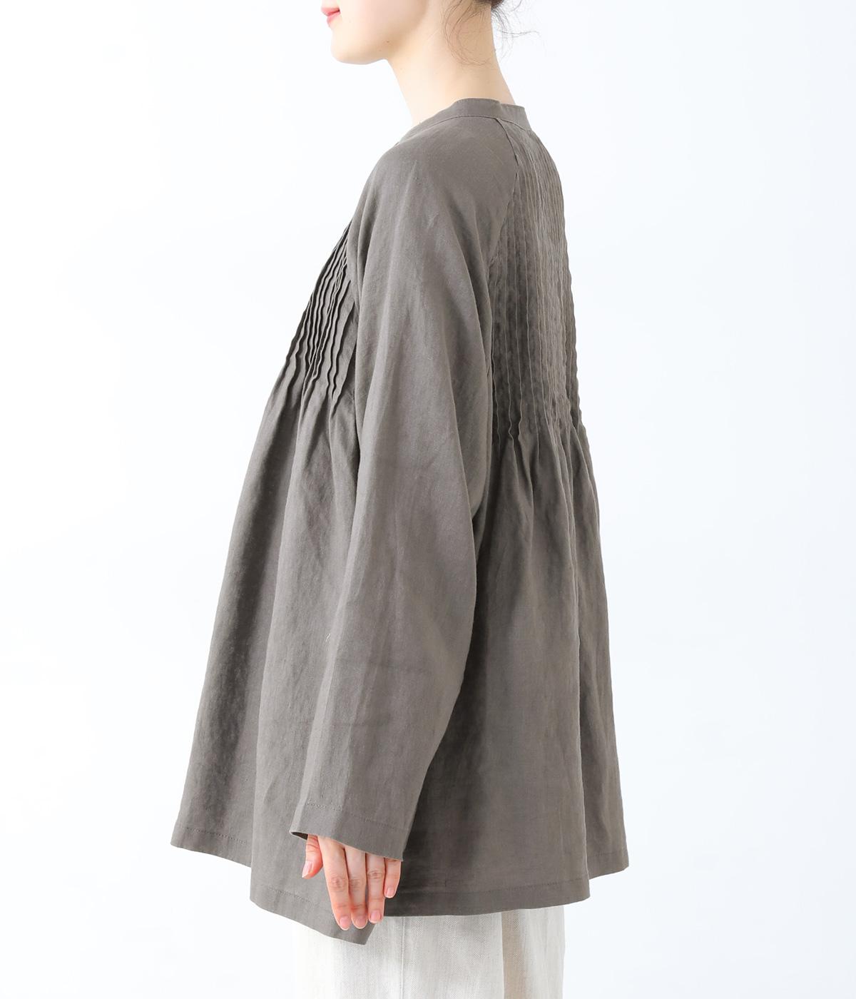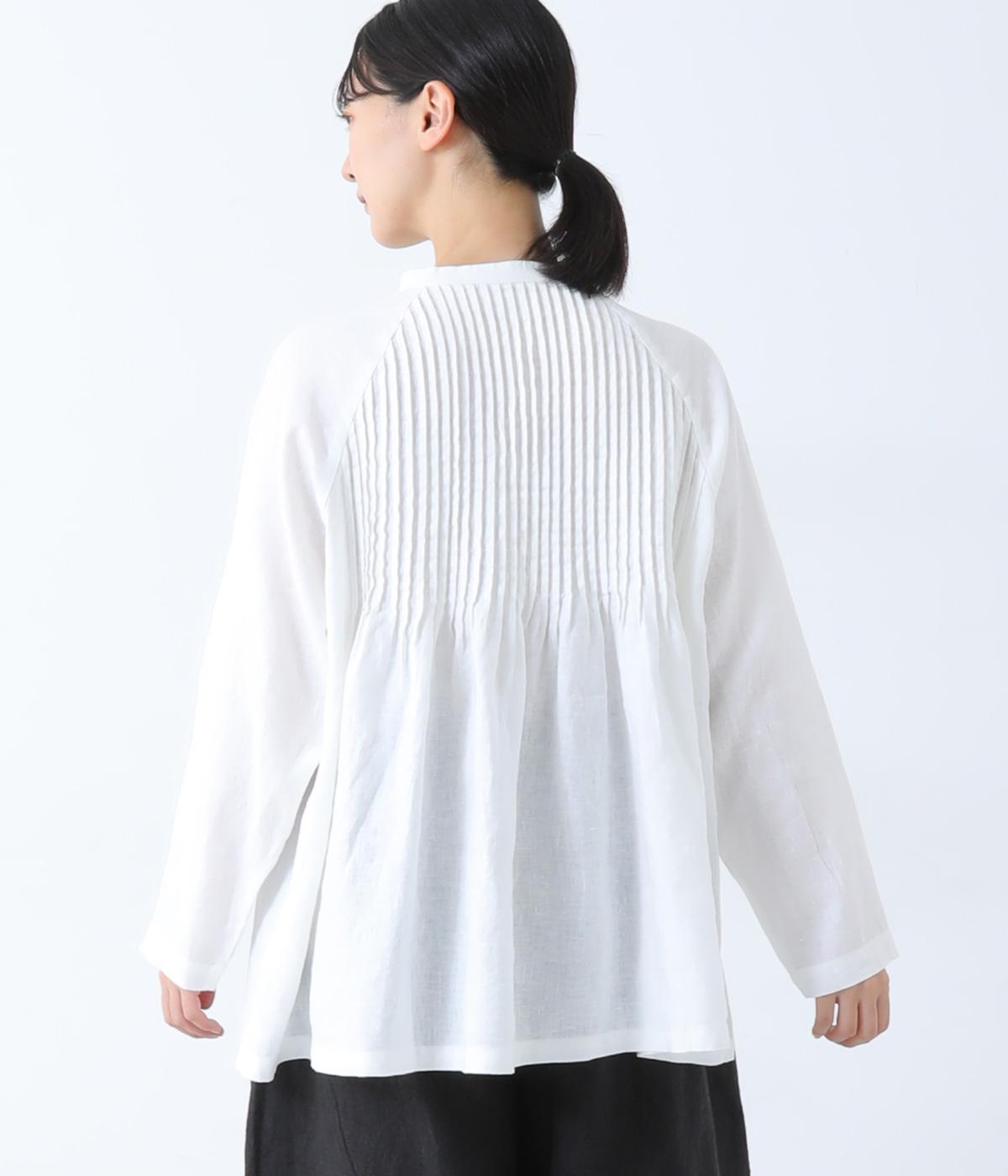 前後ヨークに贅沢にほどこしたピンタックがポイント。そこから広がるドレープと、フレアなシルエットが女性らしい華やかさを加速させます。長めの着丈が気になるお尻まわりをカバー。肩幅をすっきりと見せるラグランスリーブもポイントです。