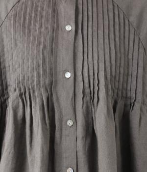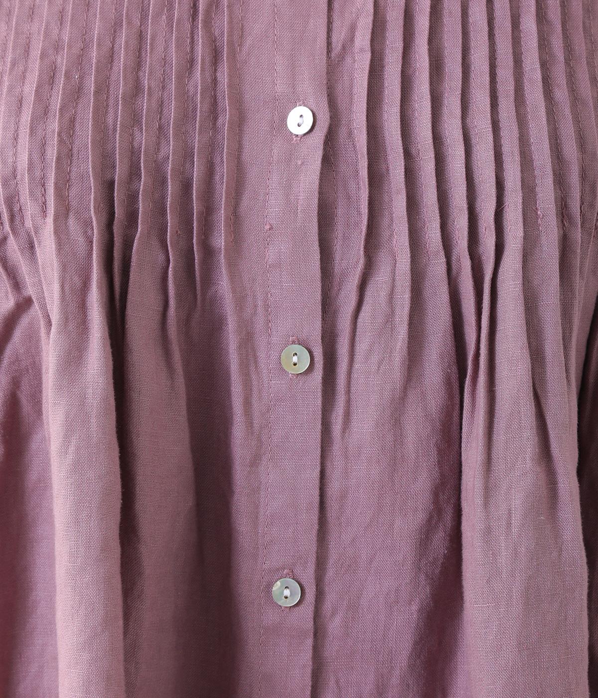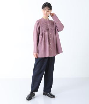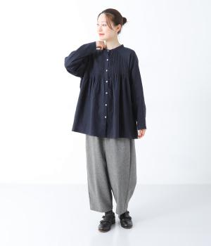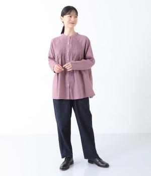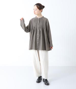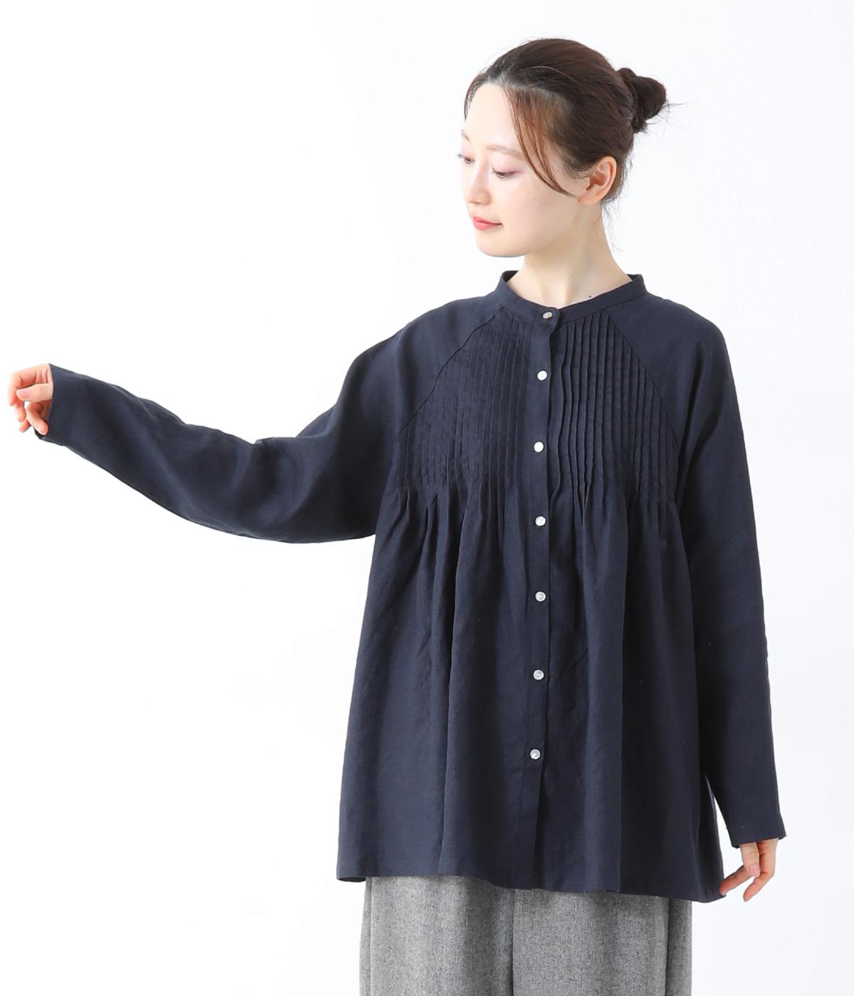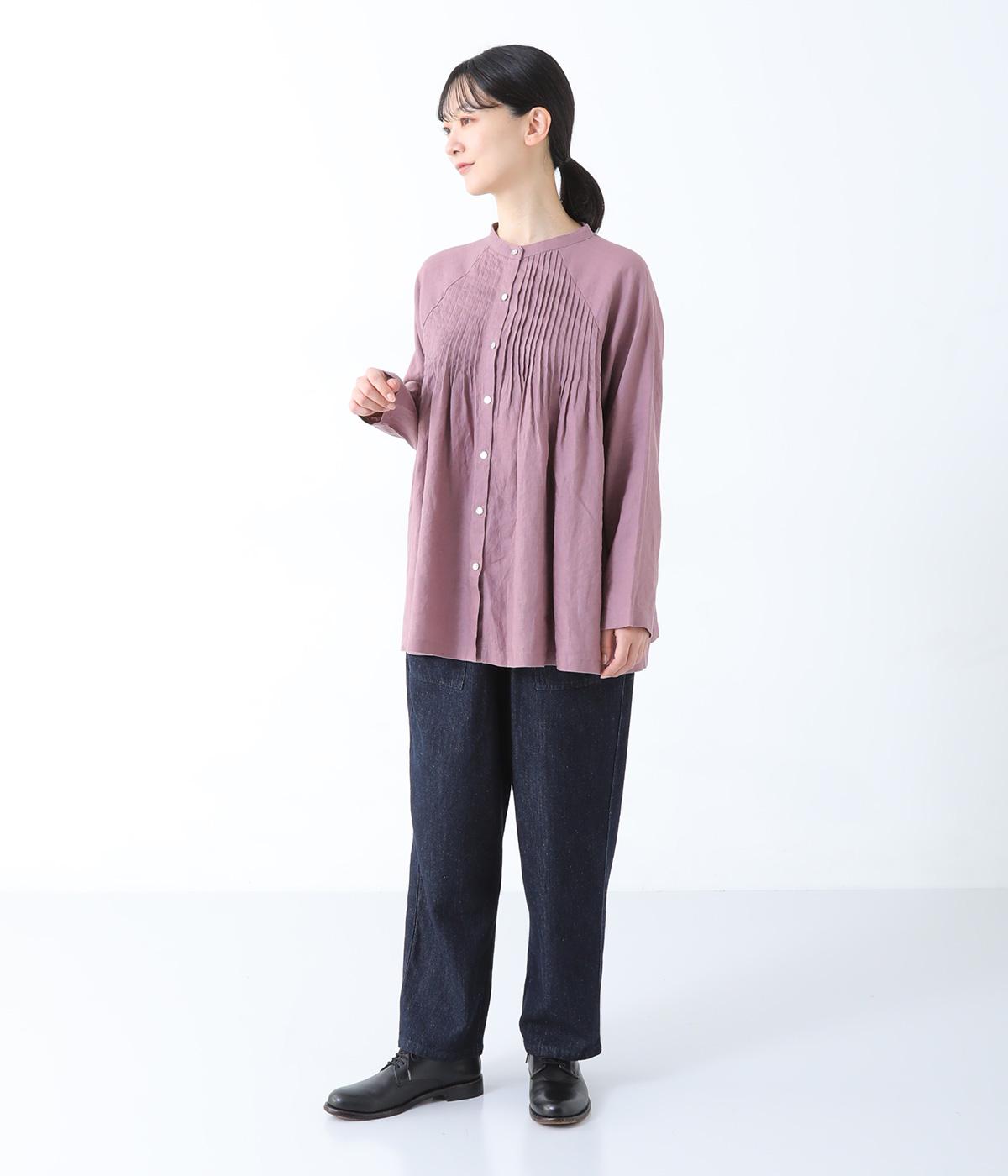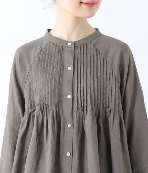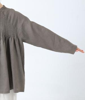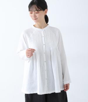 前後ヨークに贅沢にほどこしたピンタックがポイント。そこから広がるドレープと、フレアなシルエットが女性らしい華やかさを加速させます。長めの着丈が気になるお尻まわりをカバー。肩幅をすっきりと見せるラグランスリーブもポイントです。