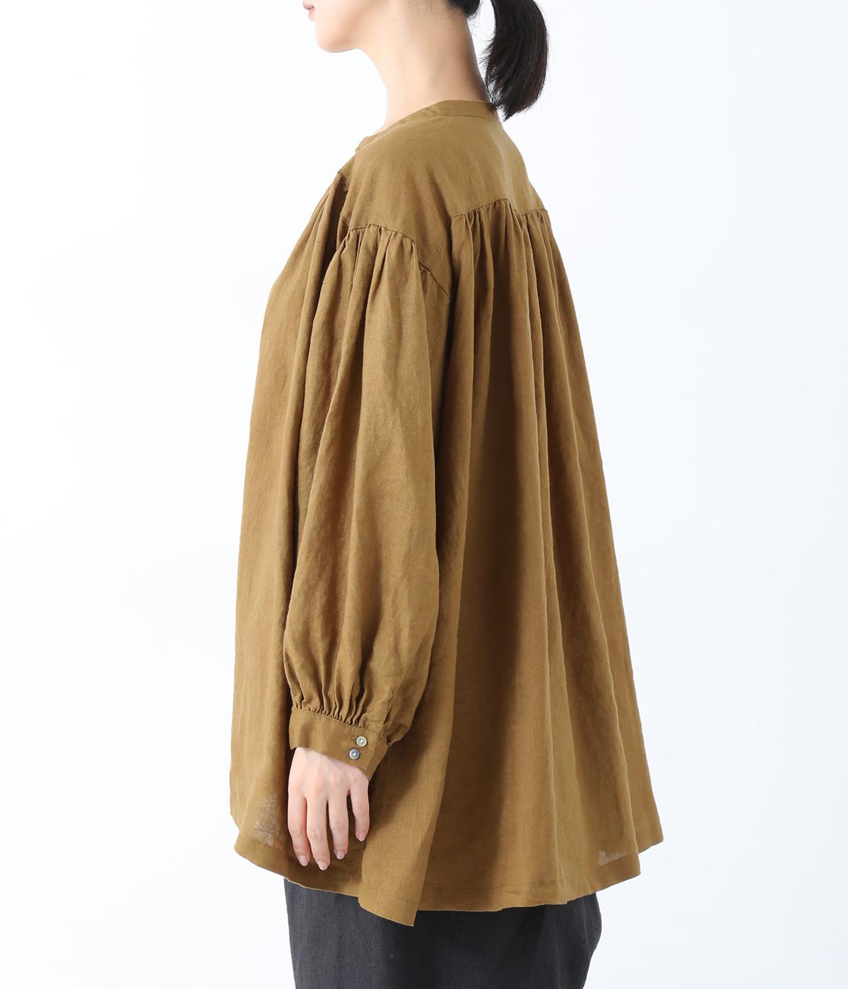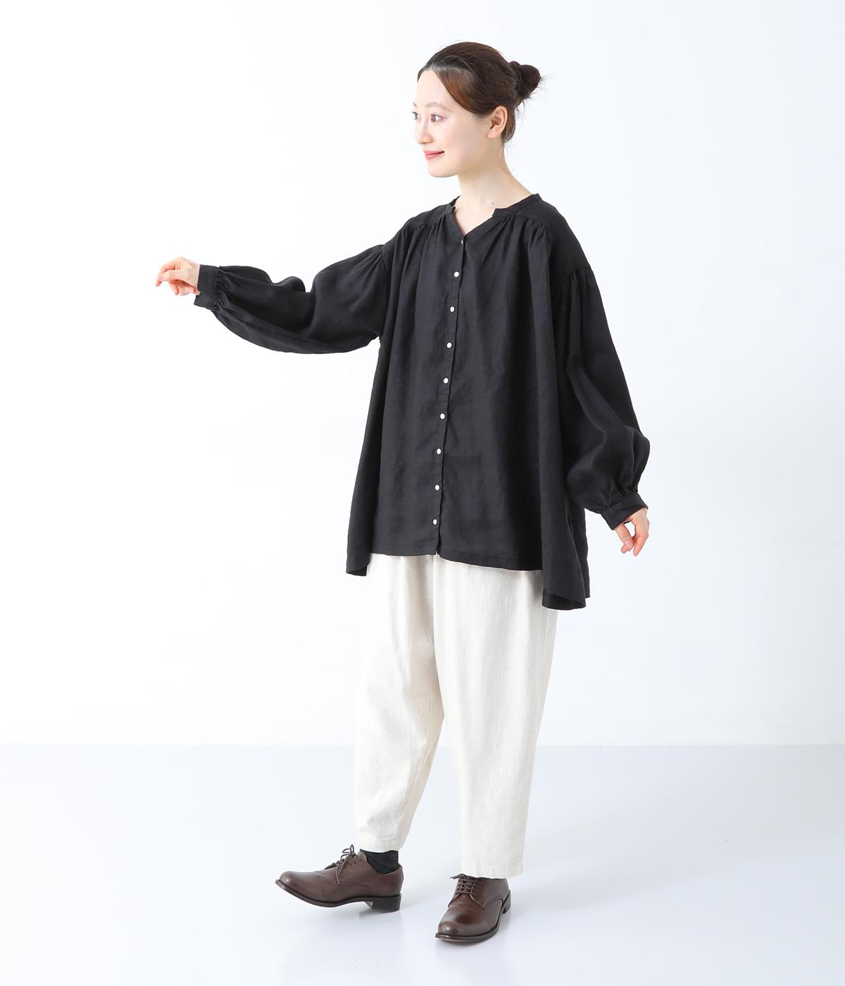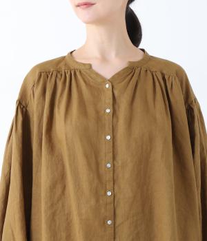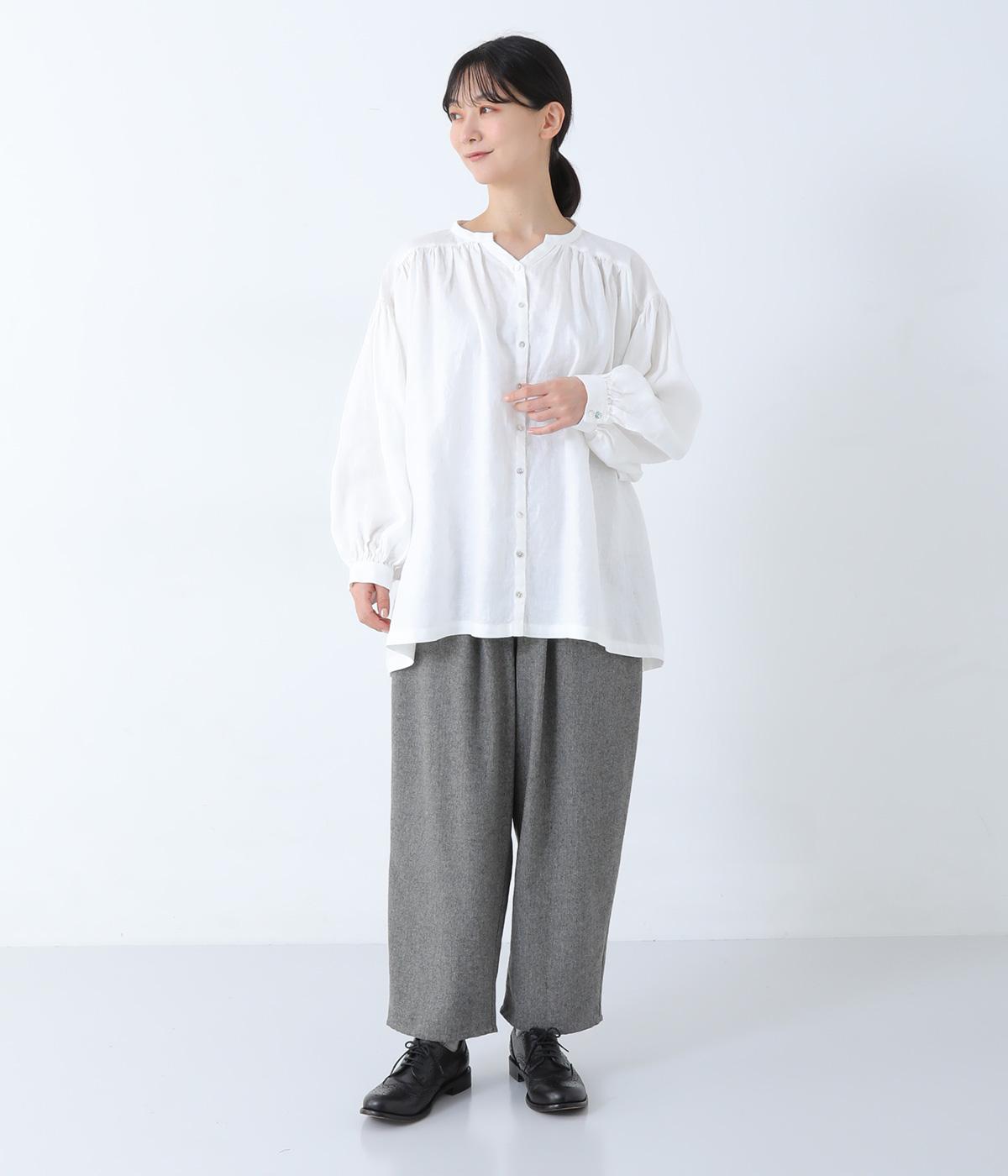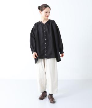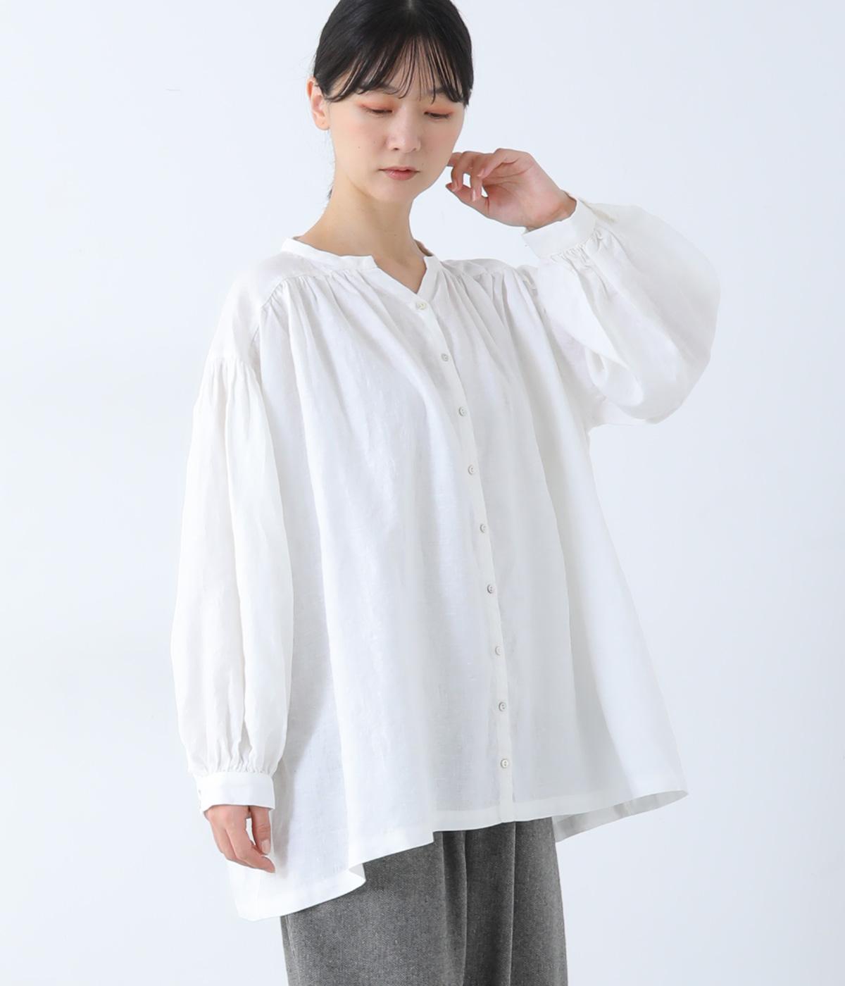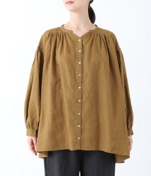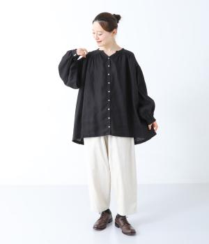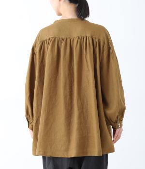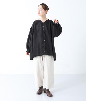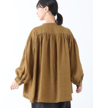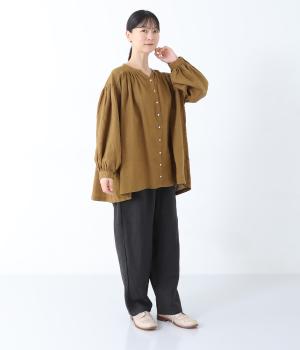 肩ラインと後ろヨーク下、袖にたっぷりと施したギャザーが、ふわりとした女性らしいシルエットをうむブラウス。首元のVネックがボリューミーなフォルムに抜け感を与えてくれます。ひらりと長い後ろ着丈がヒップまわりをカバー。一枚で着映えが叶い、着まわし力も備えたうれしいアイテムです。