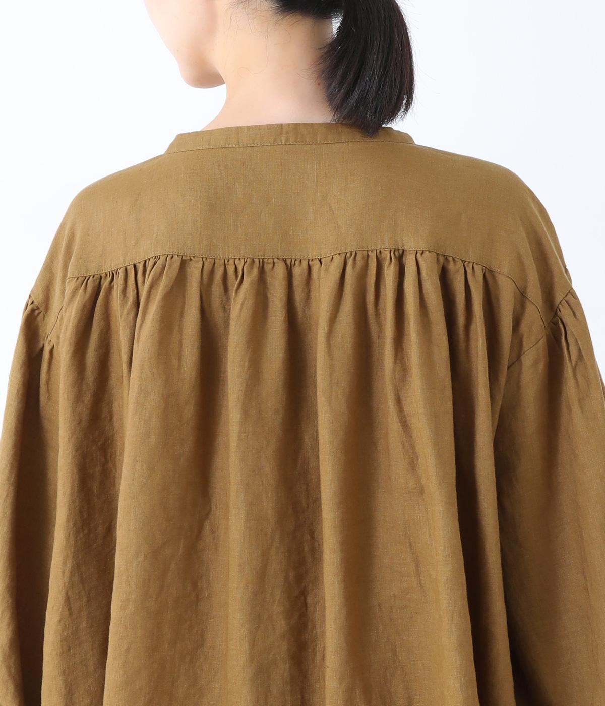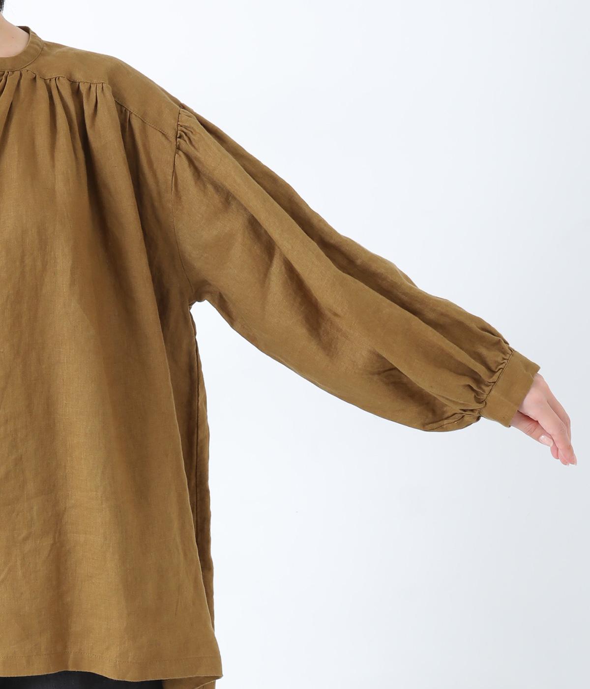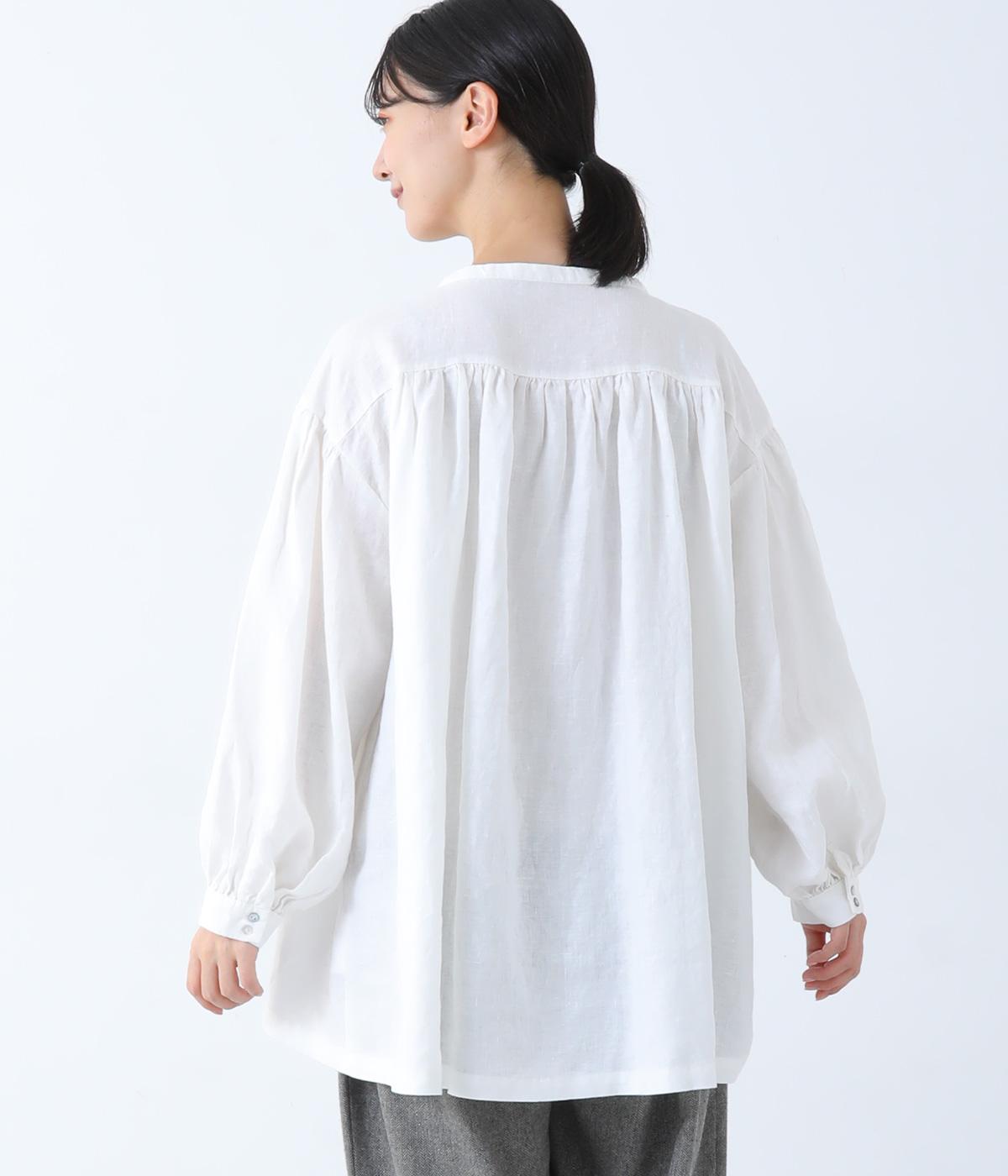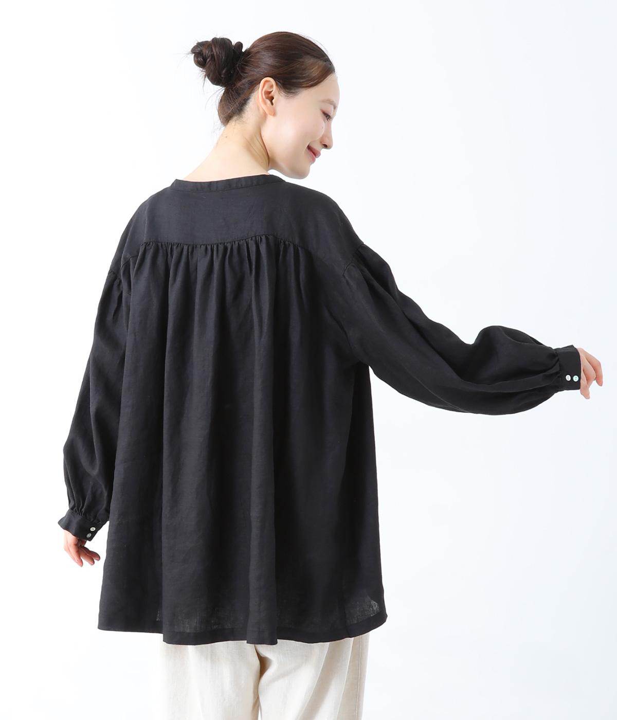 肩ラインと後ろヨーク下、袖にたっぷりと施したギャザーが、ふわりとした女性らしいシルエットをうむブラウス。首元のVネックがボリューミーなフォルムに抜け感を与えてくれます。ひらりと長い後ろ着丈がヒップまわりをカバー。一枚で着映えが叶い、着まわし力も備えたうれしいアイテムです。