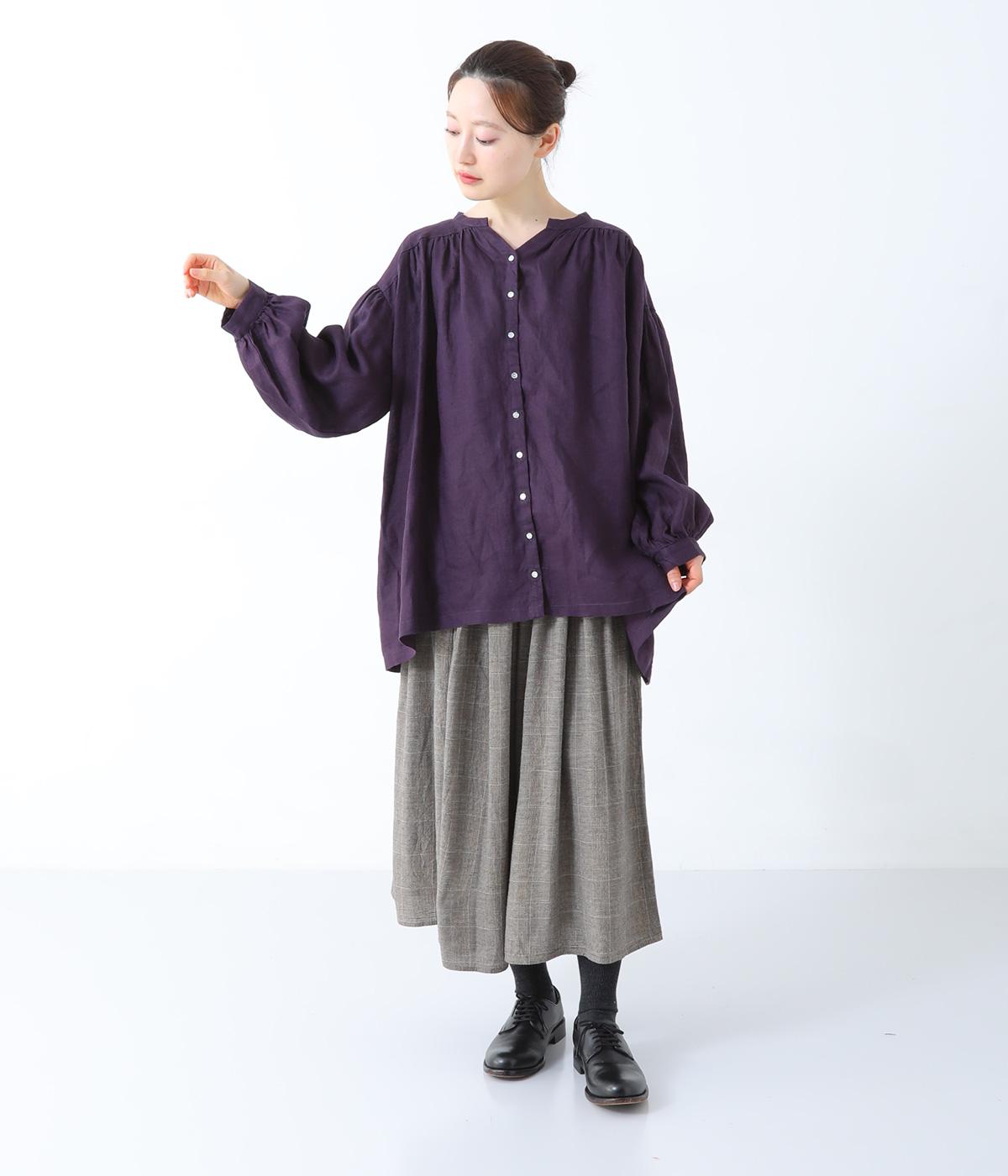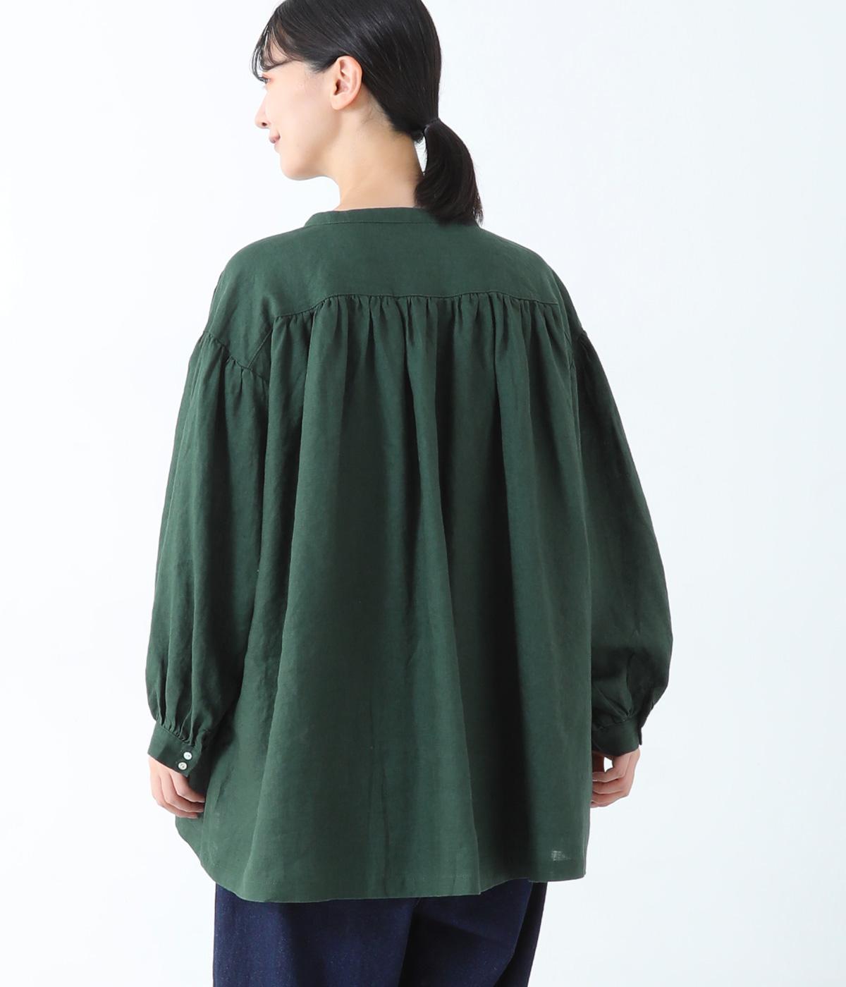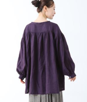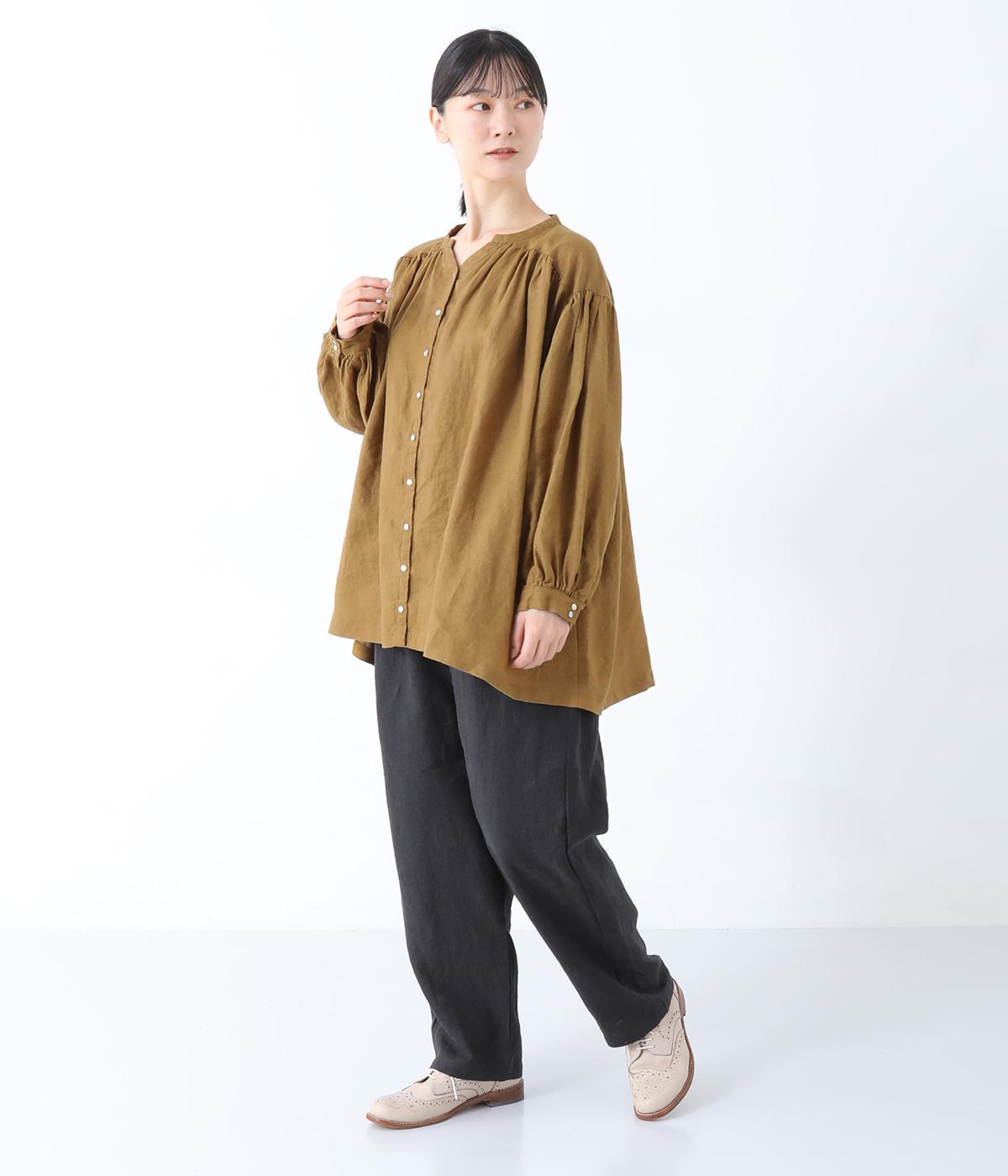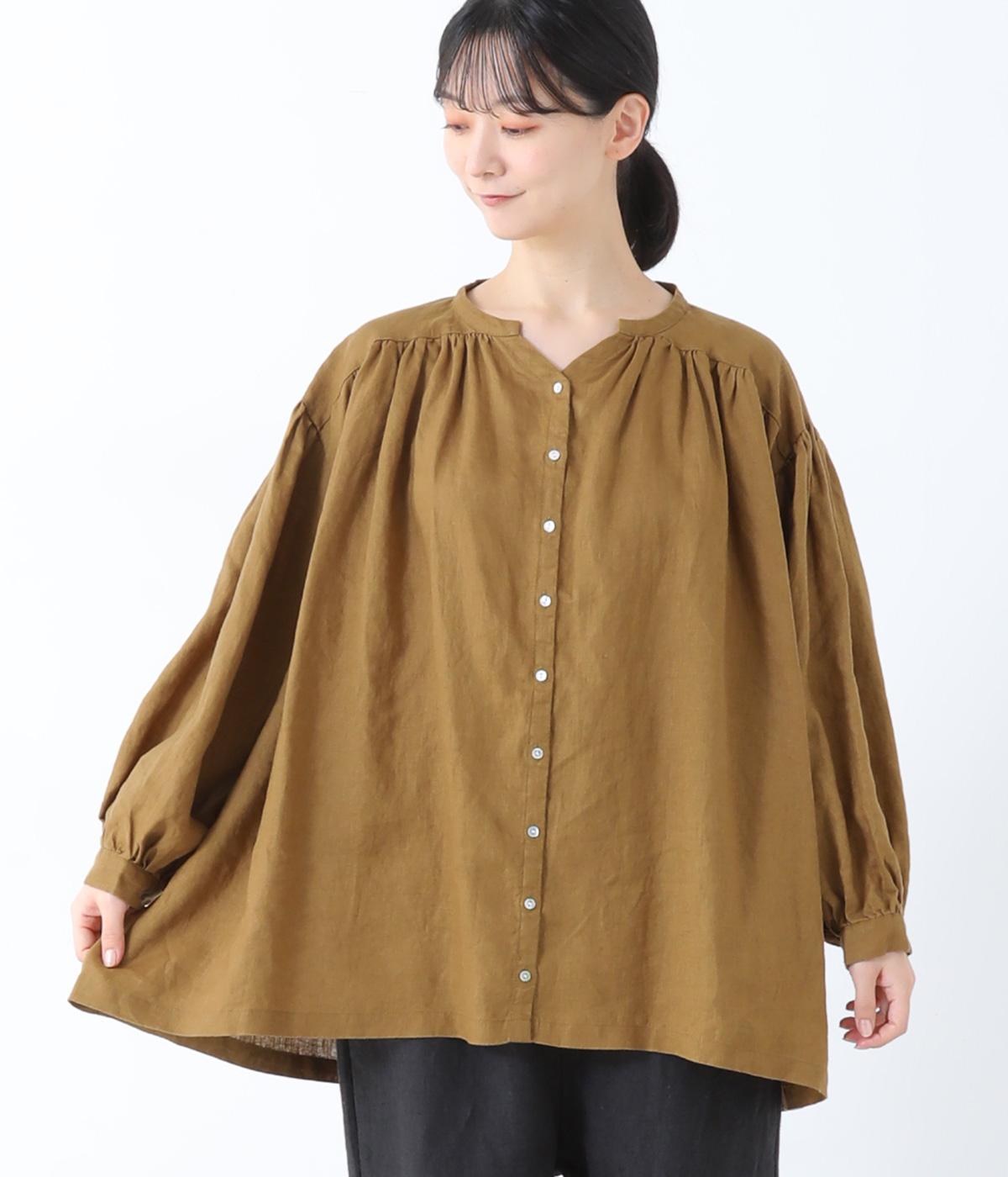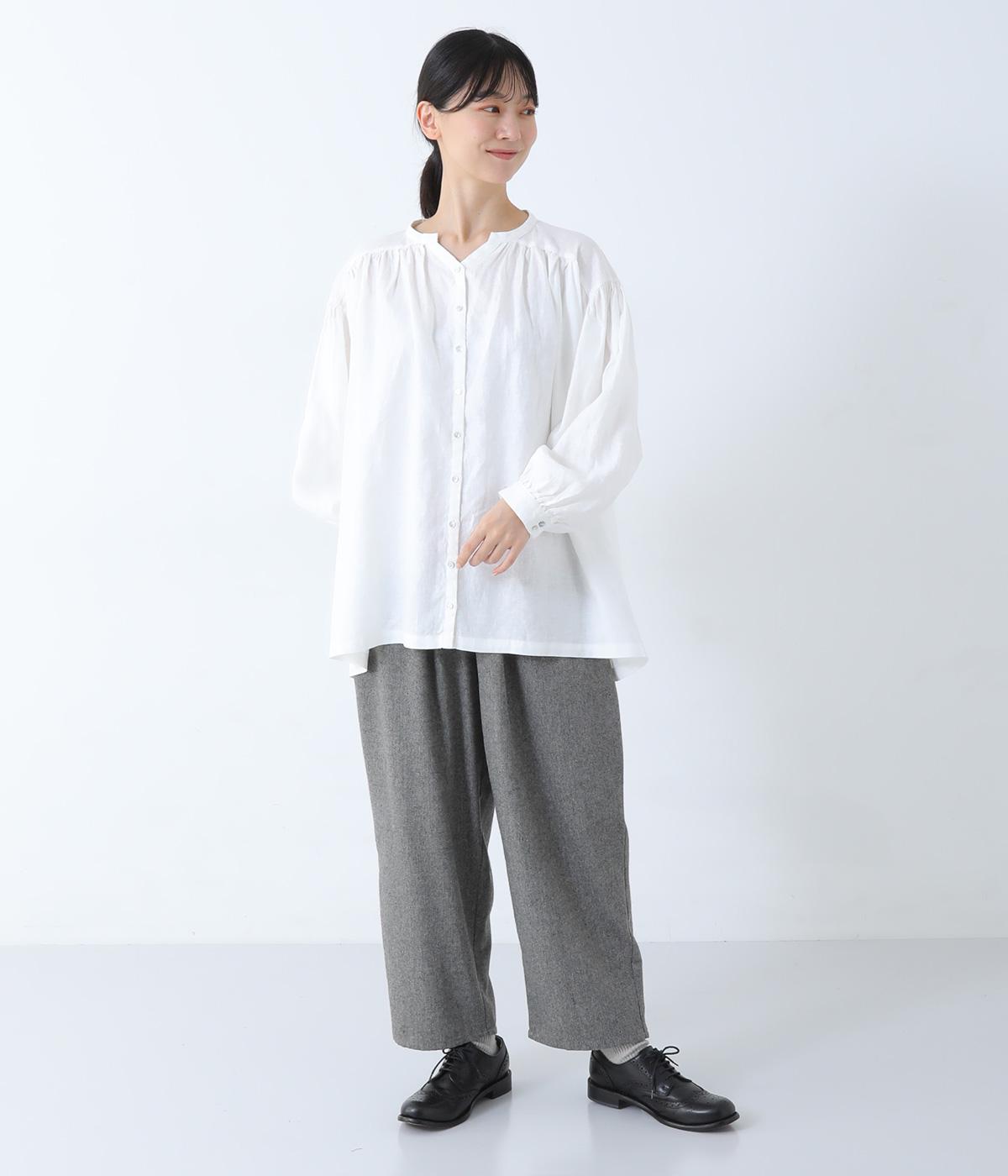 肩ラインと後ろヨーク下、袖にたっぷりと施したギャザーが、ふわりとした女性らしいシルエットをうむブラウス。首元のVネックがボリューミーなフォルムに抜け感を与えてくれます。ひらりと長い後ろ着丈がヒップまわりをカバー。一枚で着映えが叶い、着まわし力も備えたうれしいアイテムです。