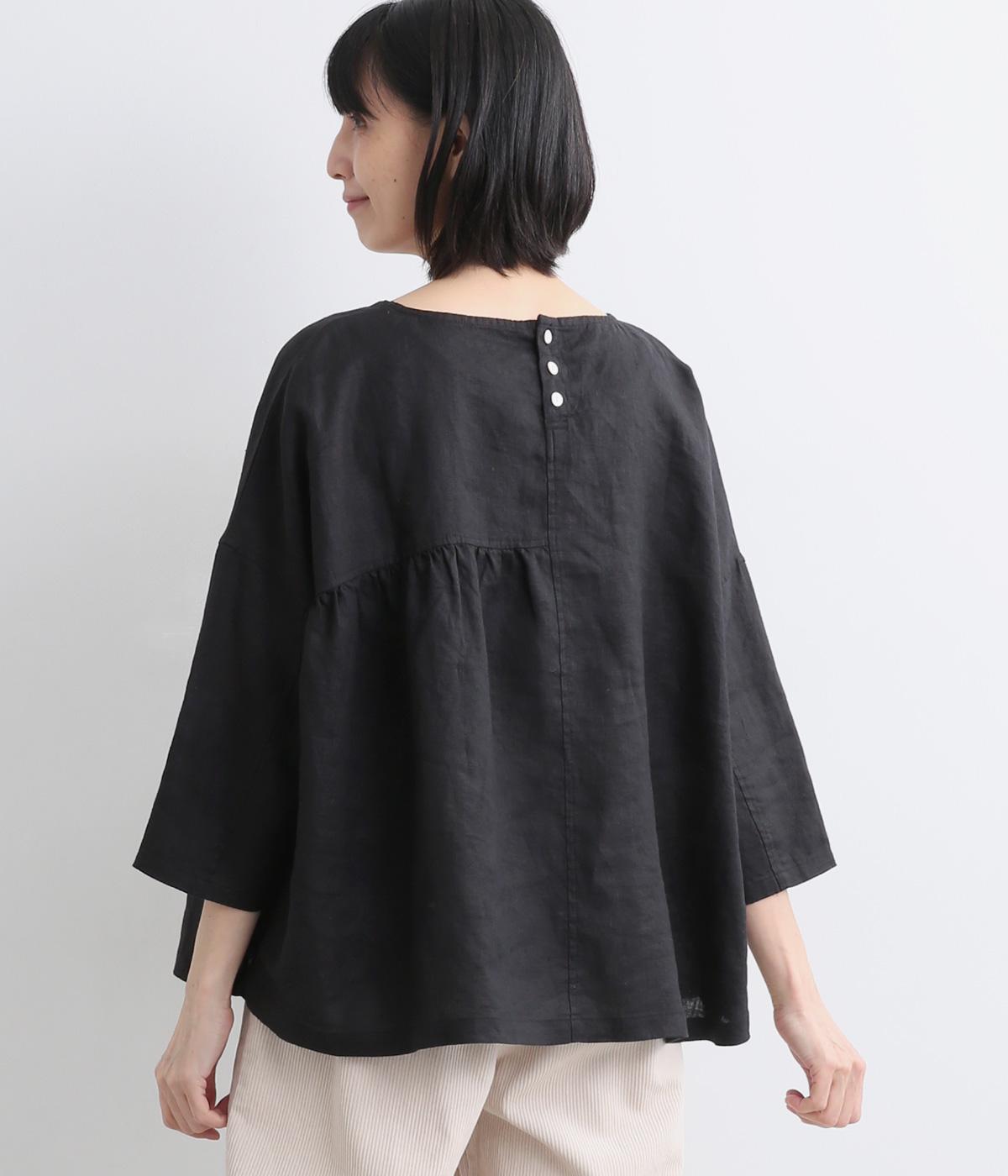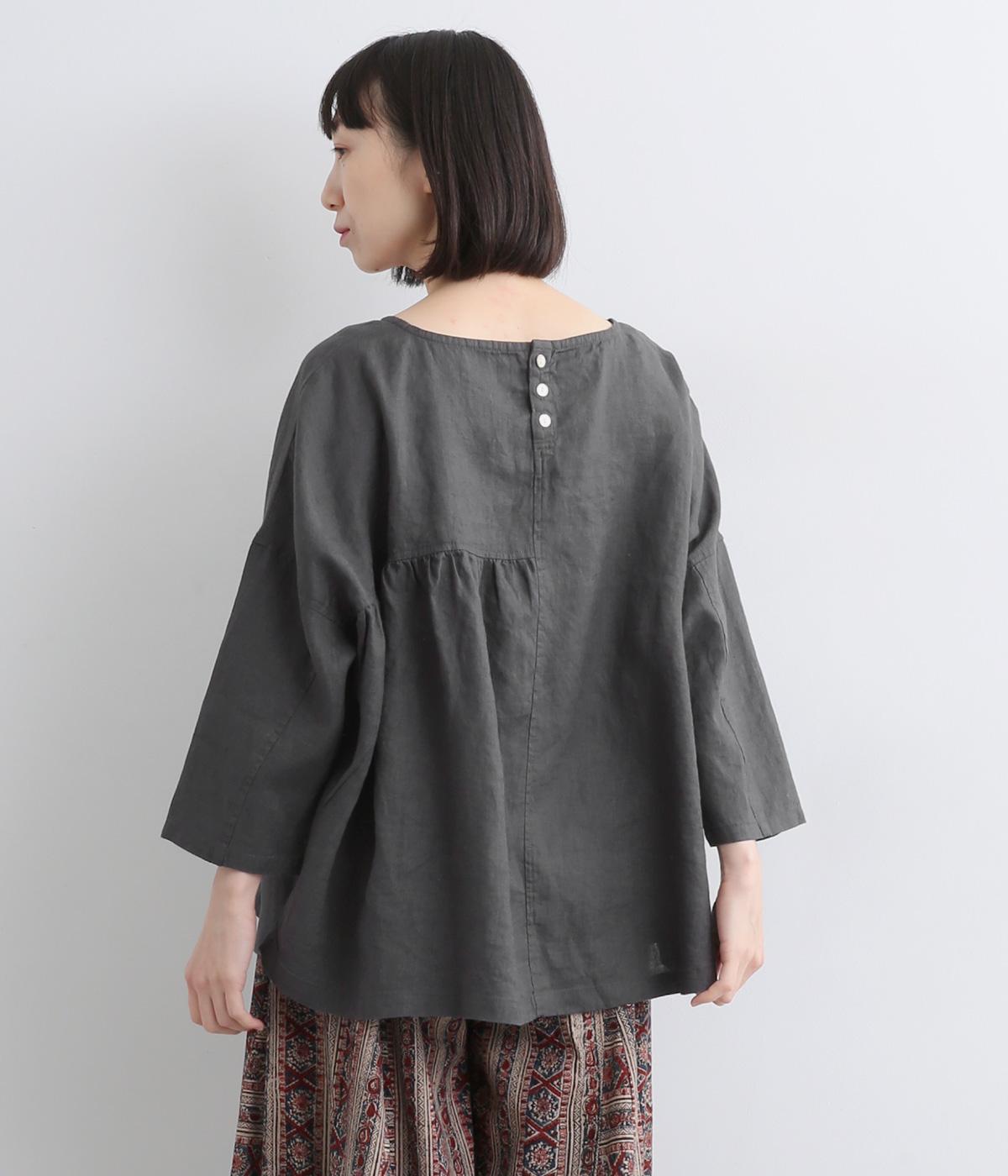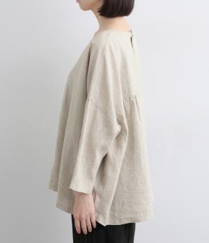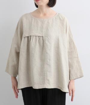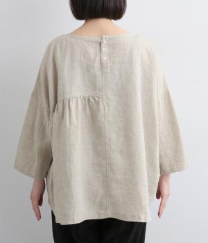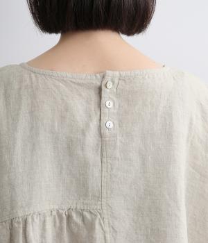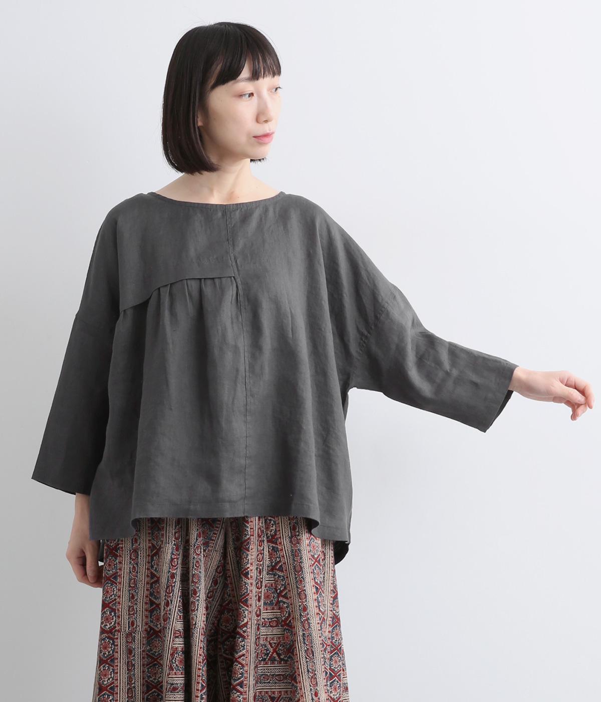 アシンメトリーな切り替えタックとギャザーが印象的な装いをつくるプルオーバーです。体のラインを拾いにくい、リラクシーなワイドシルエットで着心地も快適。バックスタイルにアクセントを添える、シェル素材のボタン留め仕様です。