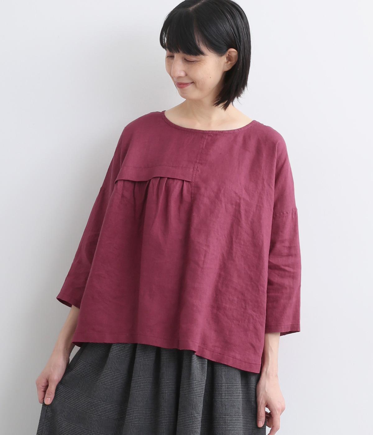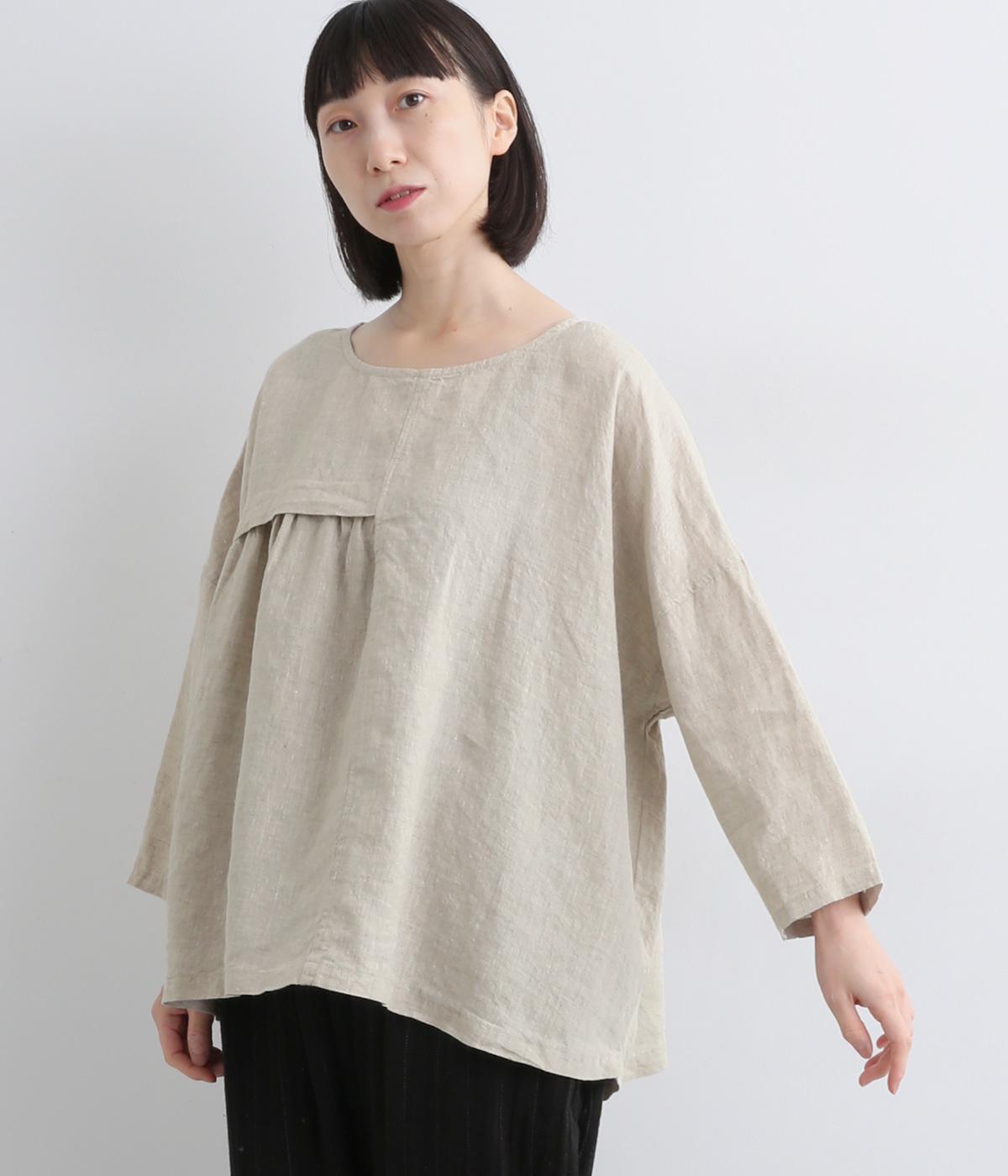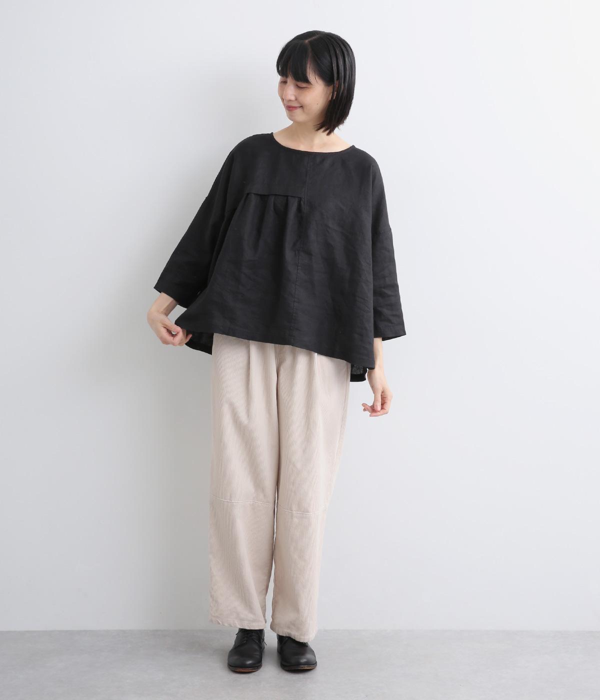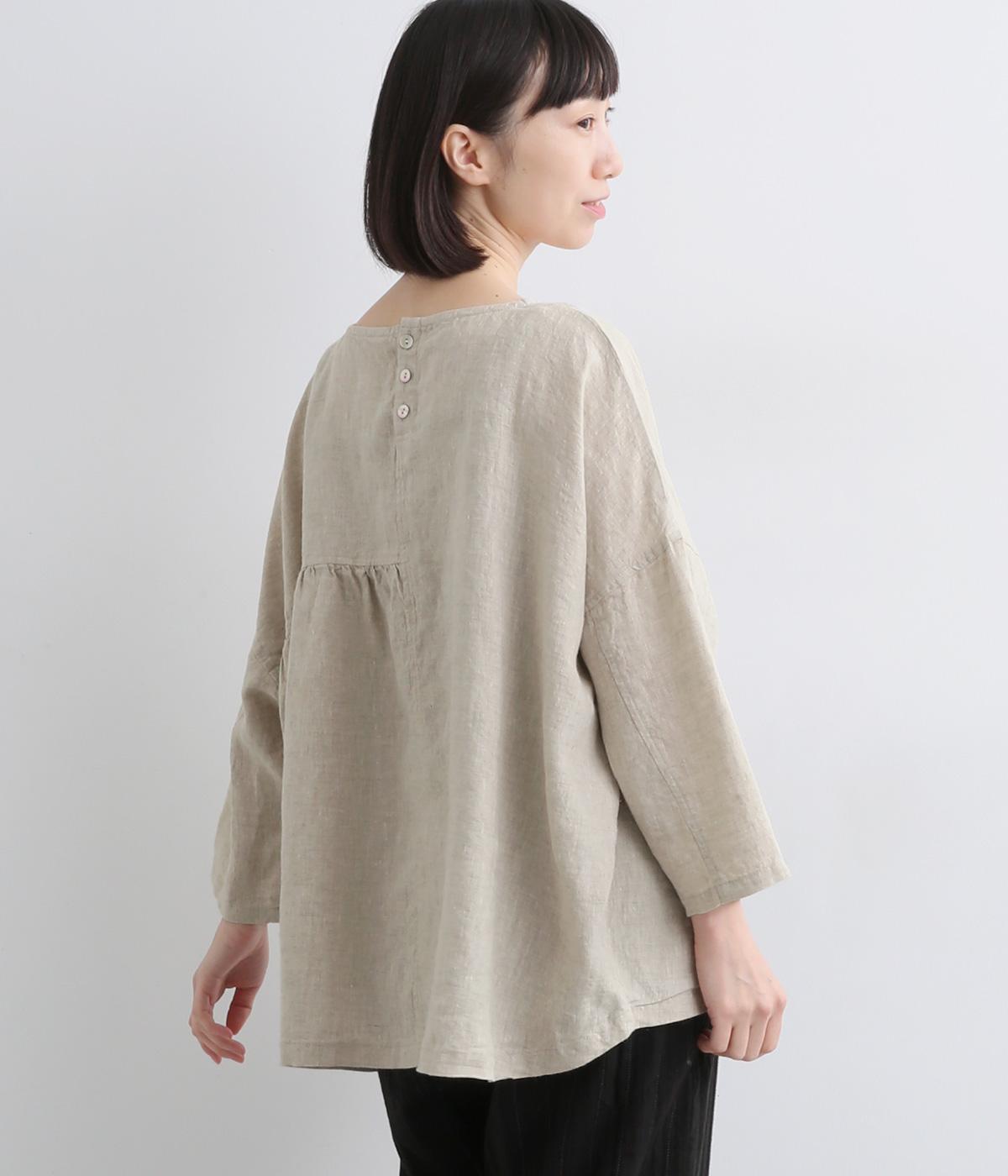 アシンメトリーな切り替えタックとギャザーが印象的な装いをつくるプルオーバーです。体のラインを拾いにくい、リラクシーなワイドシルエットで着心地も快適。バックスタイルにアクセントを添える、シェル素材のボタン留め仕様です。