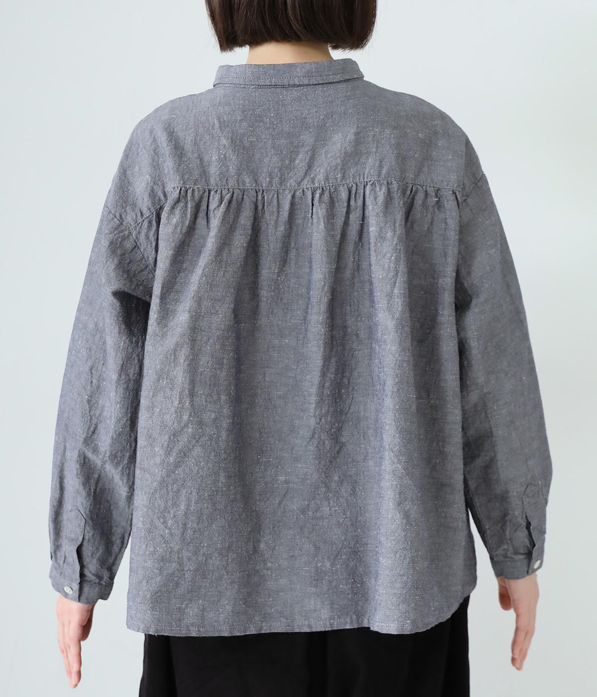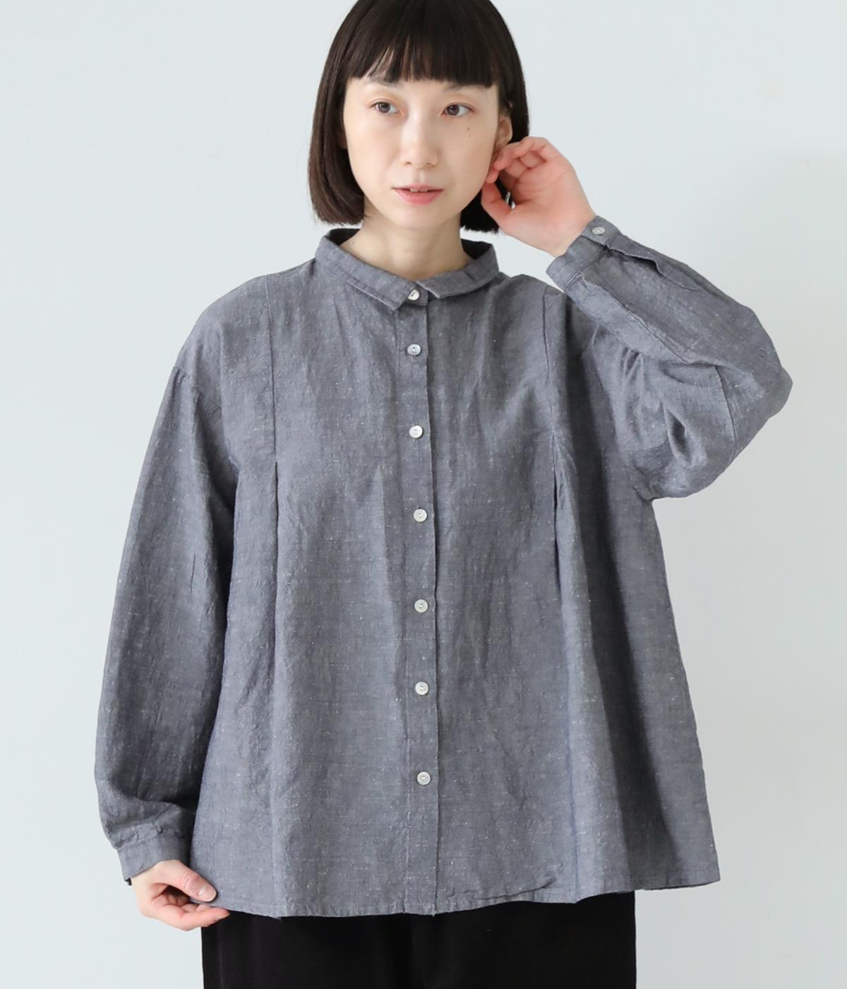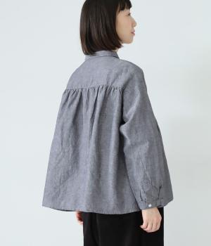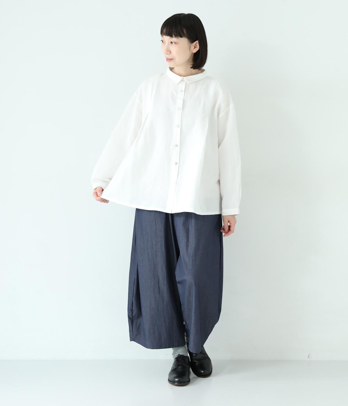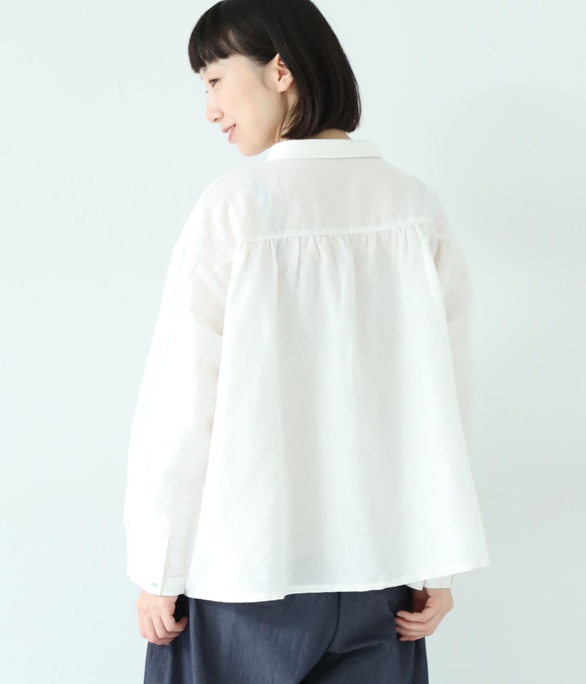 小さく控えめにデザインした襟が品のよさを漂わせるシャツ。前身頃にタックを、後ろには細かなギャザーをあしらって、ふんわりとした女性らしいシルエットに仕上げました。ややコンパクトな着丈ですっきりとしたバランスに。シンプルながらも細かなディテールにこだわりを感じる一着です。
