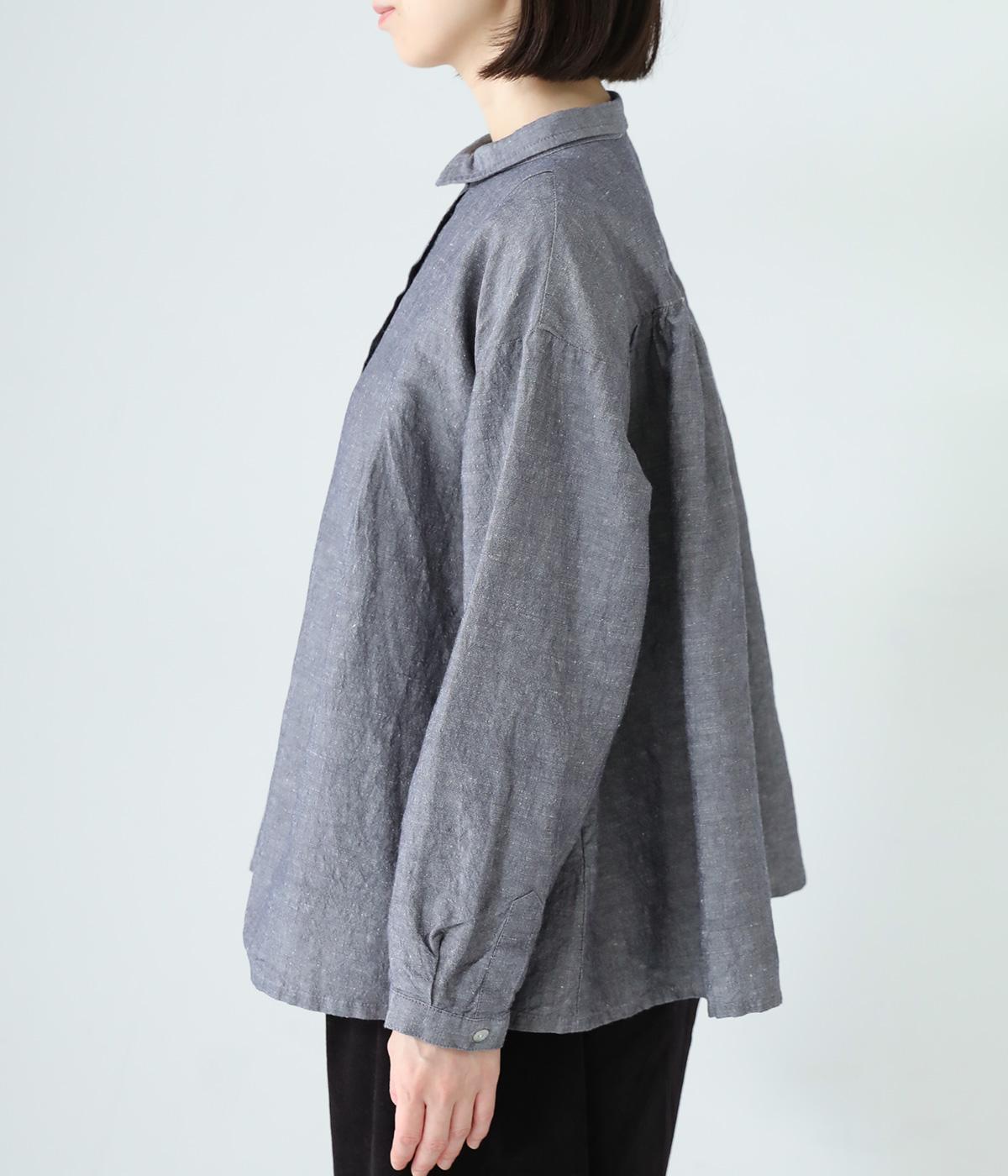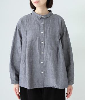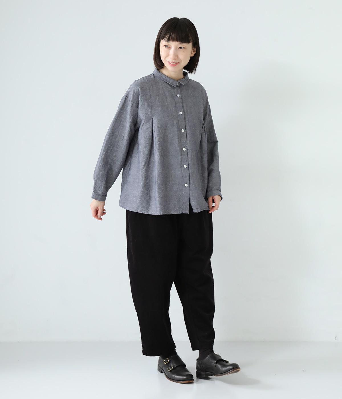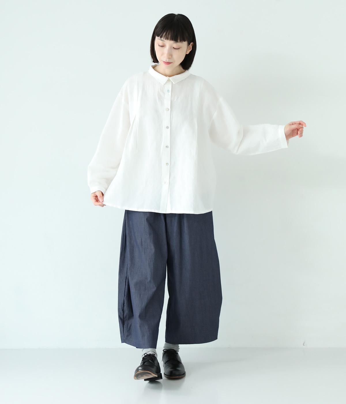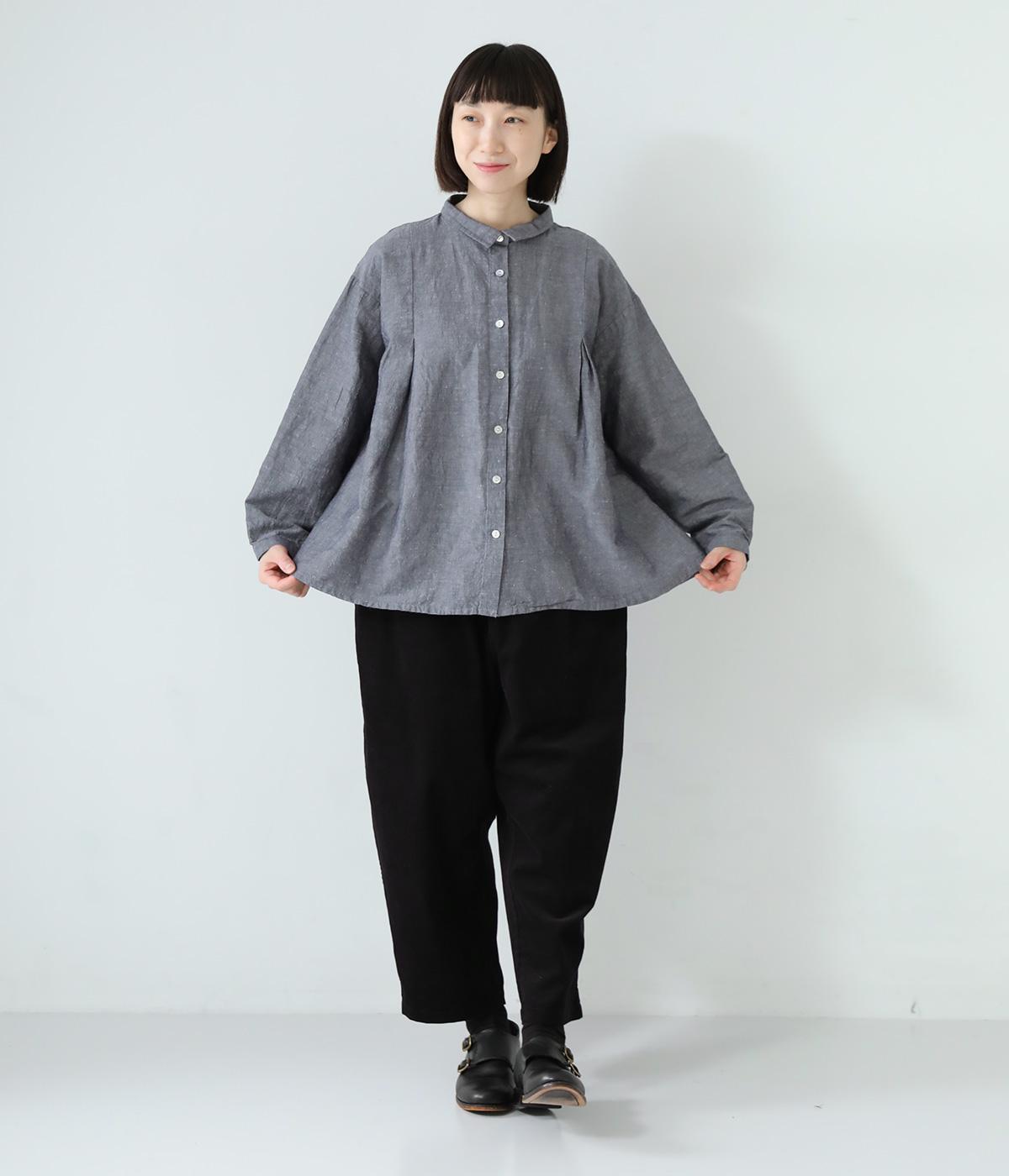 小さく控えめにデザインした襟が品のよさを漂わせるシャツ。前身頃にタックを、後ろには細かなギャザーをあしらって、ふんわりとした女性らしいシルエットに仕上げました。ややコンパクトな着丈ですっきりとしたバランスに。シンプルながらも細かなディテールにこだわりを感じる一着です。