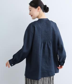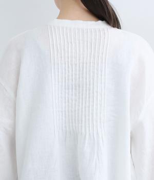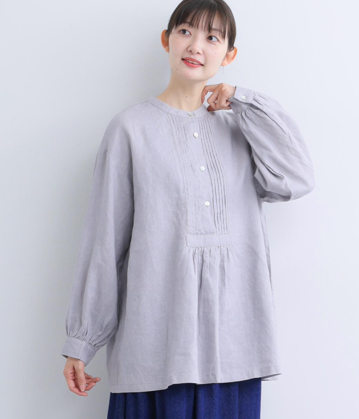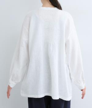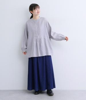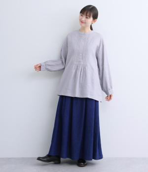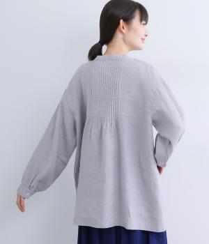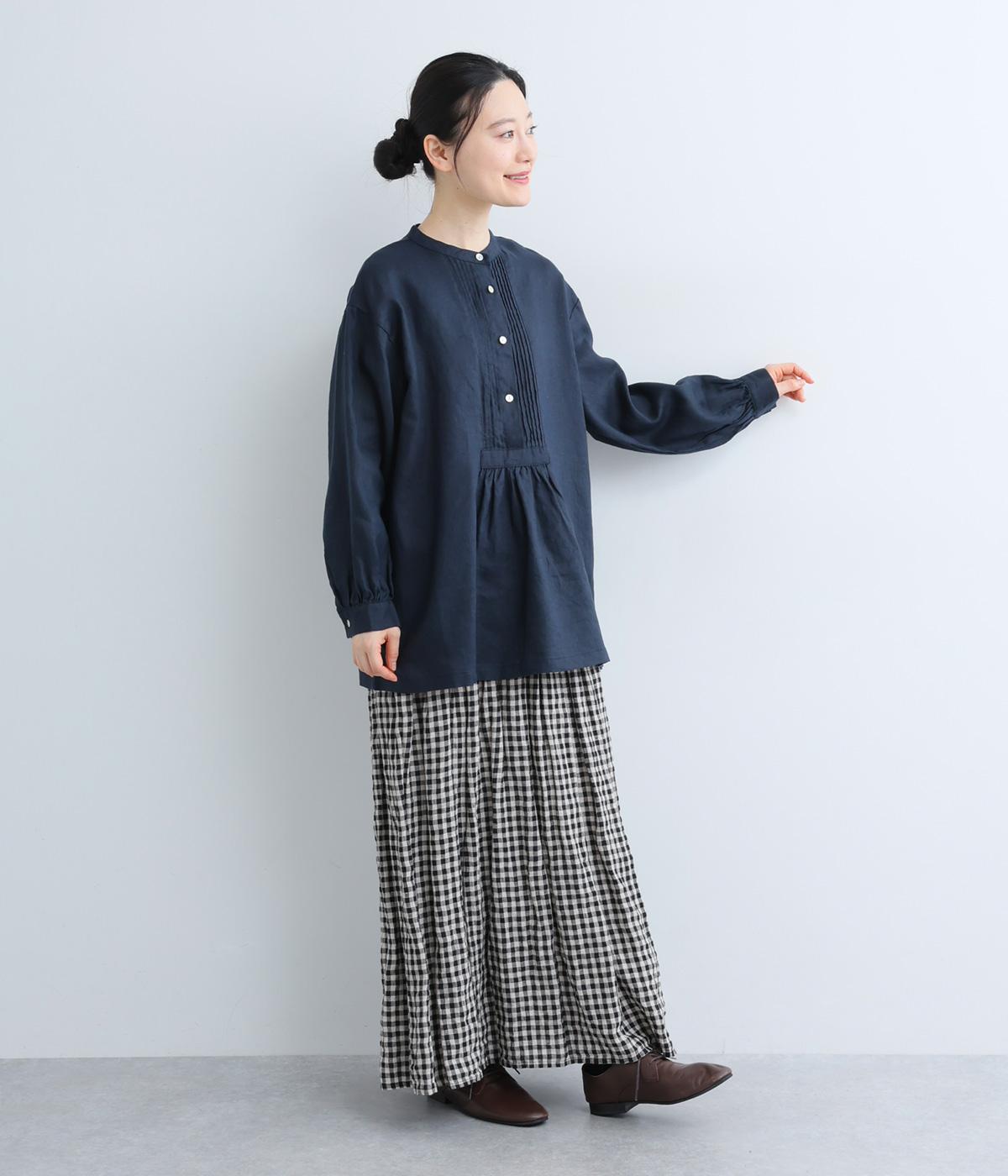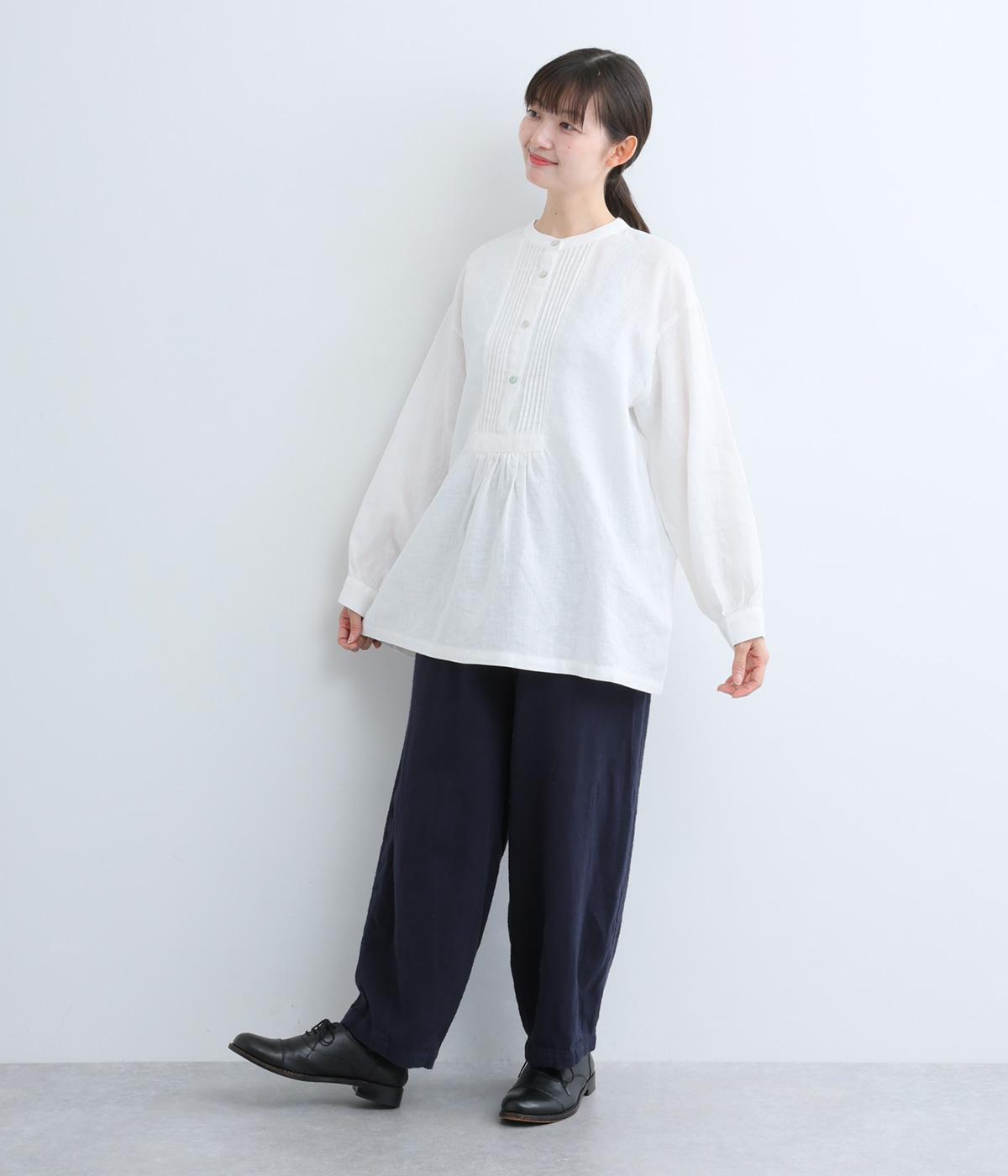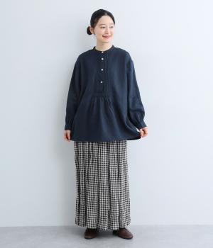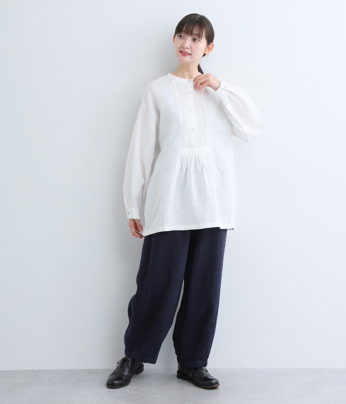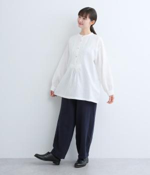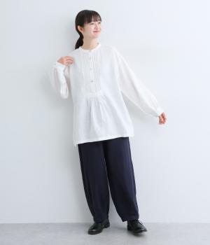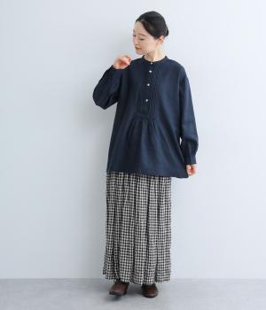 前後にきちんと感のあるピンタックをほどこしたブラウス。高めのウエスト位置からふわりと広がるシルエットが気になるお腹まわりをカバーしつつ、女性らしさをアップしてくれます。ヘンリーネックが視線を上に集め、装いがバランスよく仕上がるのも魅力です。