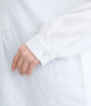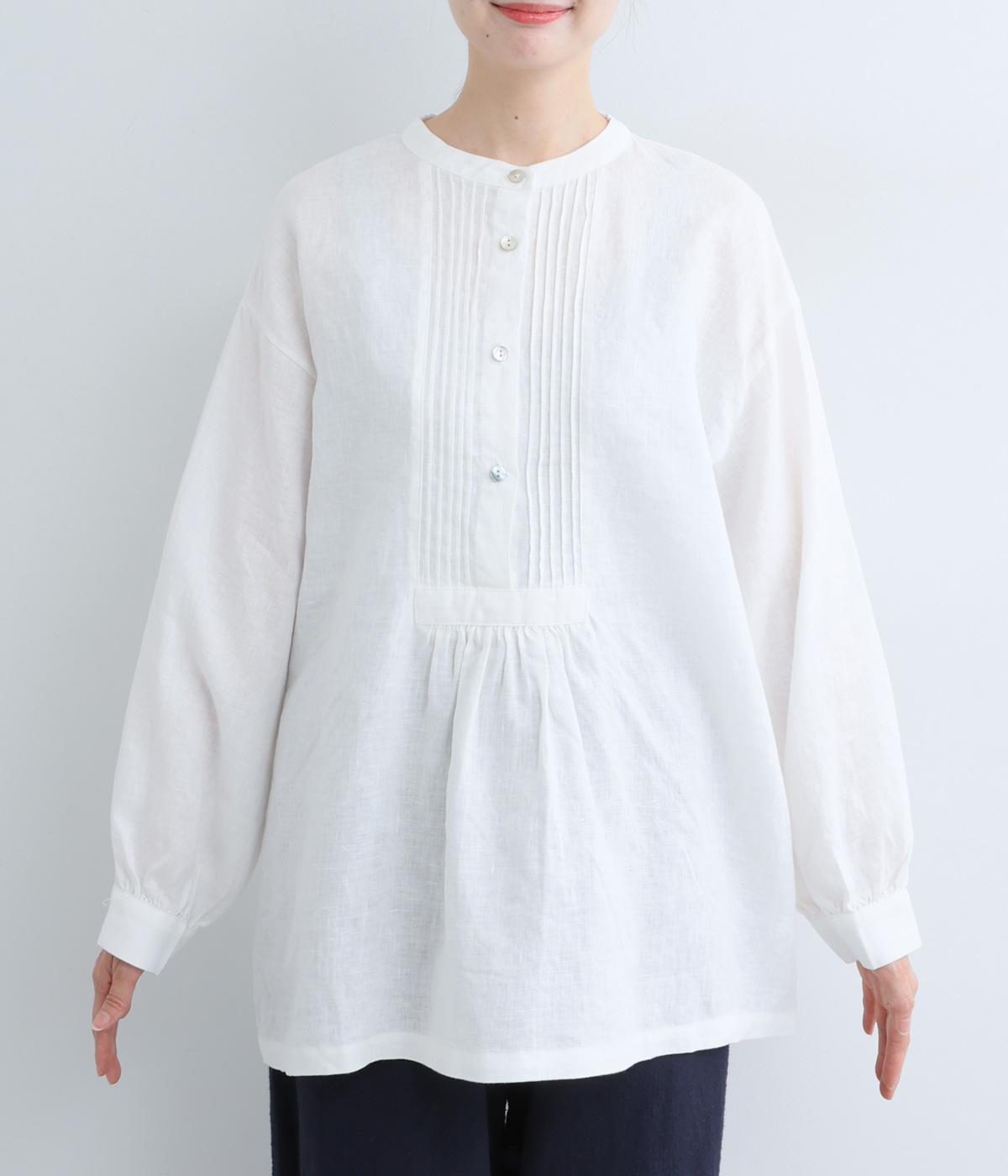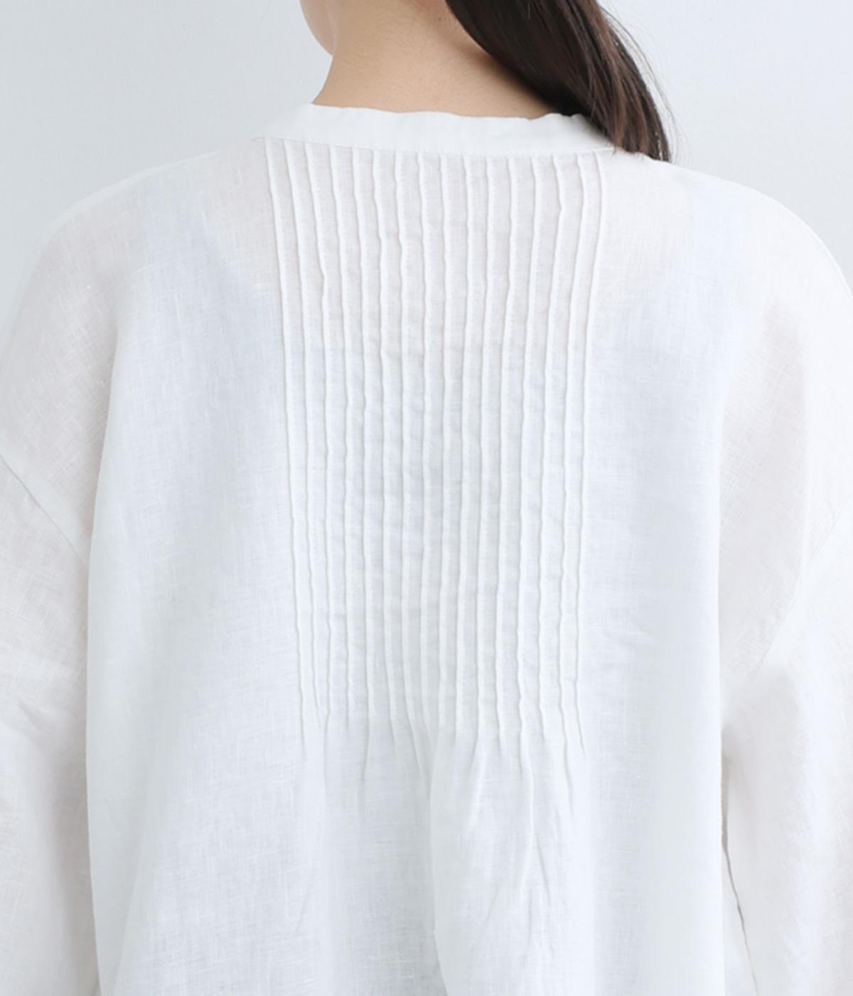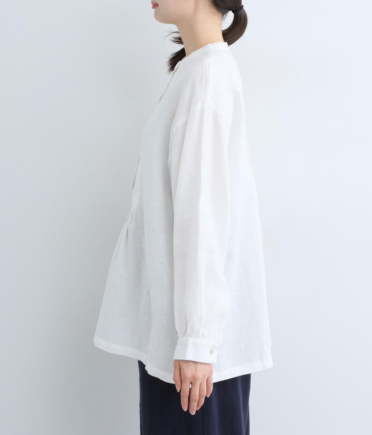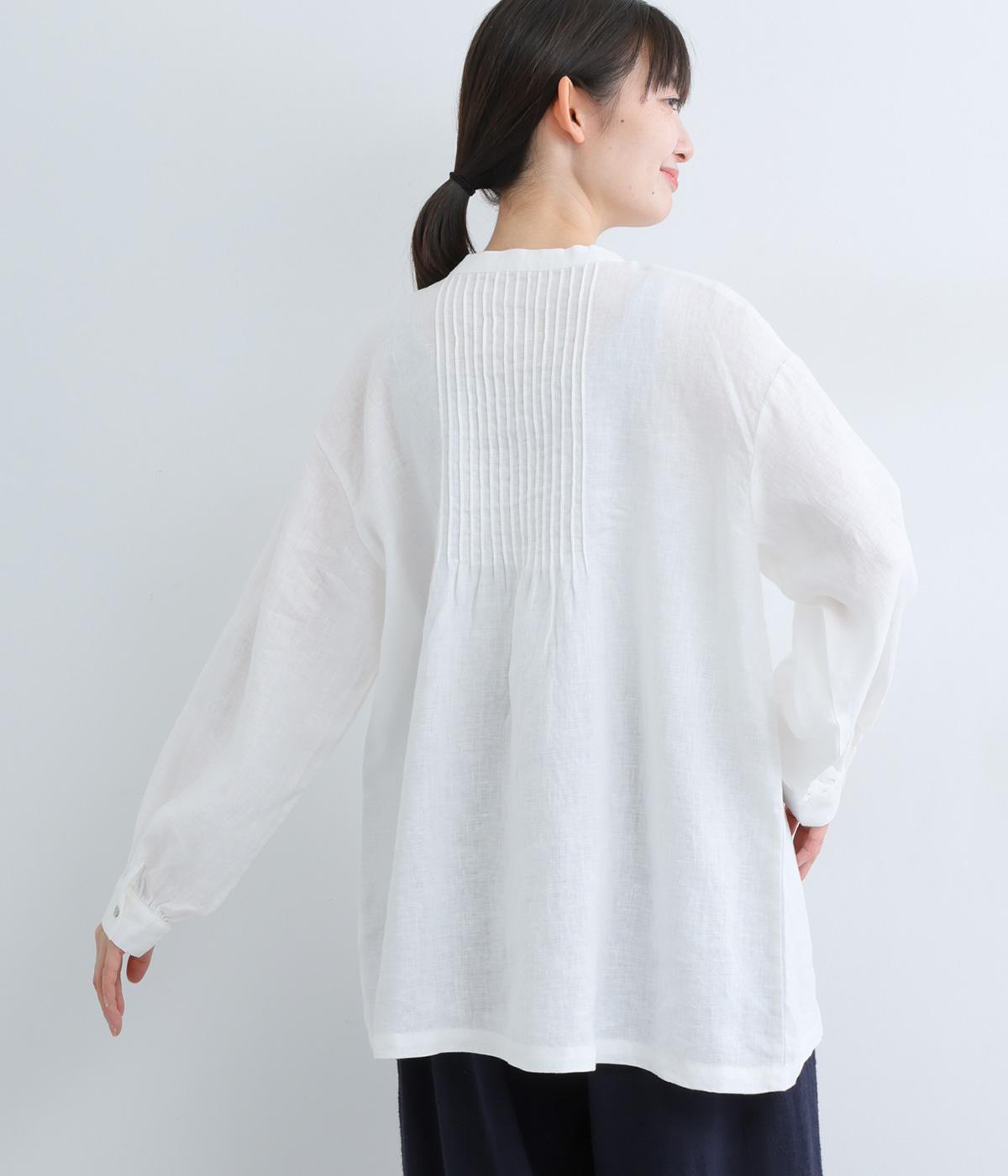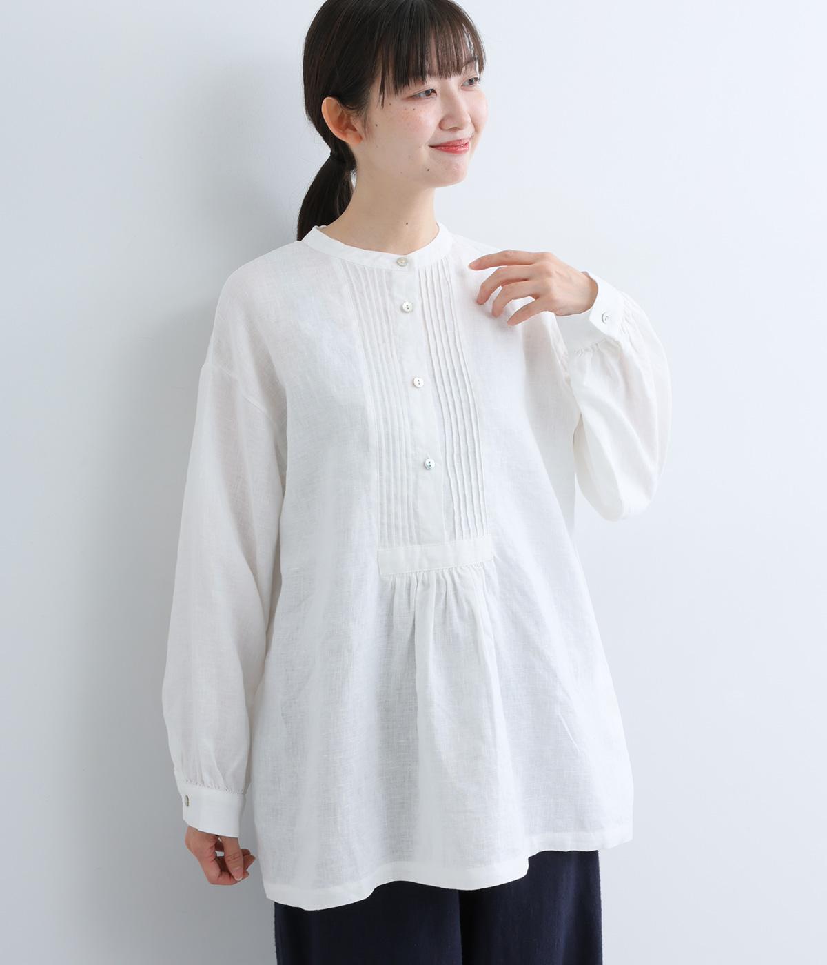 前後にきちんと感のあるピンタックをほどこしたブラウス。高めのウエスト位置からふわりと広がるシルエットが気になるお腹まわりをカバーしつつ、女性らしさをアップしてくれます。ヘンリーネックが視線を上に集め、装いがバランスよく仕上がるのも魅力です。