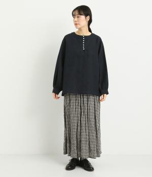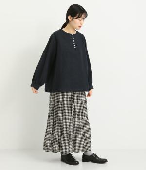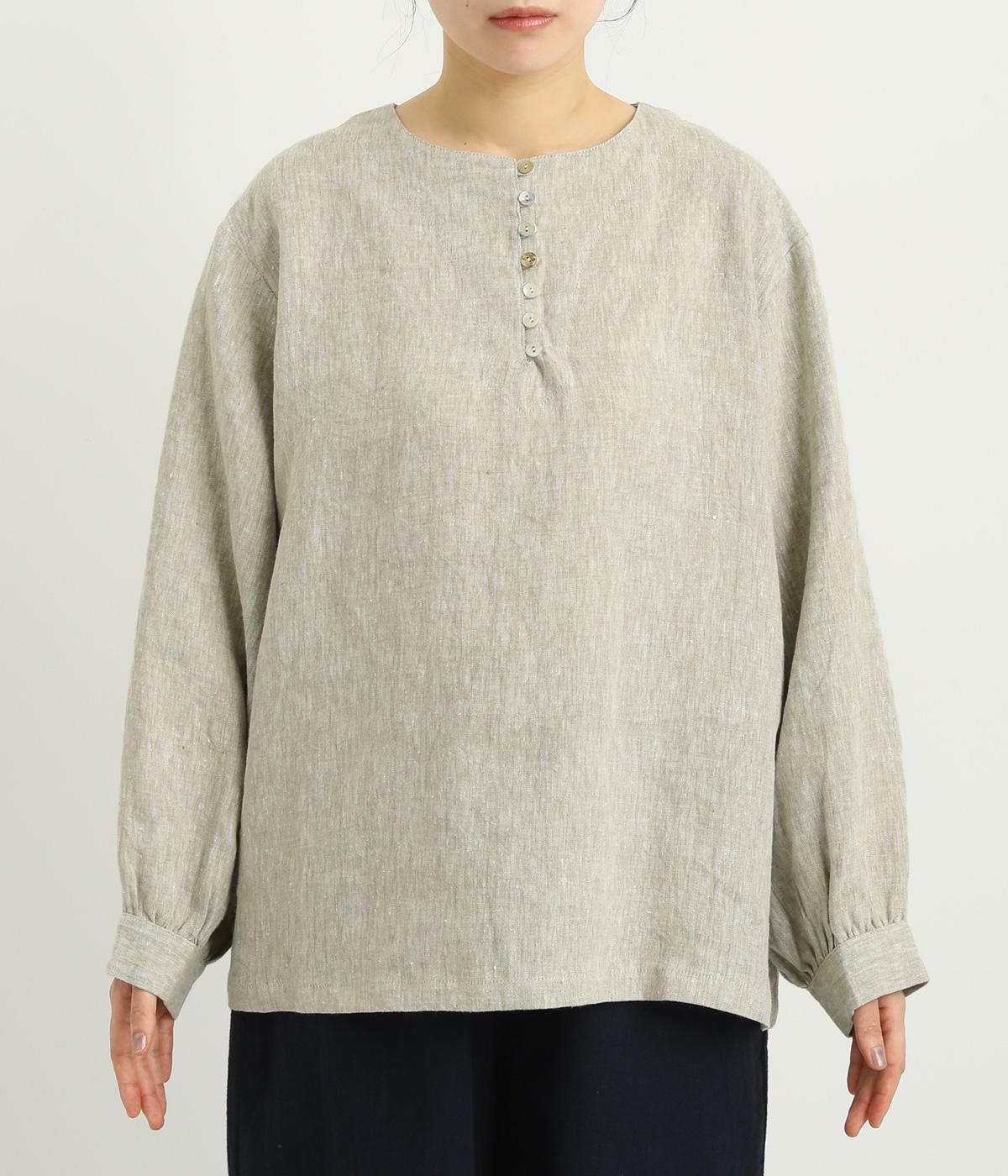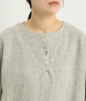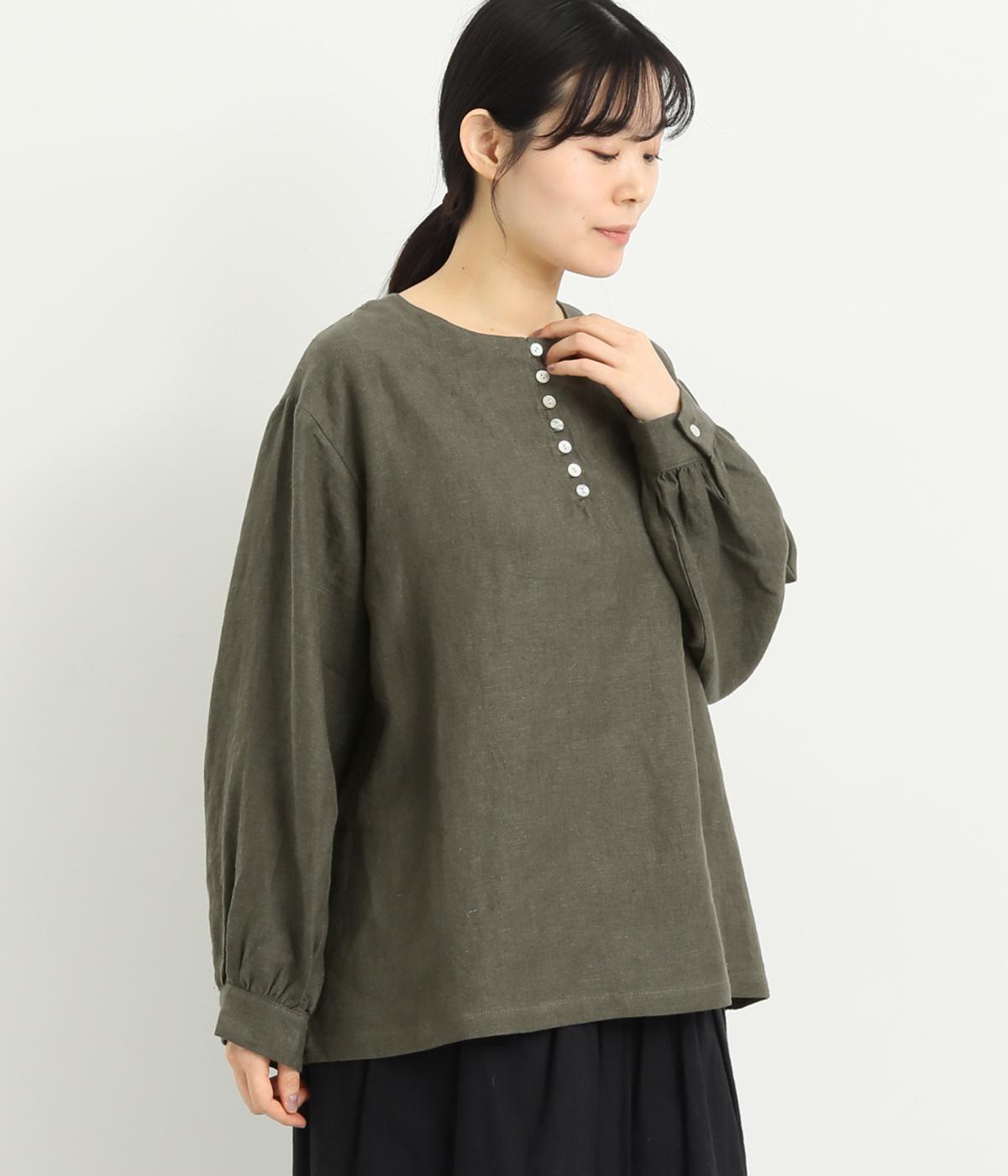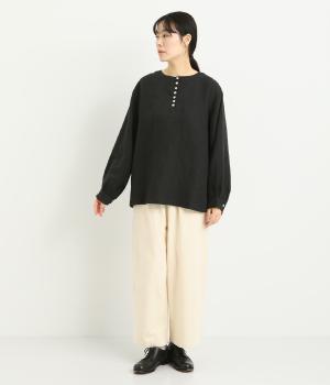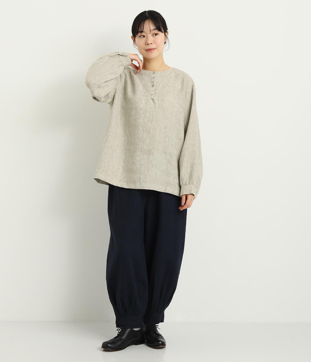 たっぷりとしたボリューム袖にハーフの多ボタン開きが特徴的なブラウス。ゆったりとしていて着心地が良く、シンプルなのでボトム合わせにも困りません。それでいてお洒落心も満たしてくれる優秀な一枚です。