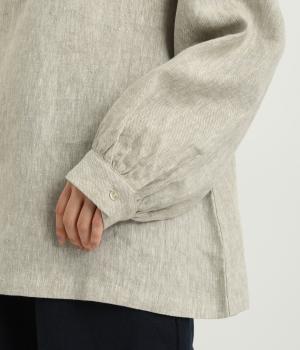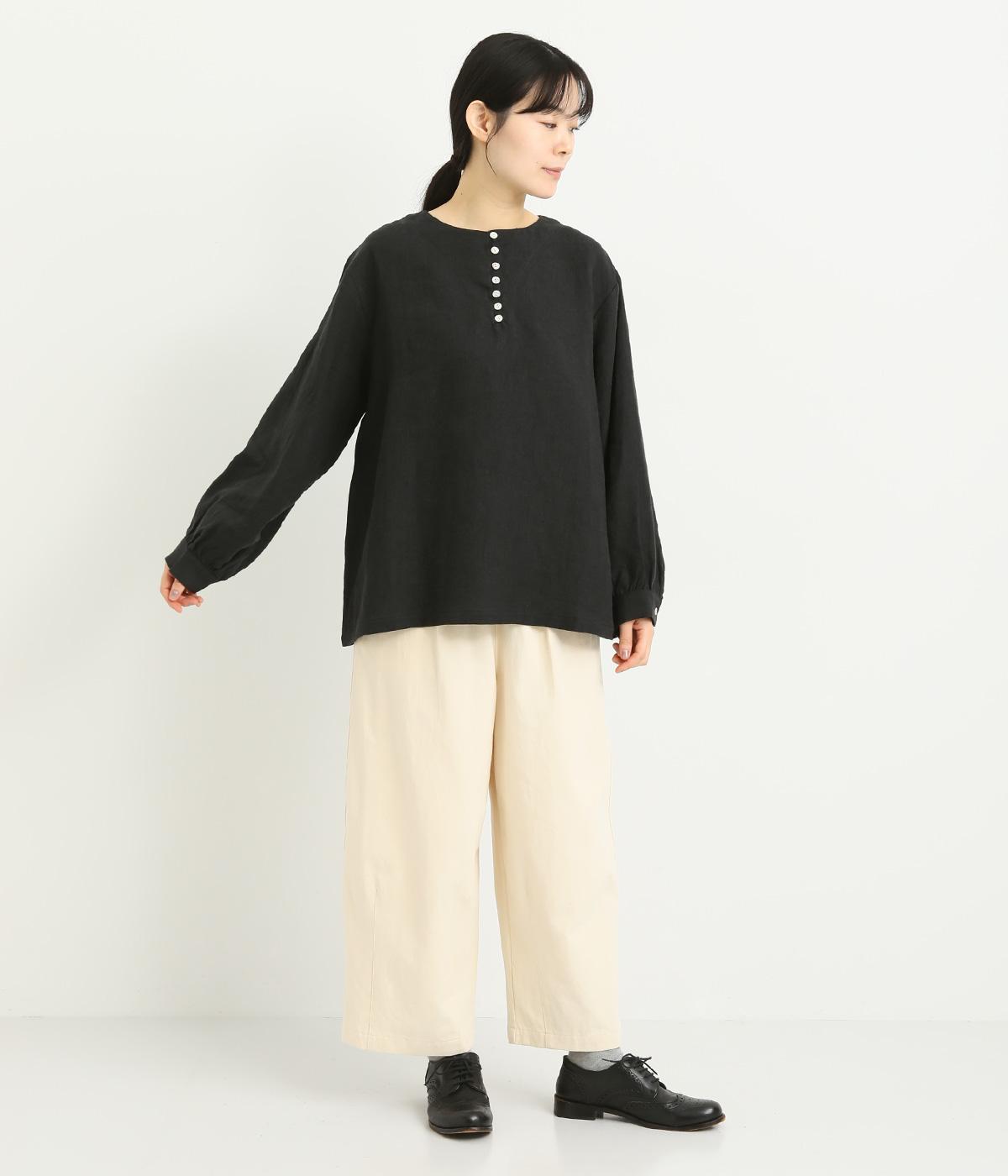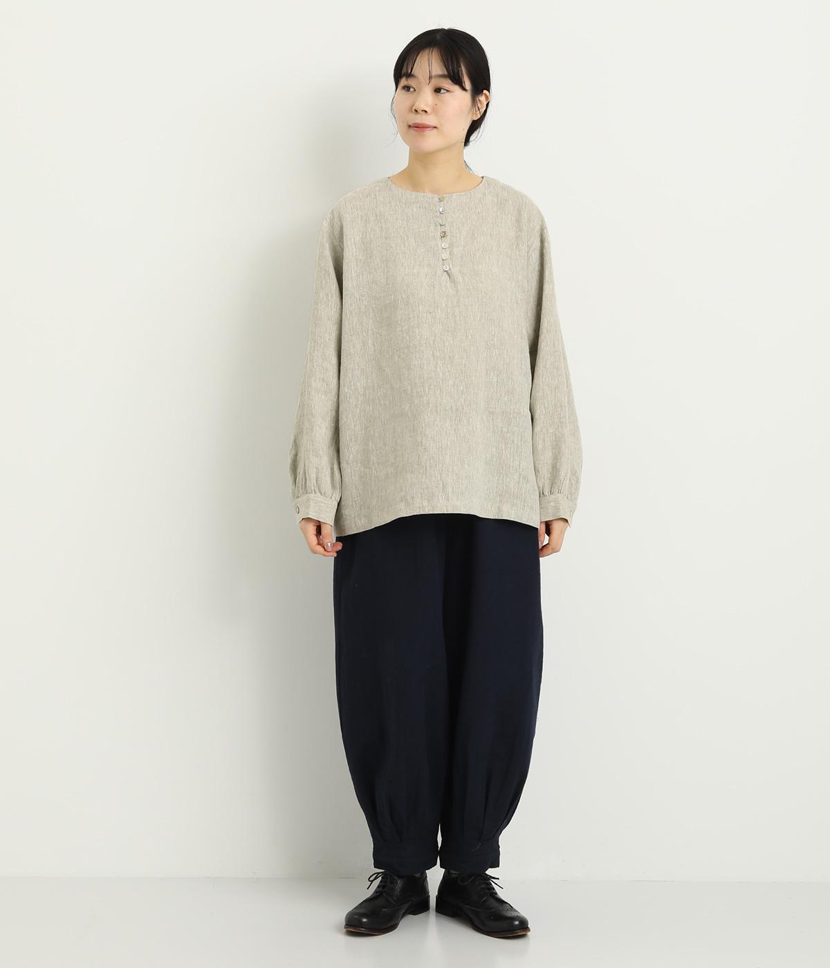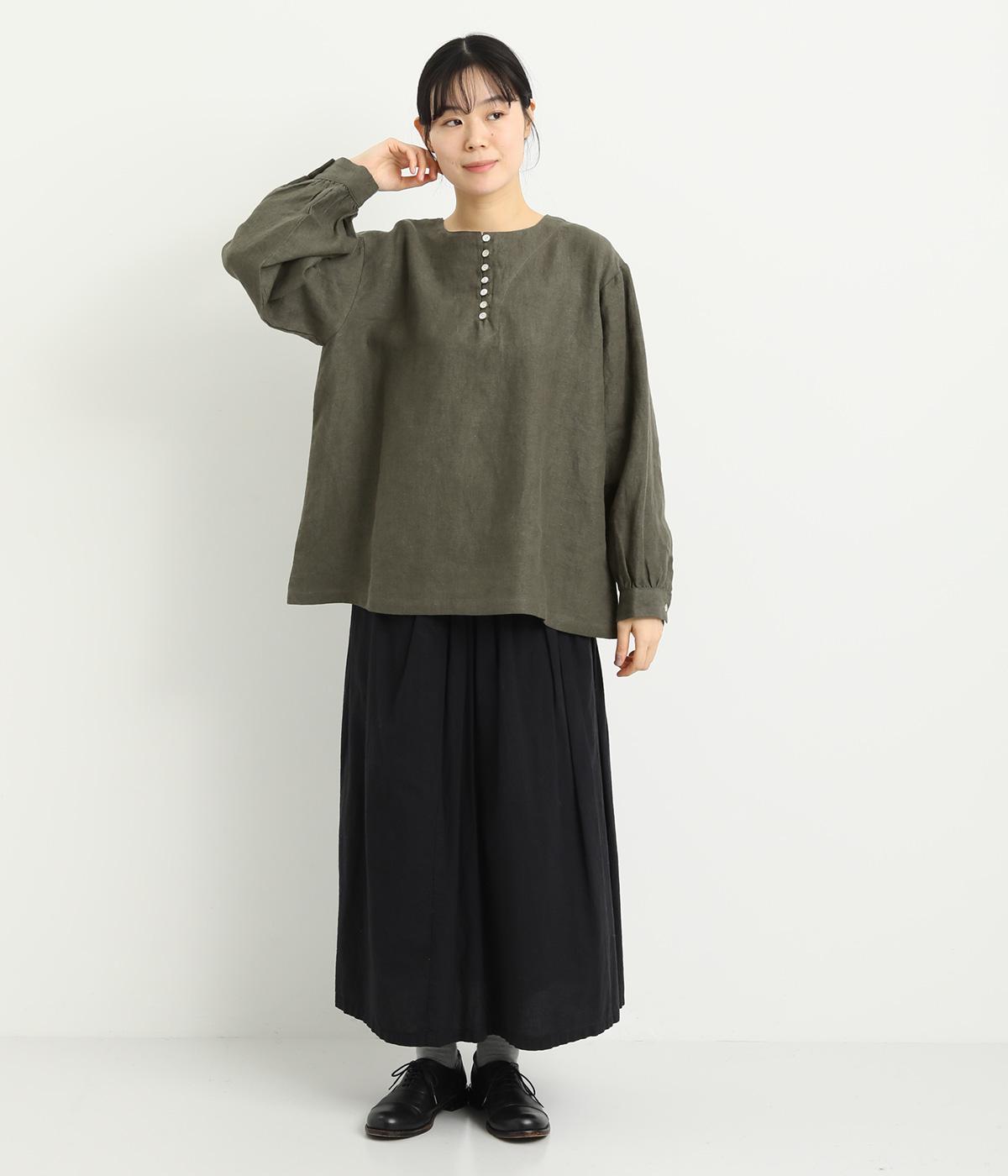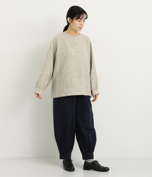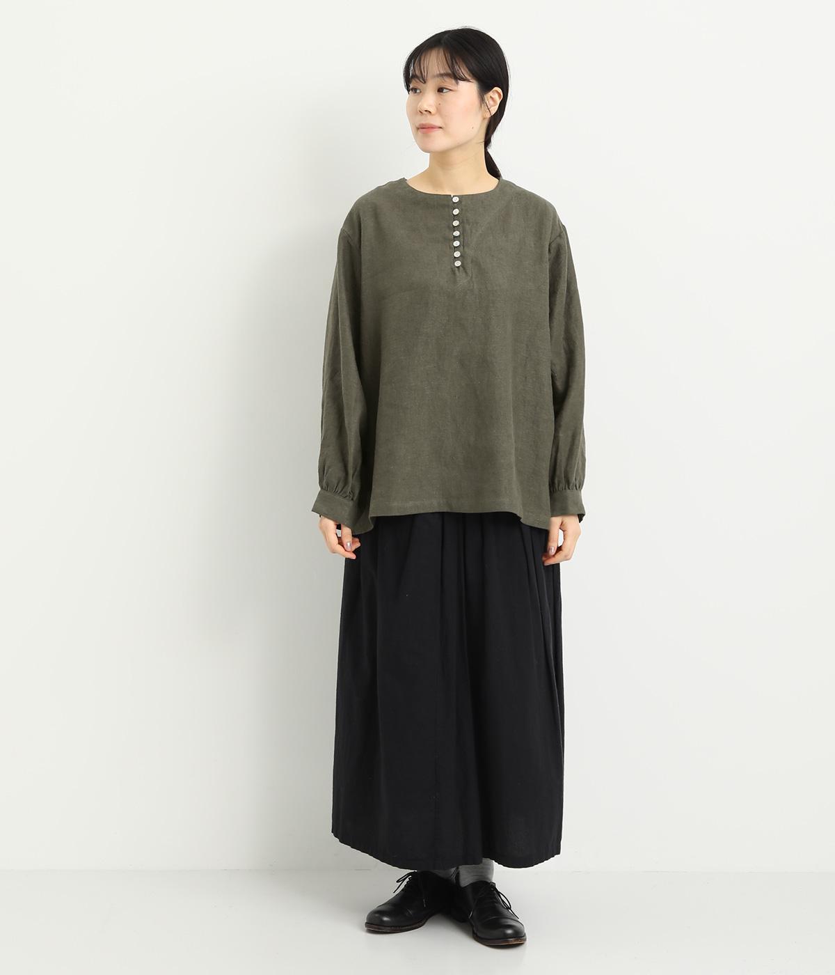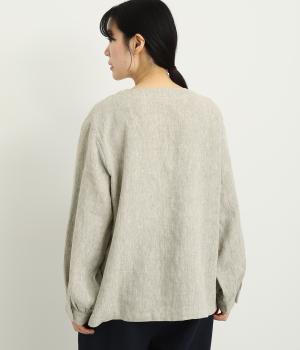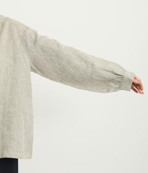 ほどよく厚みがあり、独特のハリ感をあじわえるリネンを使用しました。しっかりとした生地感でロングシーズン着まわしやすく、着るほどになじんでいく経年変化も魅力です。