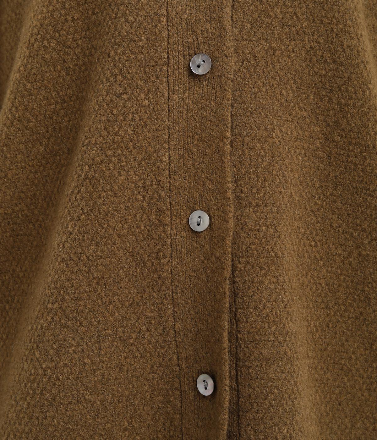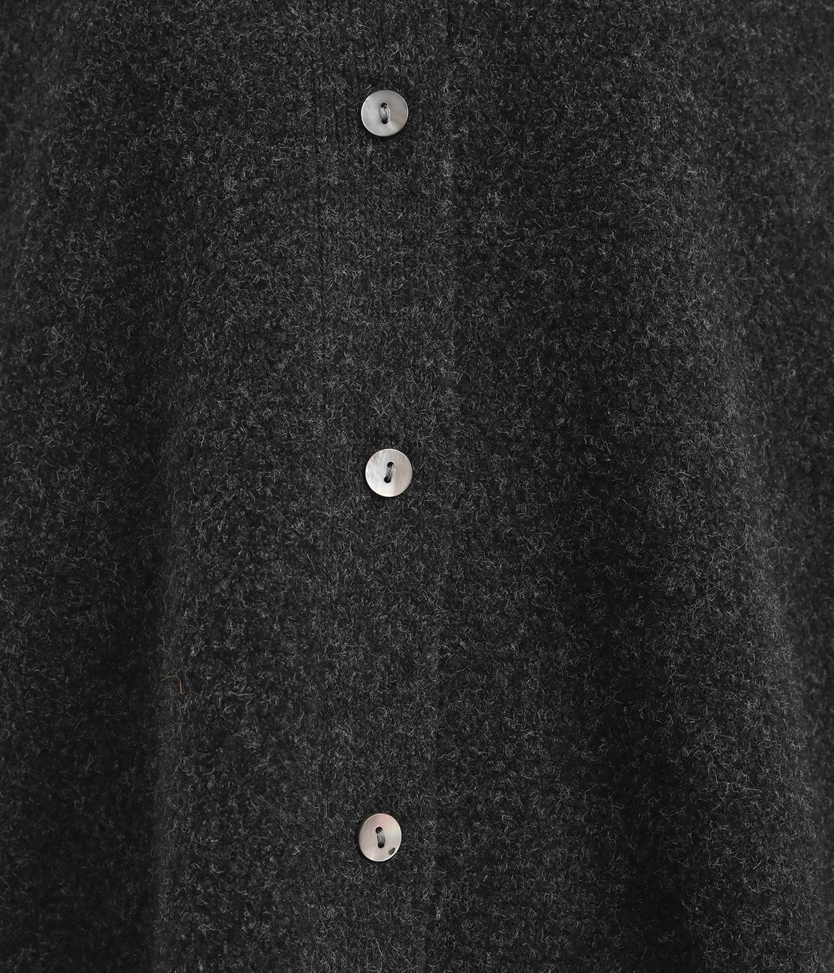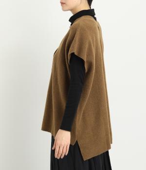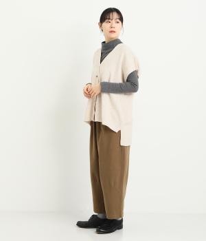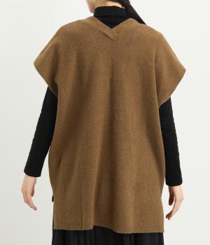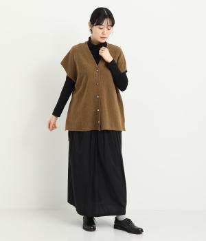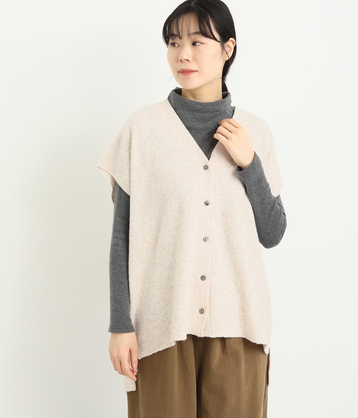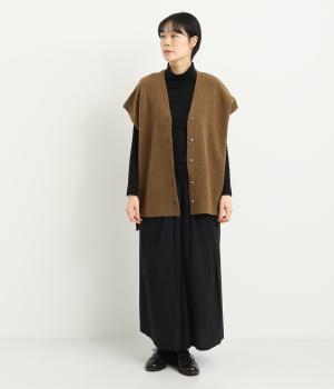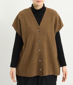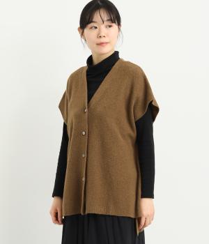 ベスト感覚でレイヤードがたのしめるフレンチスリーブのニットカーディガン。光沢のあるシェルボタンがワンポイントになり、顔まわりはVネックですっきりと。着丈は前後差をつけて横姿もお洒落見えを叶えました。